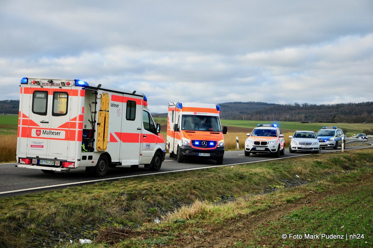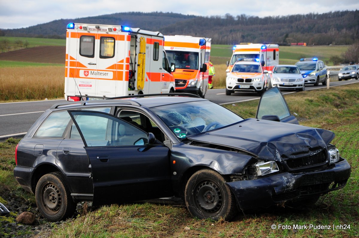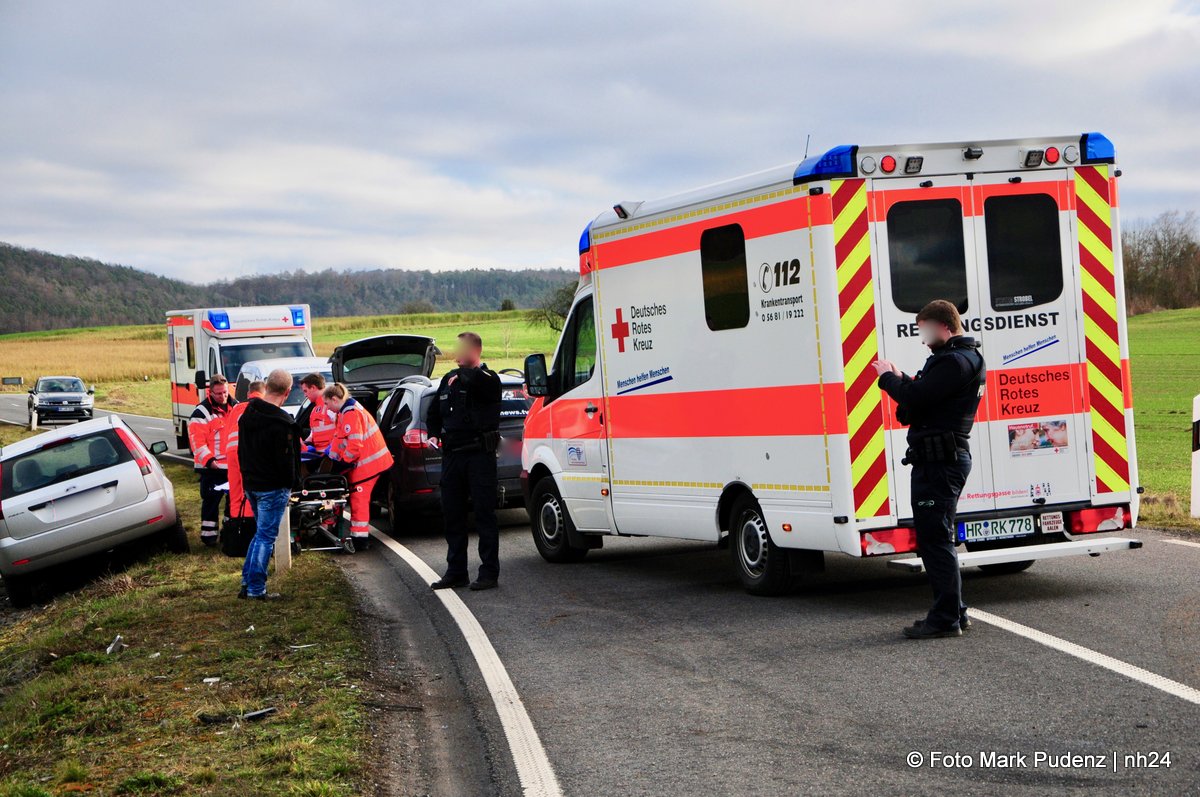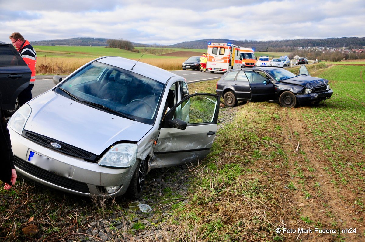 Der Audi-Fahrer schaffte es nicht mehr rechtzeitig sein Fahrzeug zum Stehen zu bringen und krachte der Bad Zwestenerin frontal in die Fahrerseite. Durch den Aufprall wurden die beiden Insassen des Audi schwer verletzt. Die Bad Zwestenerin sowie ihr 20-jähriger Beifahrer wurden bei dem Unfall glücklicherweise nur leicht verletzt. Beide Fahrzeuge wurden durch den Zusammenprall auf einen angrenzenden Acker geschleudert. Ersthelfer kümmerten sich bis zum Eintreffen des Rettungsdienstes um die vier Verletzten.