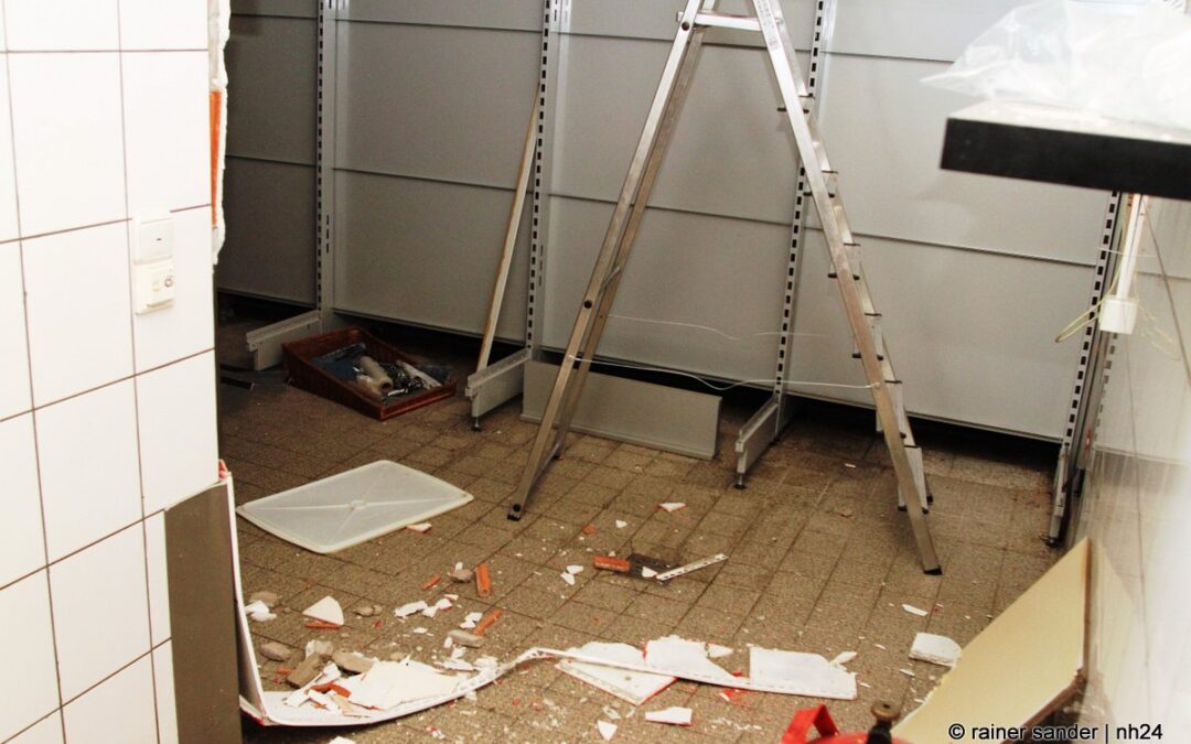 Die rückte auch an und nach der Räumung des Marktes verbreitete sich das Einbruchs-Gerücht schnell in Frielendorf. Es gab aber keinerlei Einbruchsspuren, es fehlte nichts und auch sonst deutete nichts auf ein Verbrechen hin. Also musste es eine andere Ursache geben. Dass Mauerteile in einen Nebenraum gefallen waren, hatte der Inhaber des 23 Jahre alten Supermarktes noch gar nicht bemerkt. Die Tür in den Nebenraum lässt sich allerdings durch herabgefallene Steine auch gar nicht mehr öffnen. Aus zunächst ungeklärter Ursache ist über Nacht eine Wand eingestürzt und hat dabei Teile der Deckenverkleidung beschädigt, die dann herabgefallen sind.