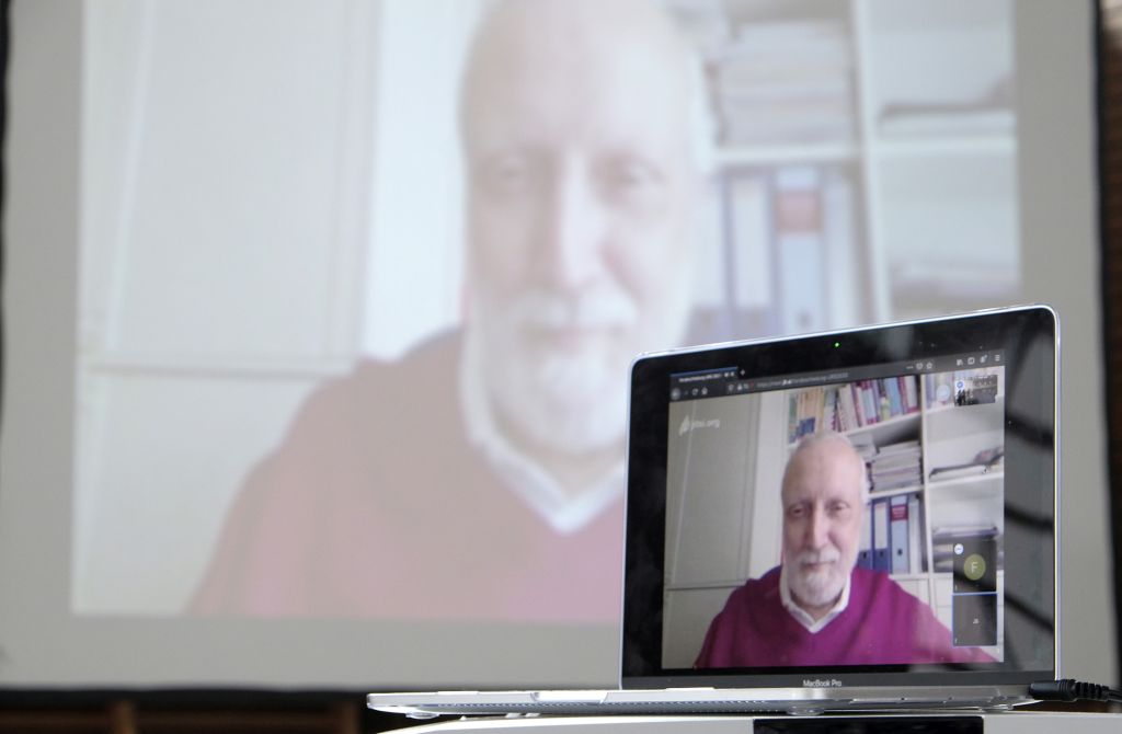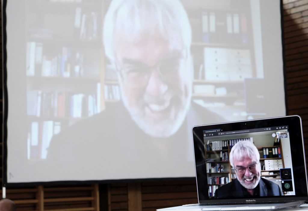 In ihrer Abschiedsrede bedankte sich Schulleiterin Jutta Ramisch bei Jürgen Salfer und Franz Spahn, die per Videokonferenz zugeschaltet wurden und auf einer großen Leinwand für ihre Kollegen zu sehen waren.