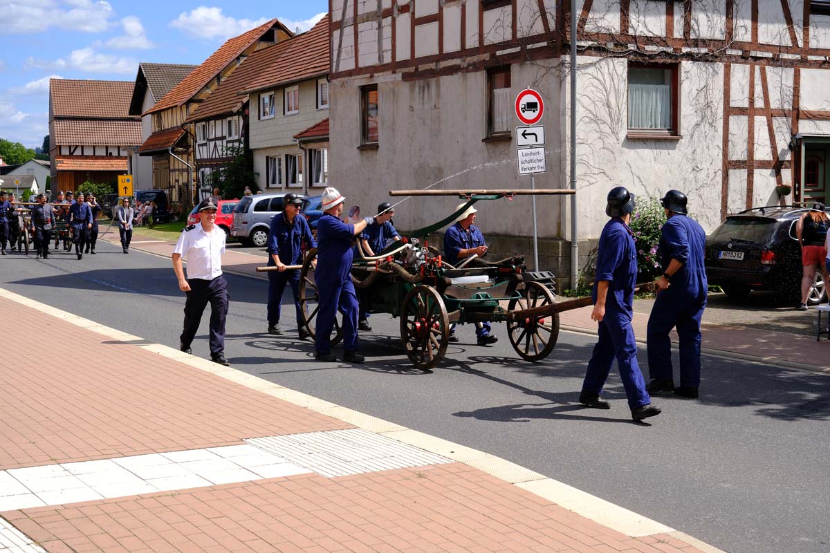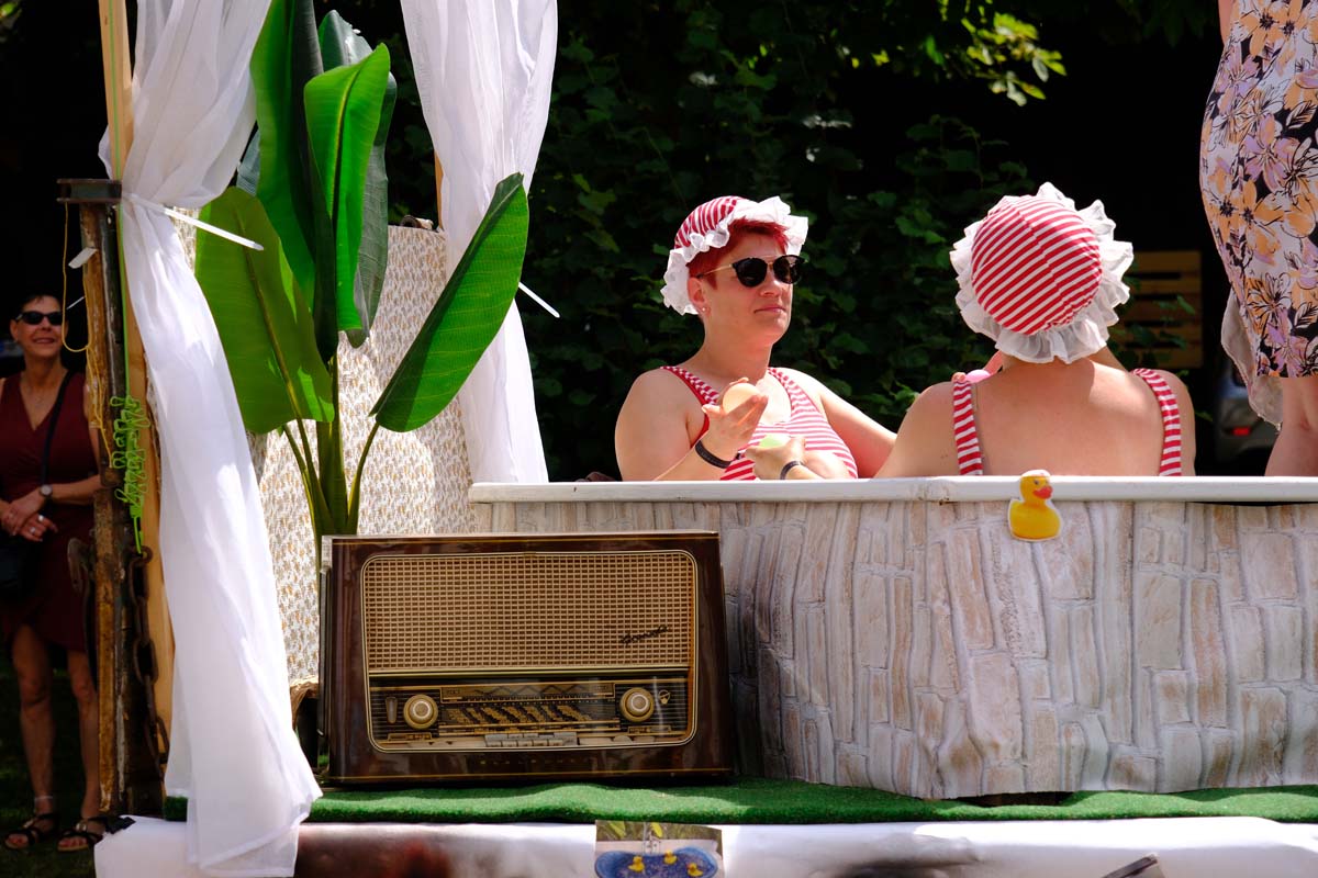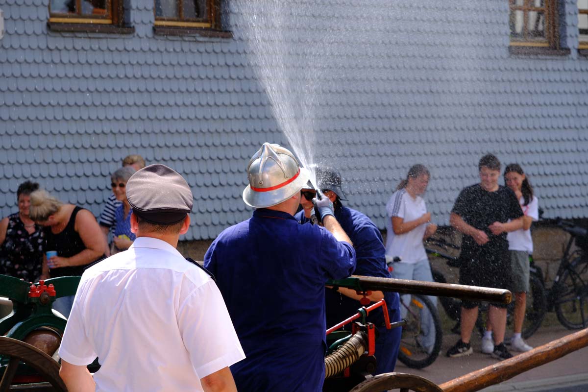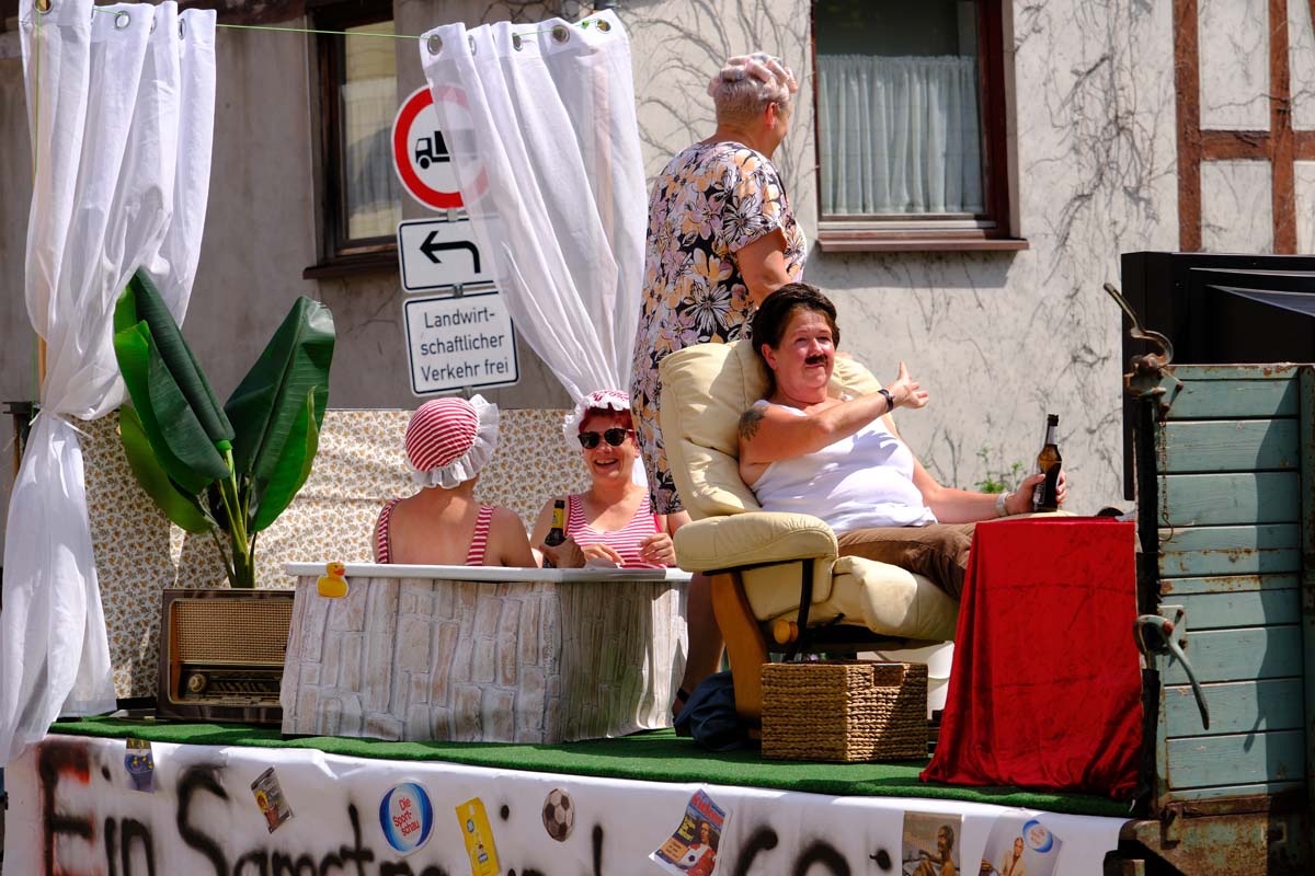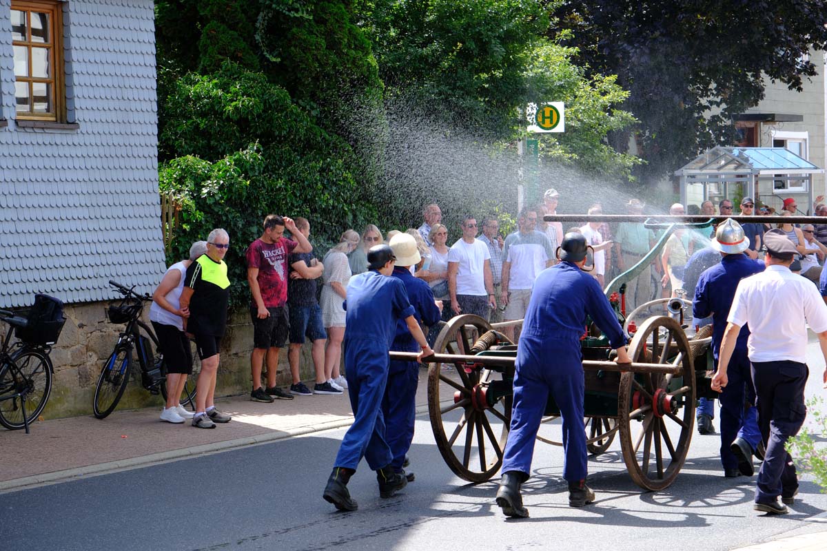 Bei hochsommerlichen Temperaturen suchten sich die Zuschauer entlang der Straßen schattige Plätze, um den Umzug in vollen Zügen genießen zu können. Für Abkühlung sorgte die Feuerwehr, die die Zuschauer mit Wasser bespritzte. (wal)