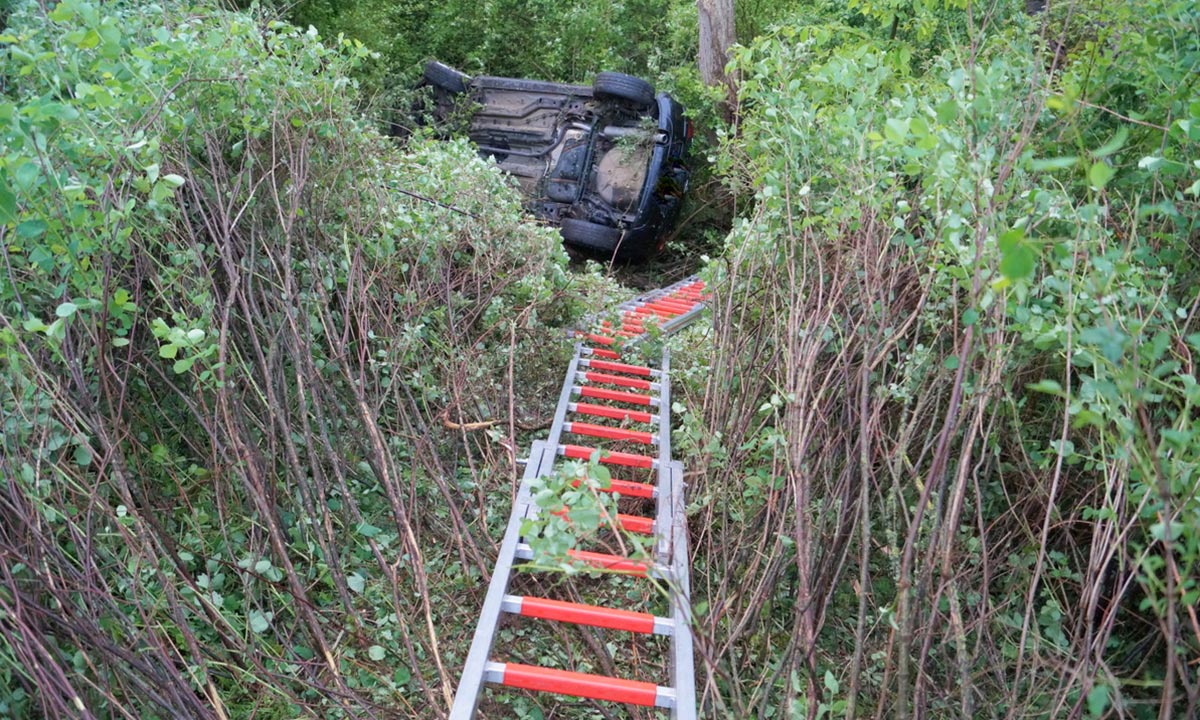 Feuerwehrleute und Helfer des Rettungsdienstes befreiten sie anschließend schonend aus dem Unfallwrack. Zuvor mussten sich die Rettungskräfte in dem steilen Gelände mittels Steckleiterteile Zugang zum verunfallten Pkw schaffen.