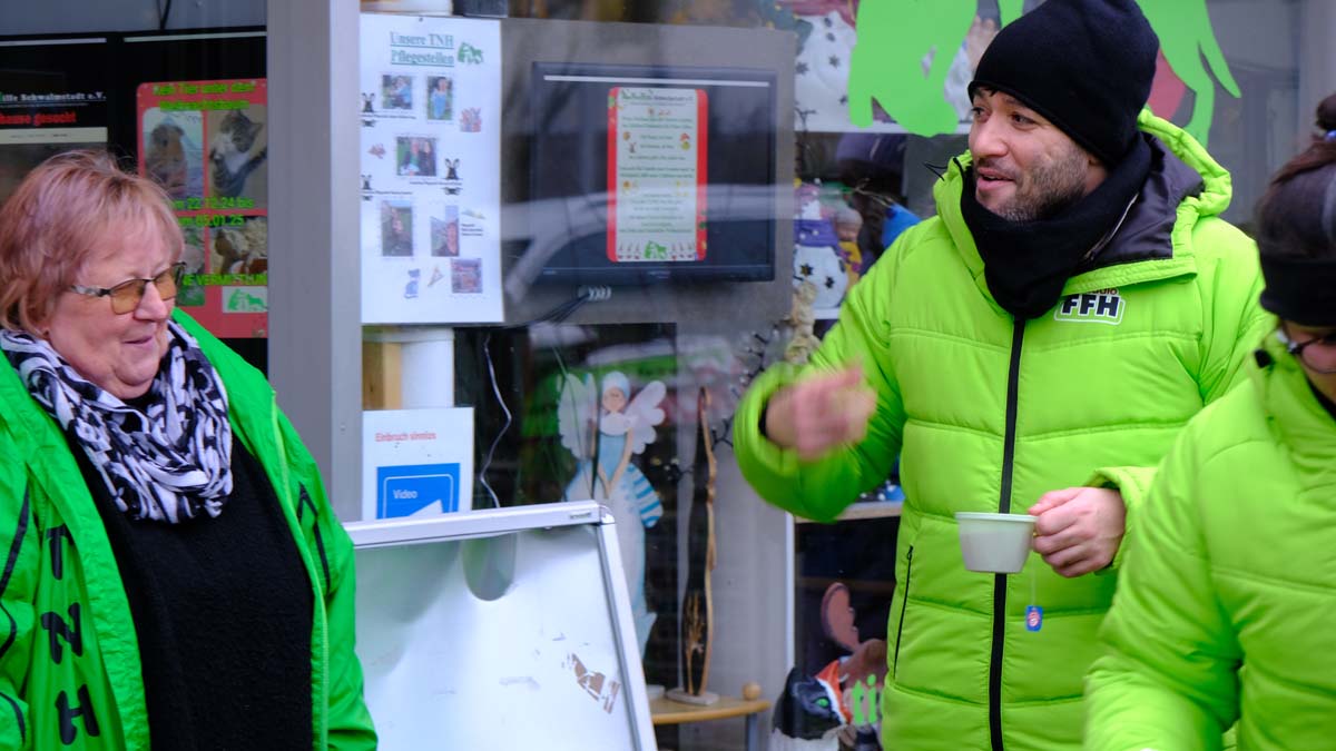 Am Dienstagmittag machte Granitzny mit seiner akkubetriebenen Rikscha Halt bei der Tiernothilfe Schwalmstadt in der Hessenallee. Begrüßt wurde er von Petra Ziegert-Postleb, weiteren Mitarbeitern der Organisation, einer Klasse des Berufsschulcampus Schwalmstadt und Bürgermeister Tobias Kreuter. Im Rahmen des Besuchs spendete HIT RADIO FFH Produkte im Wert von 50 Euro, die Granitzny vor Ort erwarb. Diese kommen bedürftigen Tierhaltern zugute. Auch die Schüler des Berufsschulcampus Schwalmstadt beteiligten sich und füllten die Spendenbox des Radiosenders.