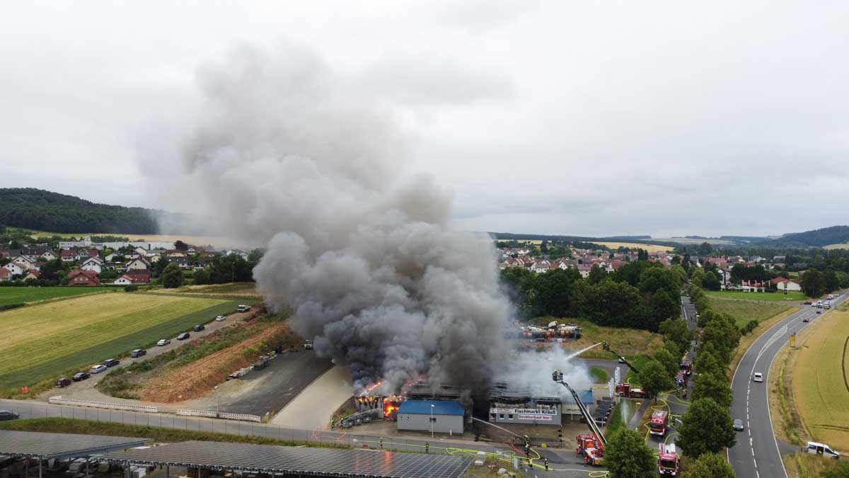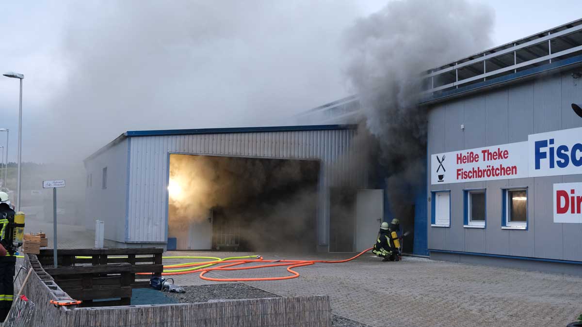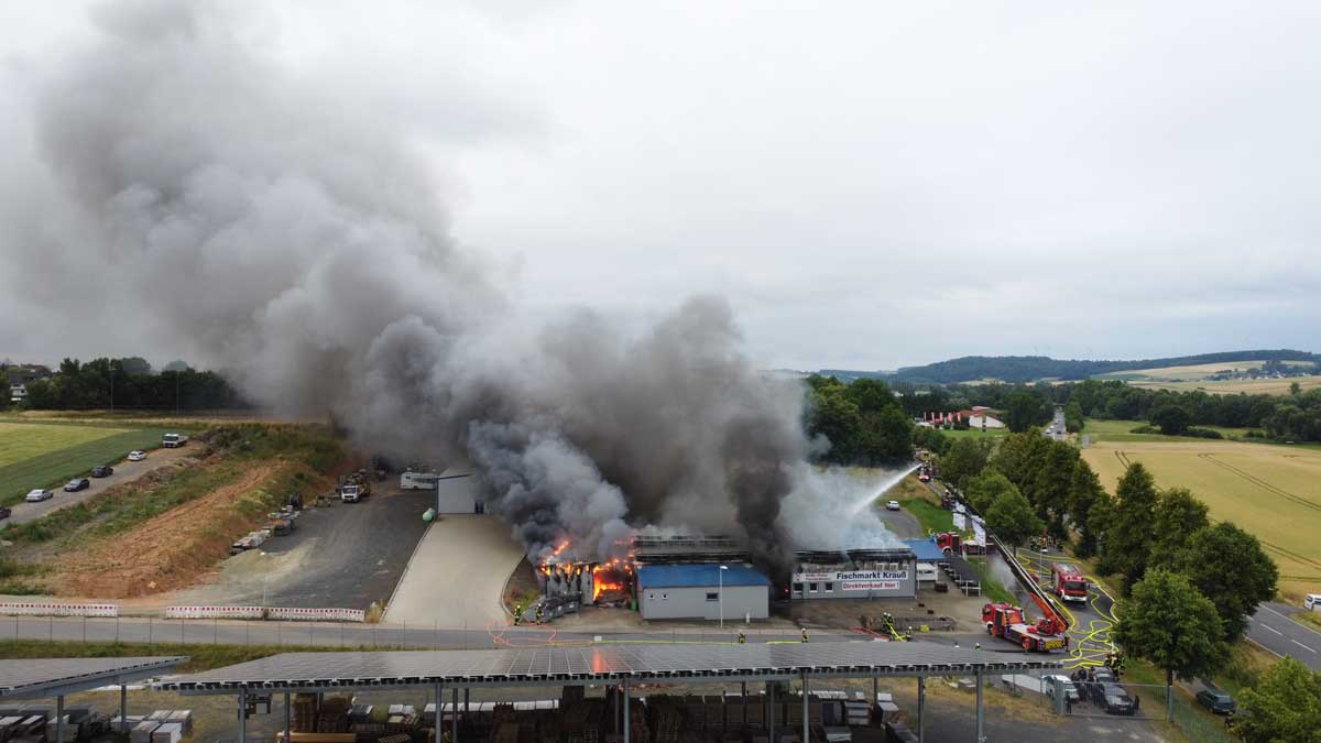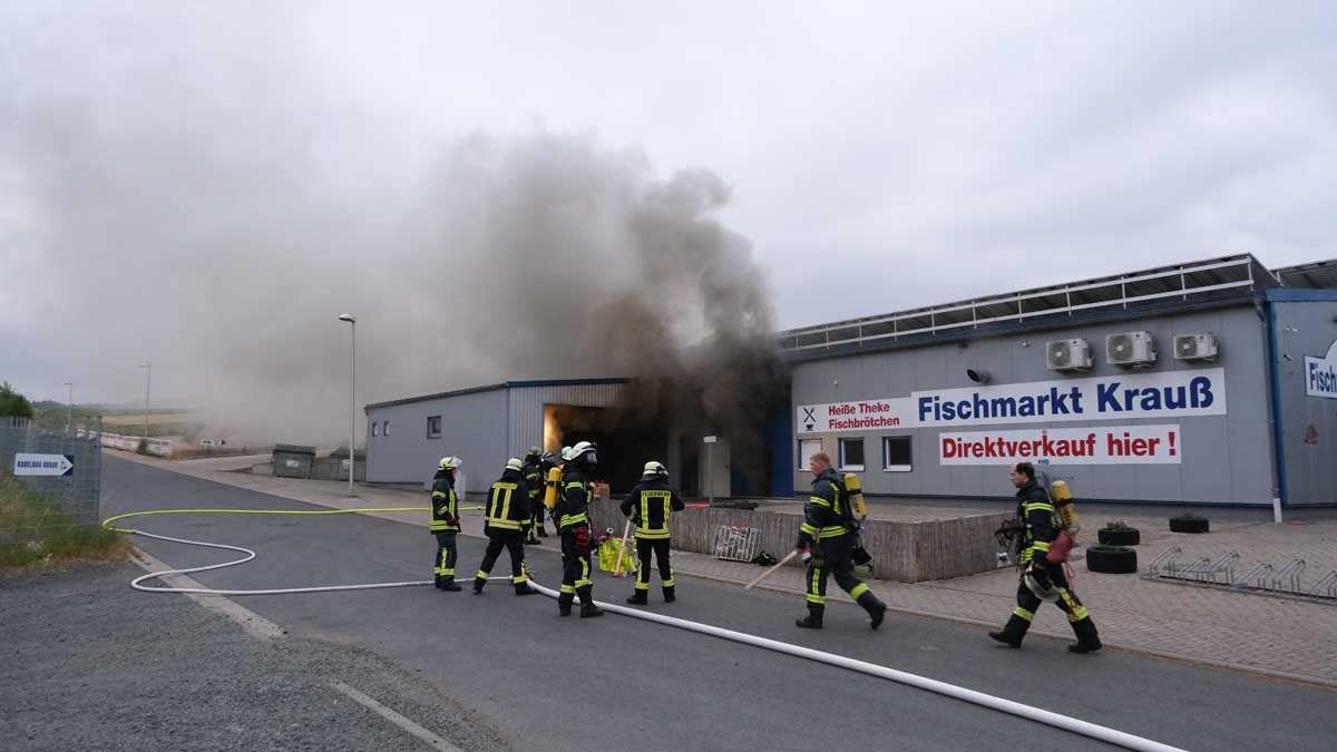 SCHRECKSBACH. Seit Donnerstagmorgen steht das Betriebsgebäude des Fischmarkts Krauß an der Bundesstraße 254 in Schrecksbach (Schwalm-Eder-Kreis) in Flammen. Auch mehrere Verkaufsfahrzeuge des Unternehmens, die sich in dem Gebäude befanden, wurden durch das Feuer vollständig zerstört.