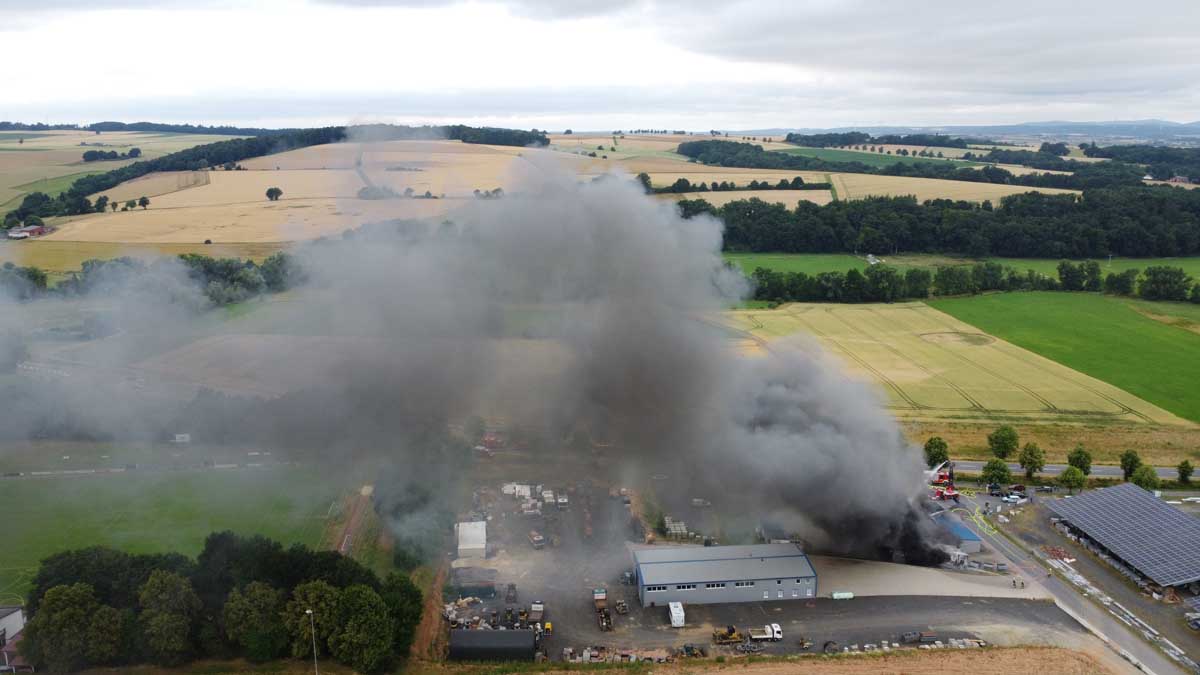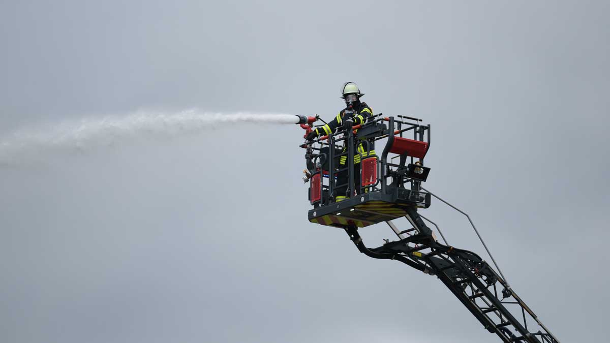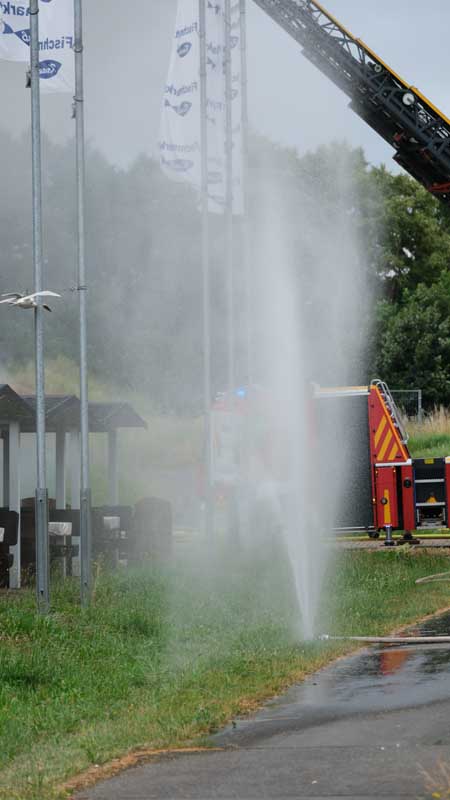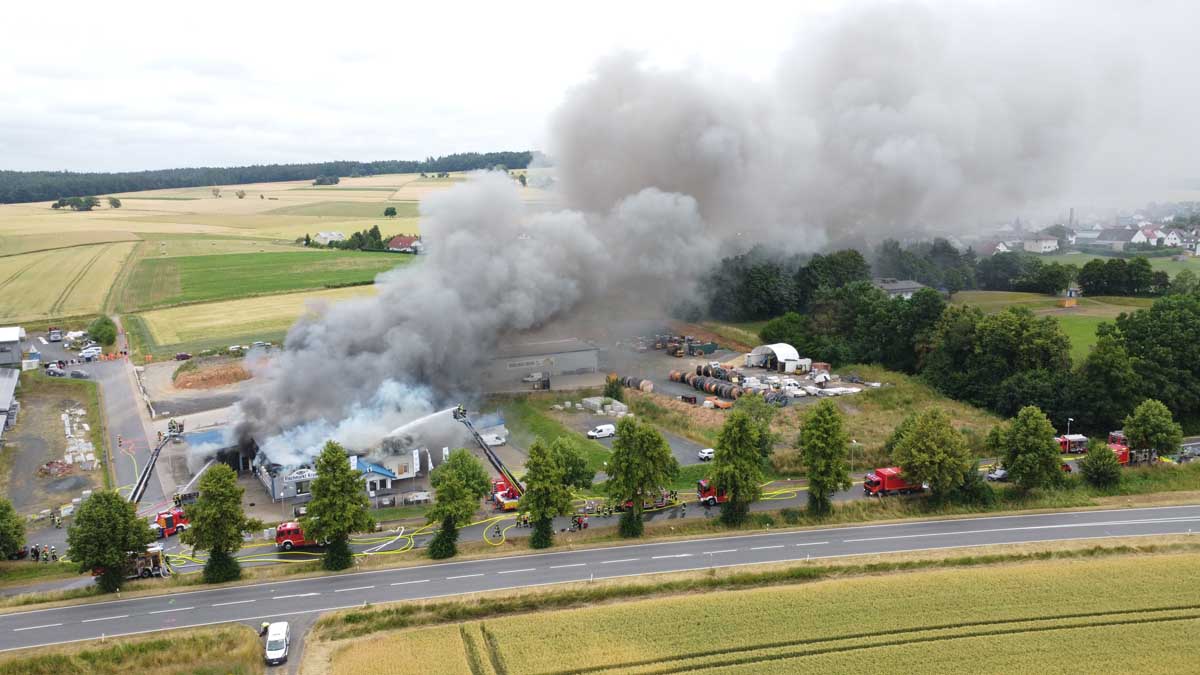 Vorsorglich hatte Einsatzleiter Daniel Platte bereits zuvor eine lange Schlauchleitung zur Wasserversorgung von der Schwalm über die B 254 legen lassen – eine Maßnahme, die sich im weiteren Verlauf als entscheidend erwies. Platte ließ zusätzlich eine zweite Drehleiter aus Schwalmstadt nachalarmieren. Die Feuerwehr Neukirchen war bereits mit ihrer Drehleiter vor Ort. Von beiden Geräten aus konnte die Brandbekämpfung aus der Luft fortgesetzt werden.