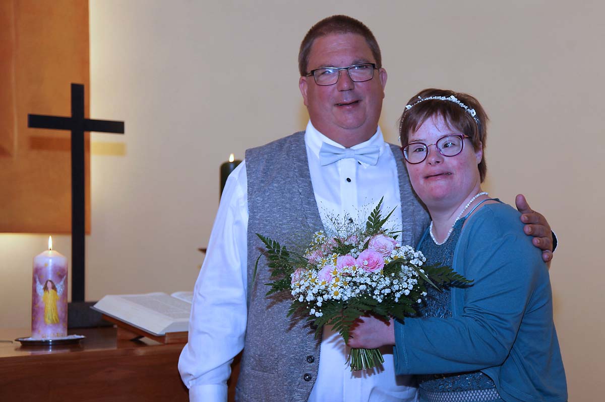 Die Segnung ihrer Partnerschaft übernahm Hephata-Pfarrerin Annette Hestermann am 2. September 2023 in der Hephata-Kirche. „Ich habe ein blaues Kleid angehabt“, erinnert sich Anna. „Und ich ein weißes Hemd“, ergänzt Alex. Seitdem empfinden sie sich als verheiratet. Anna wohnt im Haus Jubilate auf dem Hephata-Gelände, Alex im Betreuten Wohnen in Treysa. Bald wollen sie zusammenziehen.