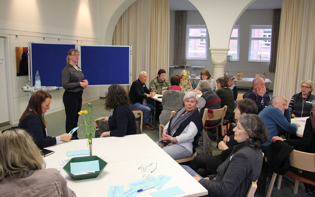 In einem zweiten Workshop stellten sich die Teilnehmer die Frage, vor welchen zukünftigen Herausforderungen sie stehen. Ein wichtiger Punkt sei der Bildungsweg, der die Menschen vom Kleinkindalter bis ins Erwachsenenleben begleite. Die Idee, Patenschaften für geflüchtete Menschen zu übernehmen, stieß auf Zuspruch. „Beispielsweise ist es denkbar, dass Ruheständler junge Menschen während ihrer Ausbildung begleiten, oder ‚Schüler helfen Schülern‘“, erklärte Sonja Müller. Vor allem kleinteilige Hilfen seien notwendig und hilfreich, wie etwa in Form eines Lerntreffs – dieses Format gibt es bereits an der Schule im Ostergrund in Kooperation mit der landeskirchlichen Gemeinschaft. Dort bieten Ehrenamtler einmal pro Woche Hilfe bei den Hausaufgaben an, „nicht nur für Geflüchtete, sondern für alle als offener Lerntreff“, regte Müller an. Wer sich ehrenamtlich im Lerntreff engagieren möchte, sei herzlich willkommen. Ebenfalls in Planung sei ein Spieltreff in der Gemeinschaftsunterkunft für Frauen, denn es stünden nicht genügend Kindergartenplätze zur Verfügung, „und Alternativangebote gibt es keine“, sagte Sonja Müller.