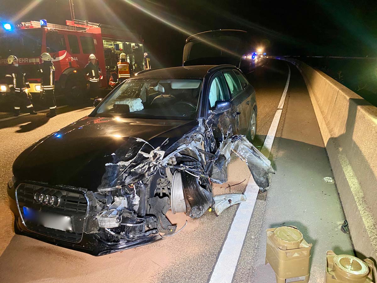 Ein Fahrzeug kollidierte im Überholvorgang mehrfach mit der Mittelleitplanke, überschlug sich und kam auf dem Dach liegend zum Stillstand. Ein Fahrzeug krachte in die Unfallstelle, ein weiteres fuhr über Trümmerteile.