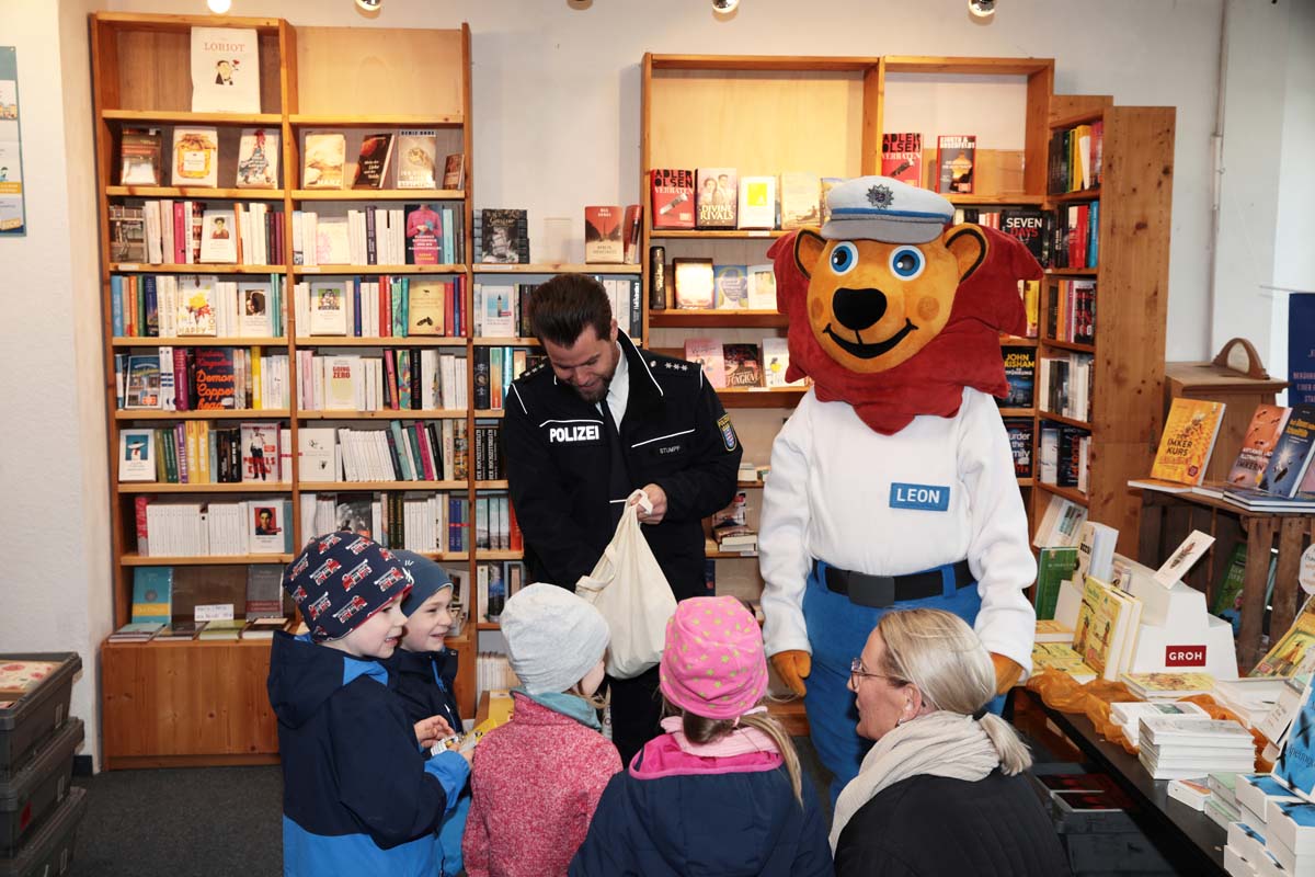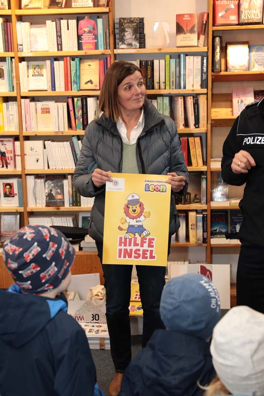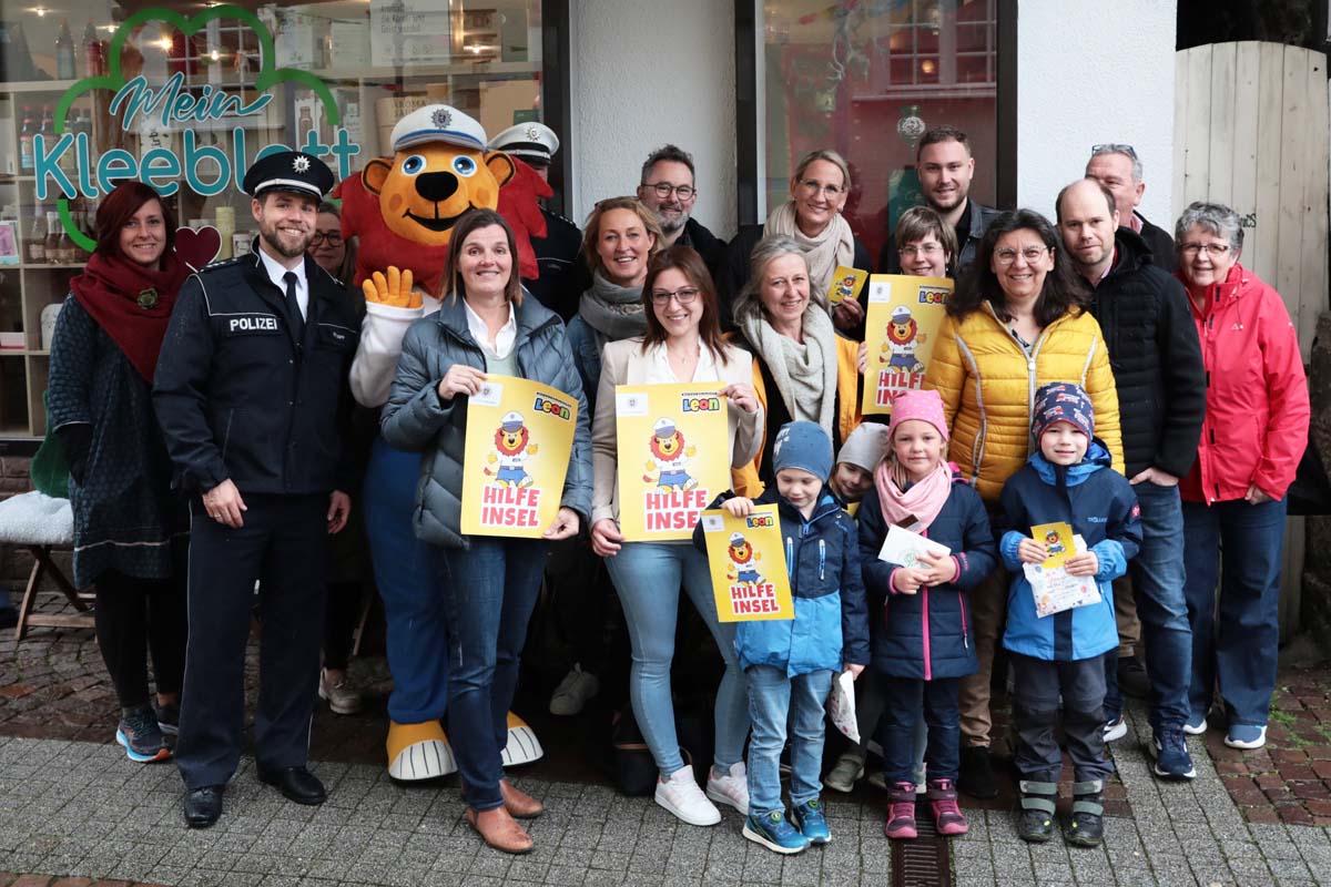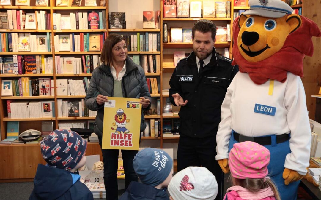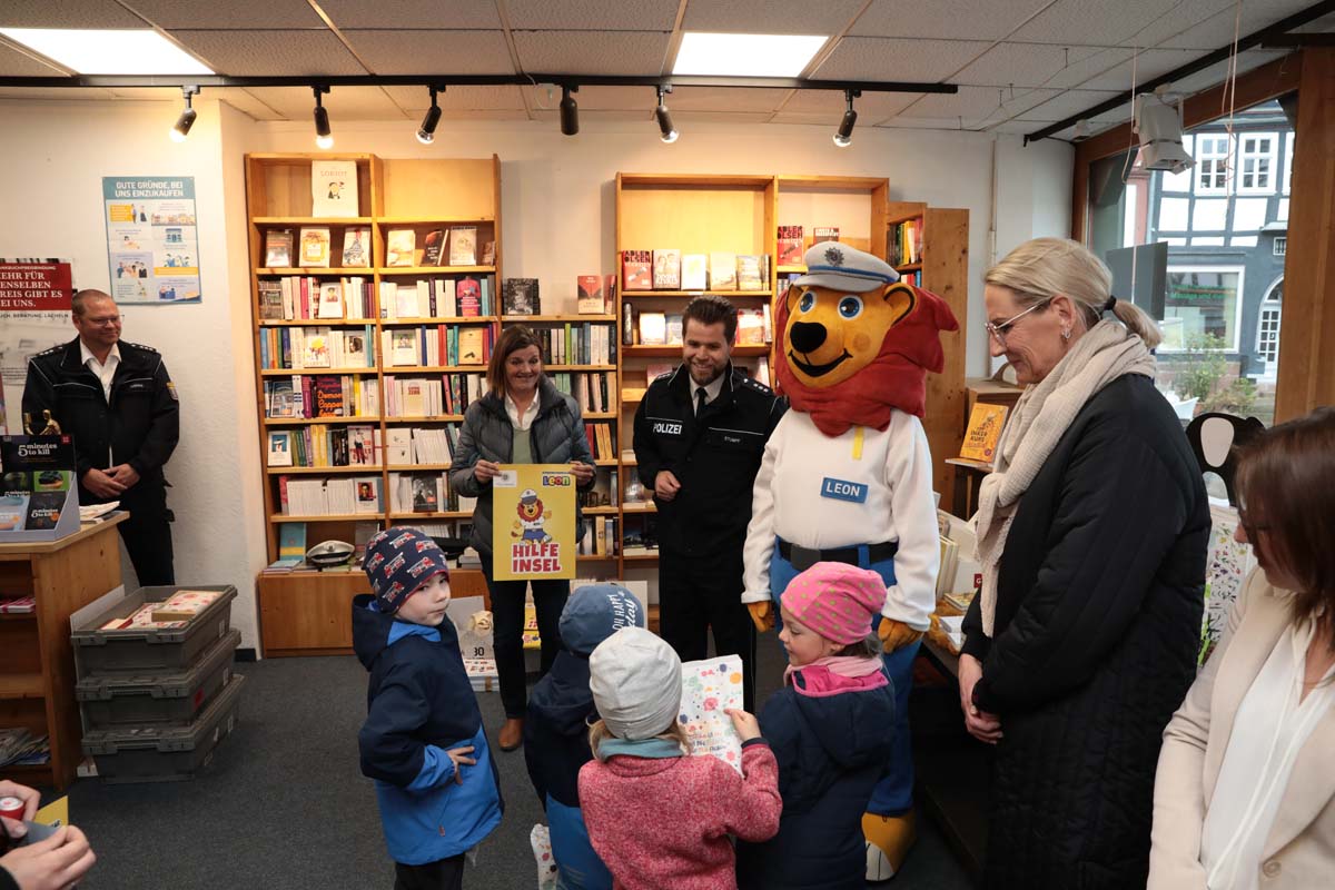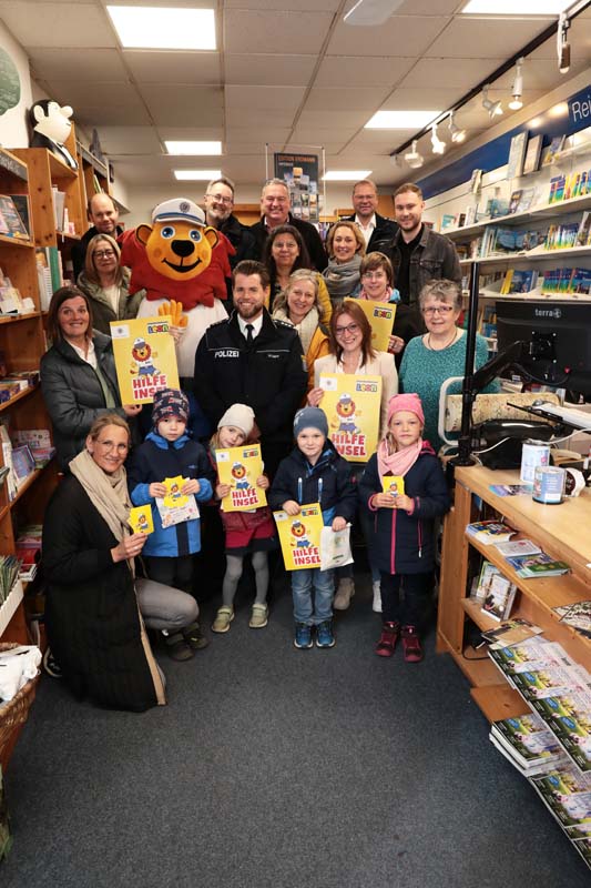 Noch mehr Kinder und Eltern sollen auf die Hilfe-Inseln aufmerksam werden, wünschen sich Stumpf und Ebel anlässlich der Projekterweiterung gemeinsam mit den teilnehmenden Geschäftsleuten am Dienstag in der Dombuchhandlung am Marktplatz. Martin Stumpf und sein „Kollege Leon“ der Löwe von der Polizei wiesen außerdem gleich eine Gruppe von Kindern aus dem Kindergarten Regenbogenland, die mit der Erzieherin Daniela Hahn gekommen waren, in das Projekt ein. Sie erklärten, wie die Kinder die Hilfe-Inseln finden können und was diese dann für sie tun können. Alle anderen Kinder der Stadt sollen zusätzlich über Informationsmaterial und Elternbriefe der Kindergärten und Schulen auf diese Anlaufstellen aufmerksam gemacht werden.