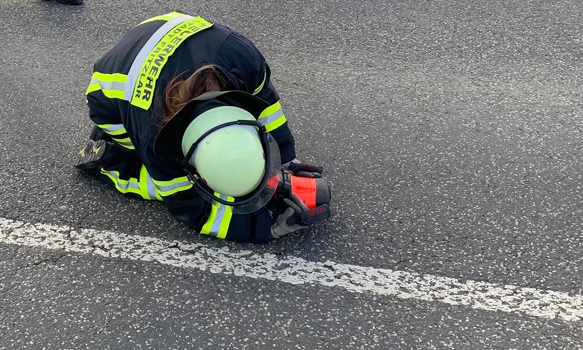 Die alarmierten Feuerwehrleute, die zu einer eingeklemmten Person ausrückten, mussten zwar keine Person herausschneiden, dafür aber unter anderem den Brandschutz an einem E-Kia sicherstellen.