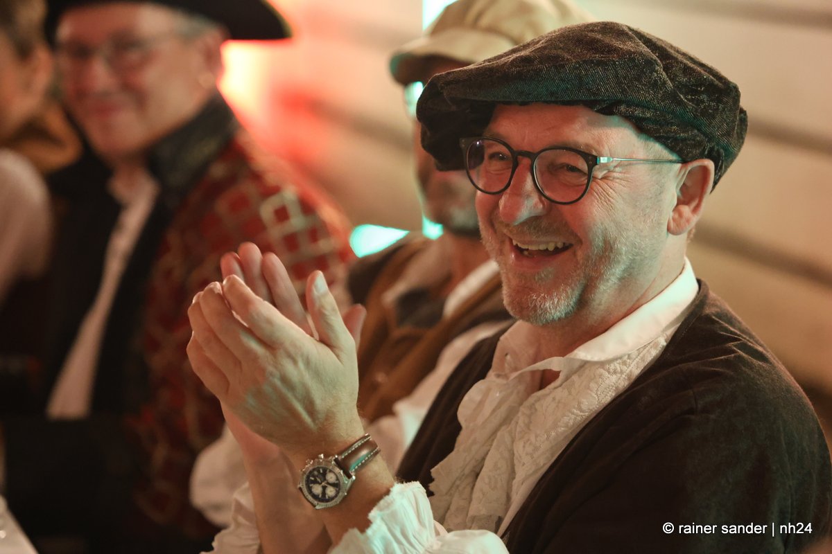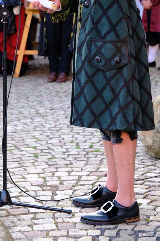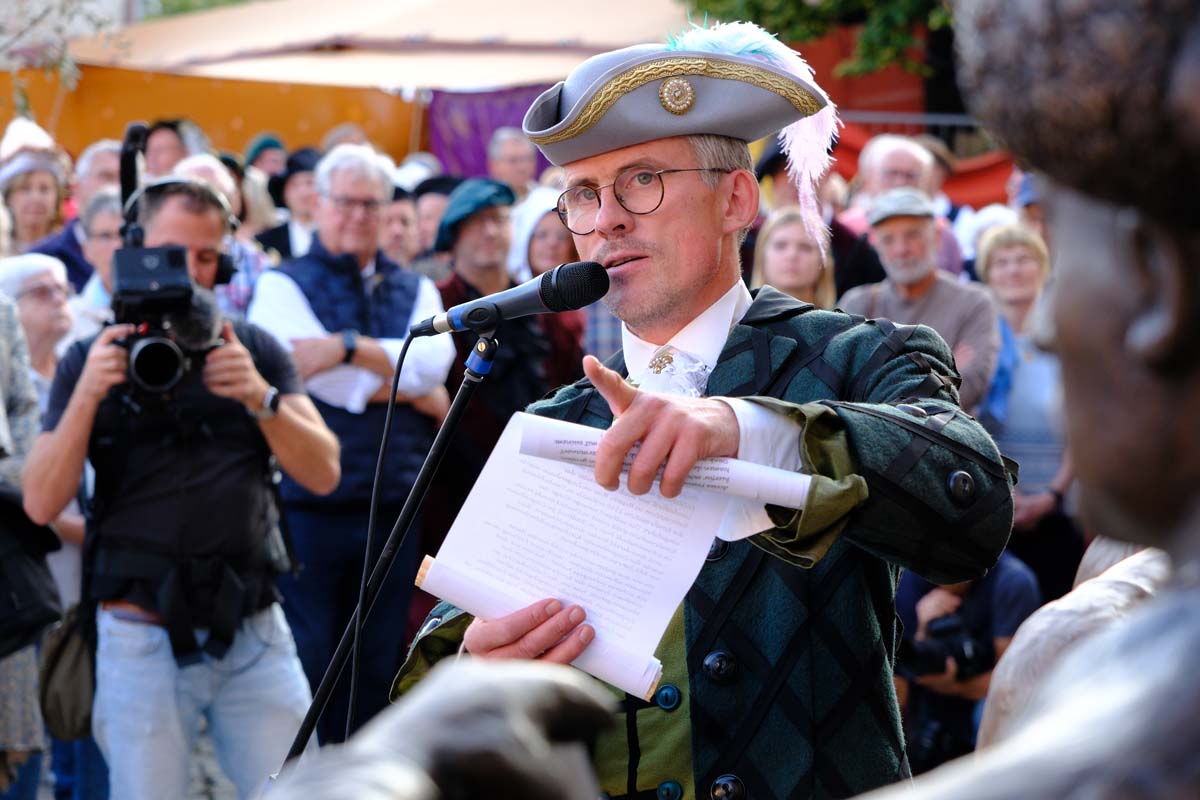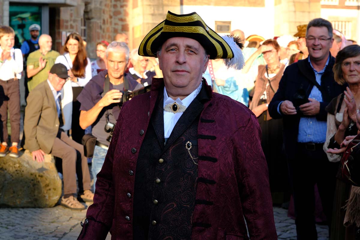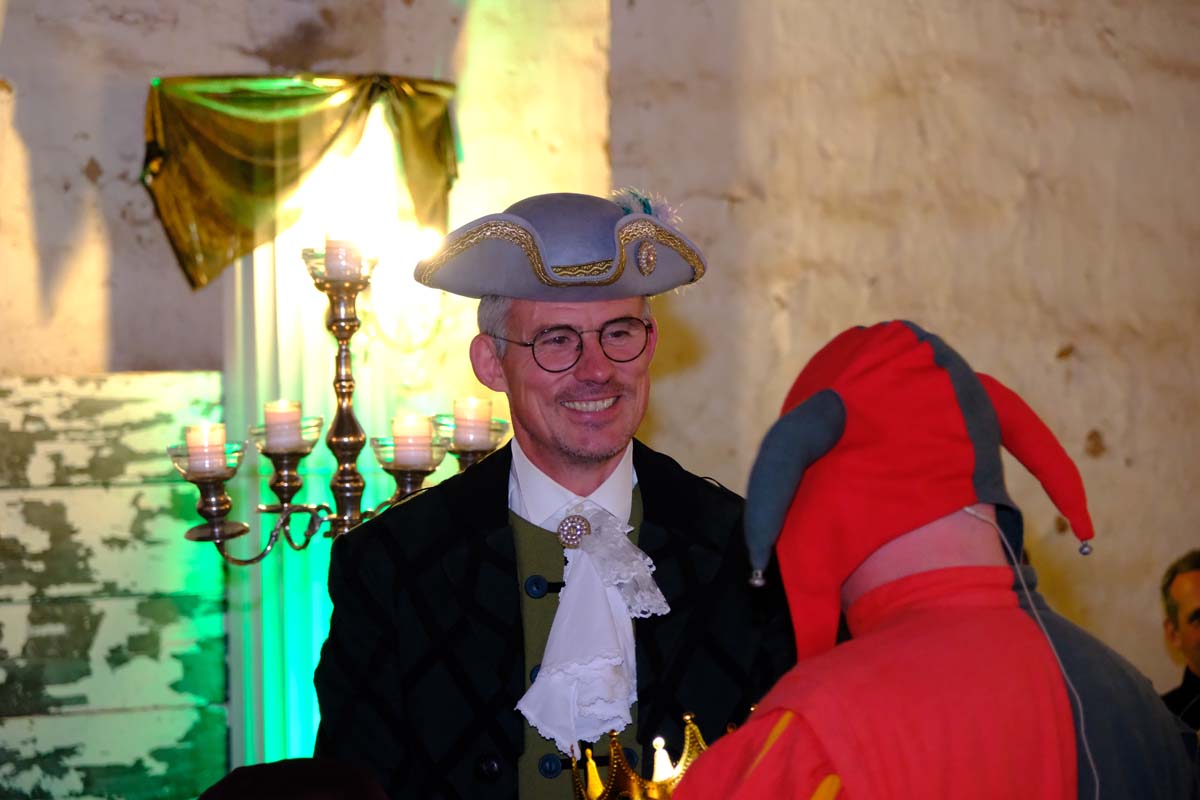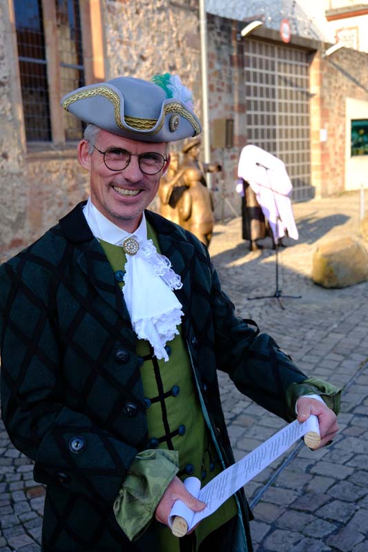 Der Erste Kreisbeigeordnete des Schwalm-Eder Kreises, Jürgen Kaufmann, einst Bürgermeister von Schwarzenborn, erschien in schlichtem weißen Gewand mit einem angenähten Samt-Ärmel. Eloquent erklärte er der Gesellschaft, die vor der Tafeley die dritte Figur des Denkmals an die Ursprünge der Konfirmation enthüllte, dass die Bürger von Schwarzenborn ihrem Meister einst nur einen samtenen Ärmel spendiert haben. Die Schwarzenbörner standen schon immer auf der Comedy-Seite der Historie.