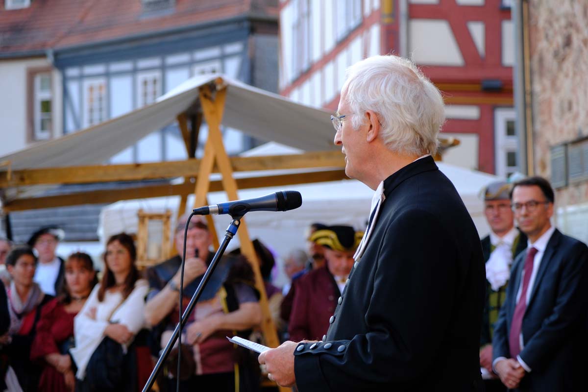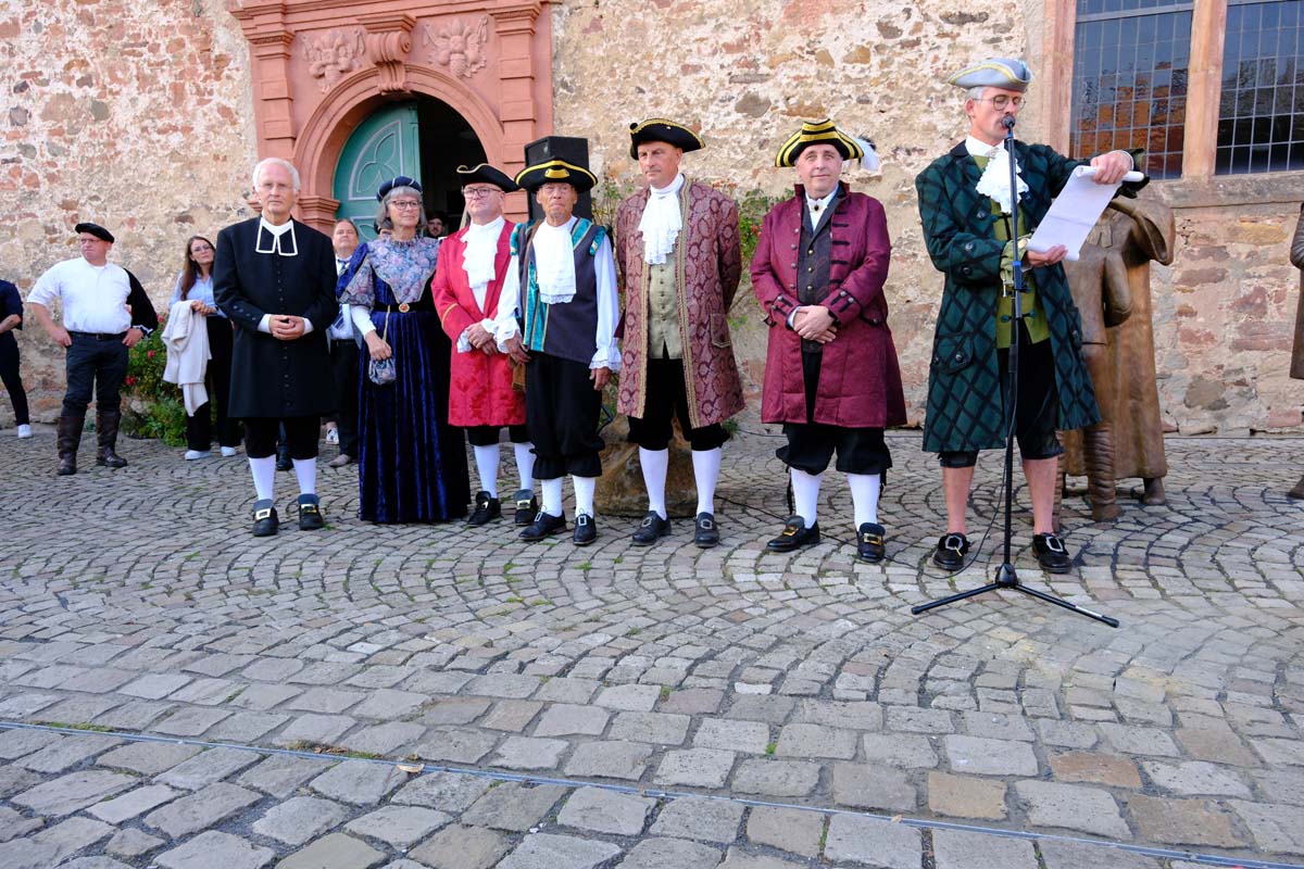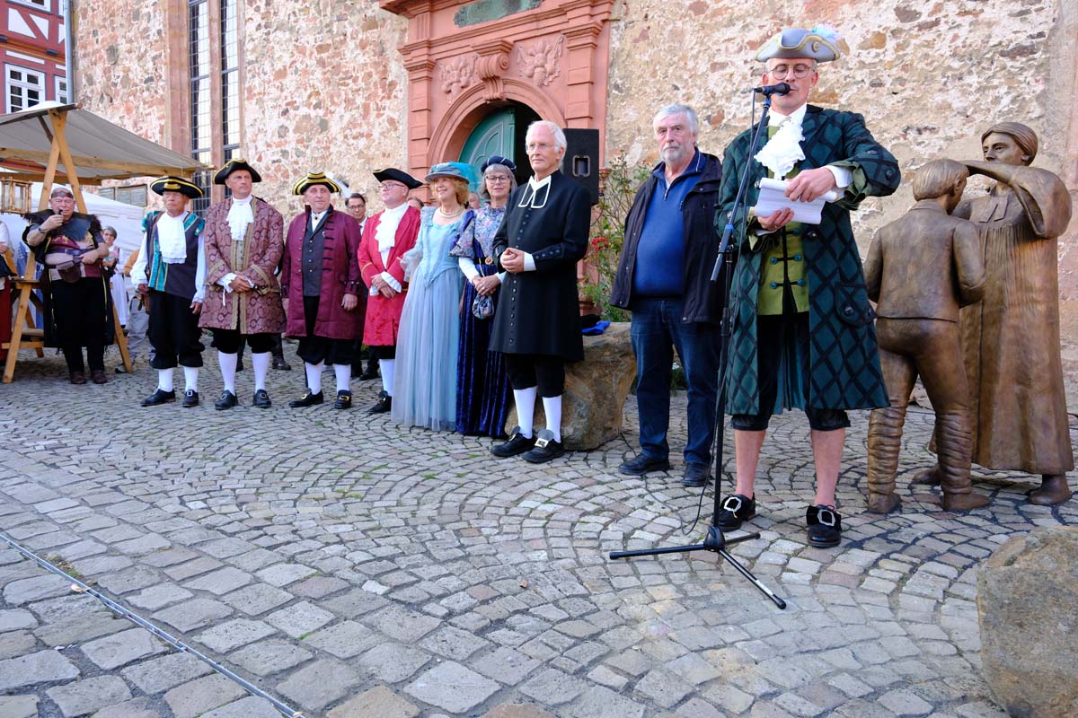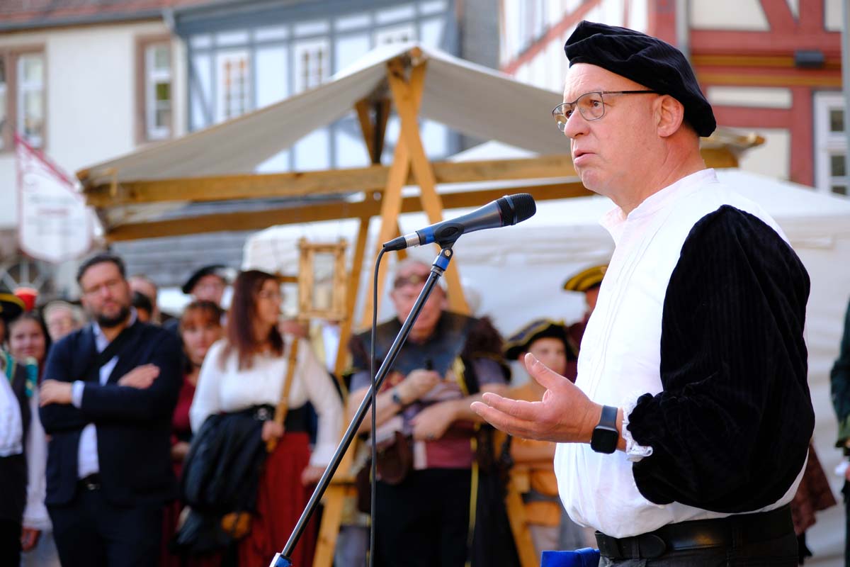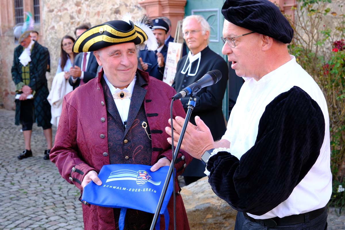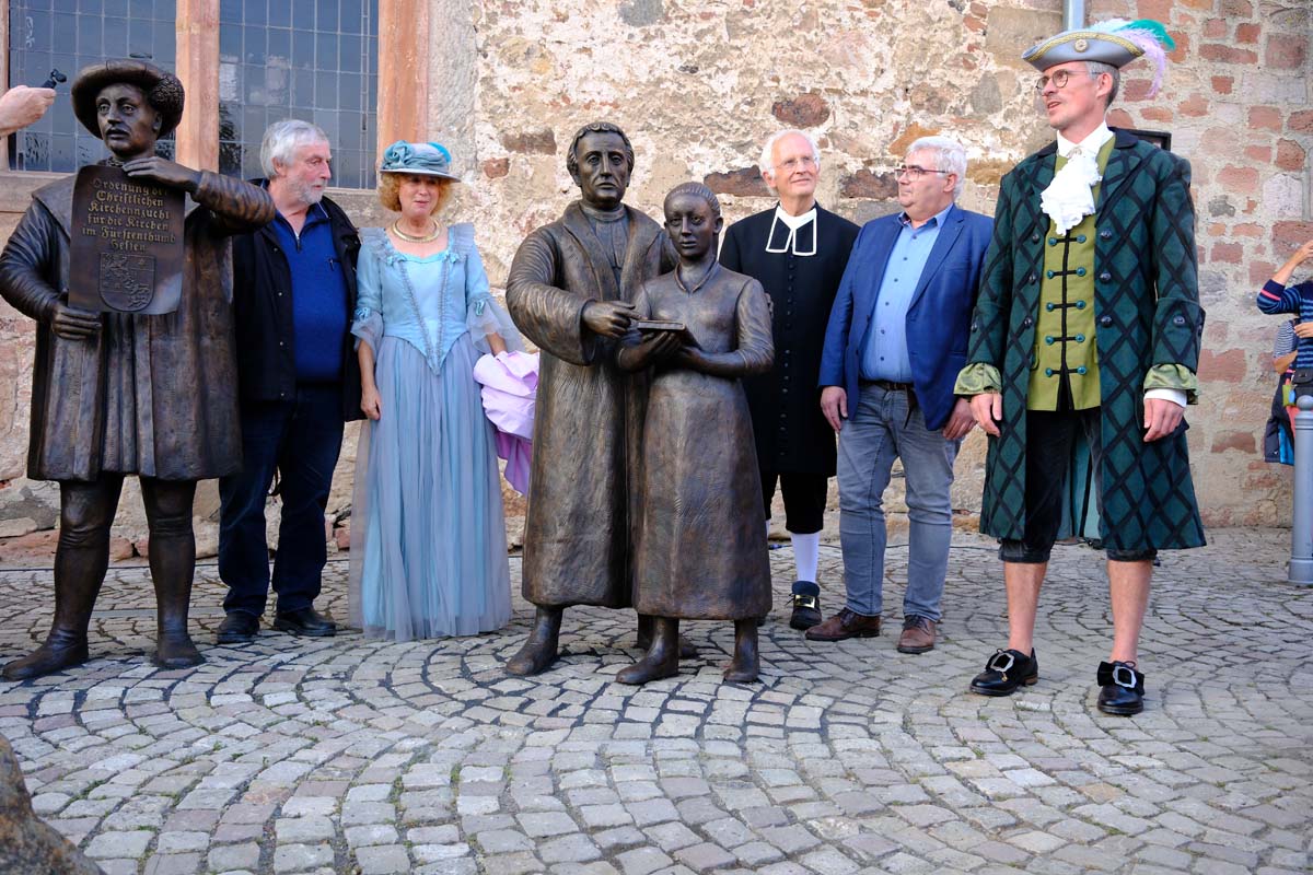 Der Treysaer Bildhauer Lutz Lesch hat das Kunstwerk gestaltet, das jetzt in ganzer Pracht auf dem Paradeplatz zu bewundern ist. Jürgen Kaufmann hat in der Kirchenzuchtordnung eine Passage entdeckt, nach der auch Andersgläubige respektiert werden müssen. In der heutigen Zeit ein wichtiges Gut. Bürgermeister Tobias Kreuter bezeichnete das Jubiläumsfest als Zeitreise durch fünf Jahrhunderte. Nach Abschreiten der Garde eröffneten Salutschüsse das farbenfrohe Fest.