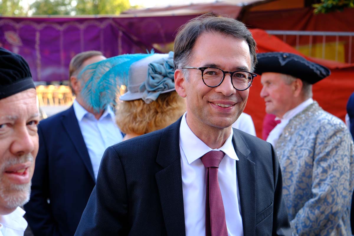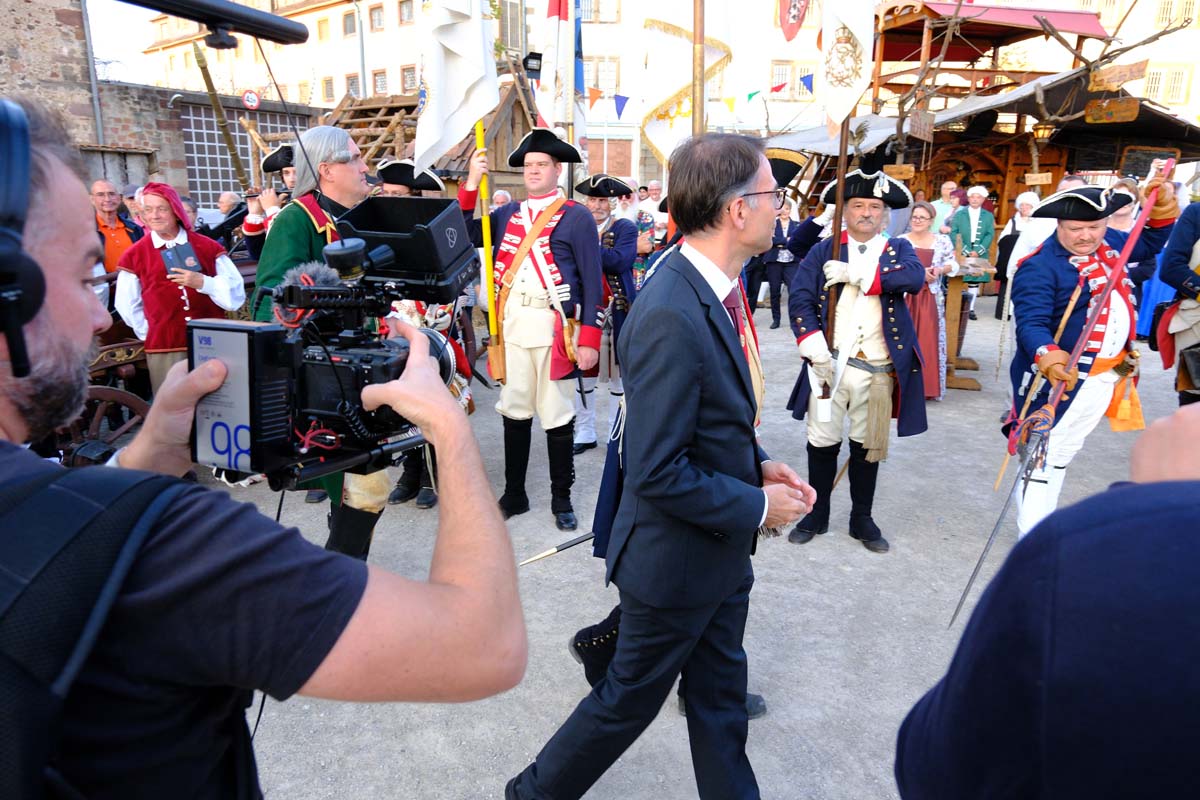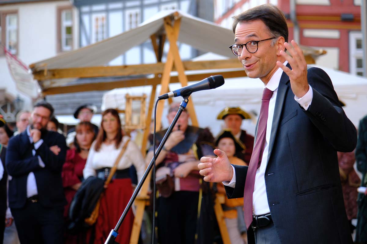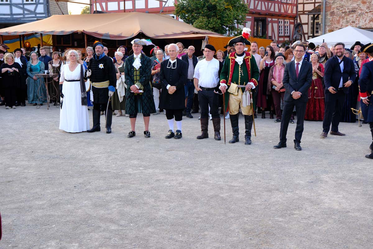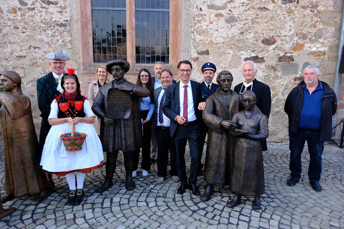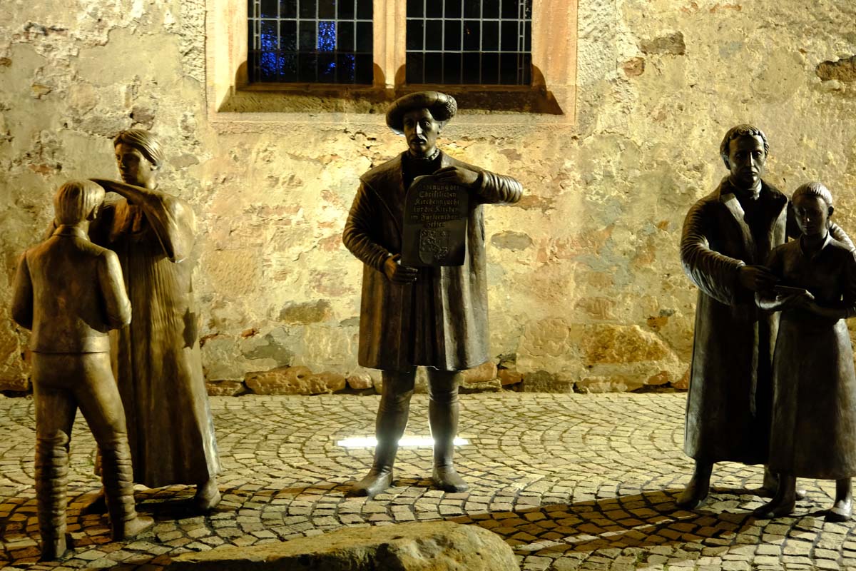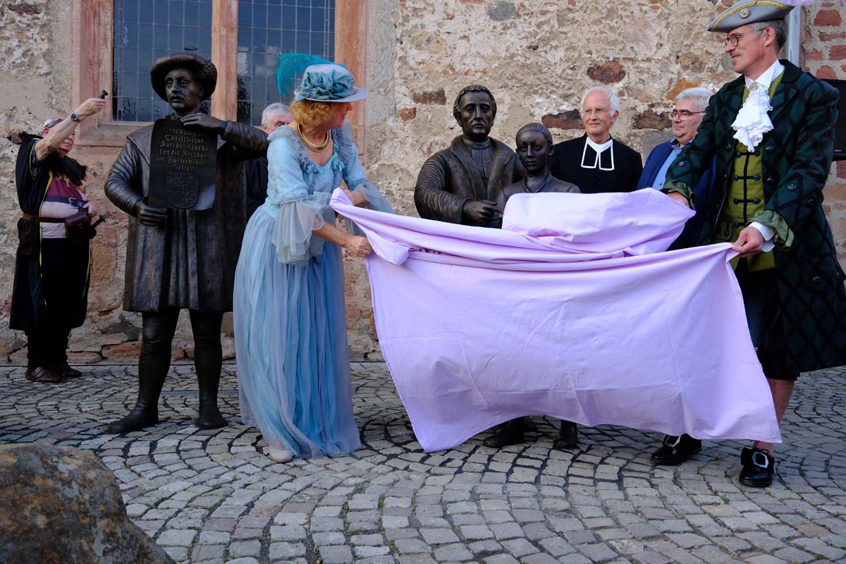 Der Treysaer Bildhauer Lutz Lesch hat das Kunstwerk gestaltet, das jetzt in ganzer Pracht auf dem Paradeplatz zu bewundern ist. Jürgen Kaufmann hat in der Kirchenzuchtordnung eine Passage entdeckt, nach der auch Andersgläubige respektiert werden müssen. In der heutigen Zeit ein wichtiges Gut. Bürgermeister Tobias Kreuter bezeichnete das Jubiläumsfest als Zeitreise durch fünf Jahrhunderte. Nach Abschreiten der Garde eröffneten Salutschüsse das farbenfrohe Fest.