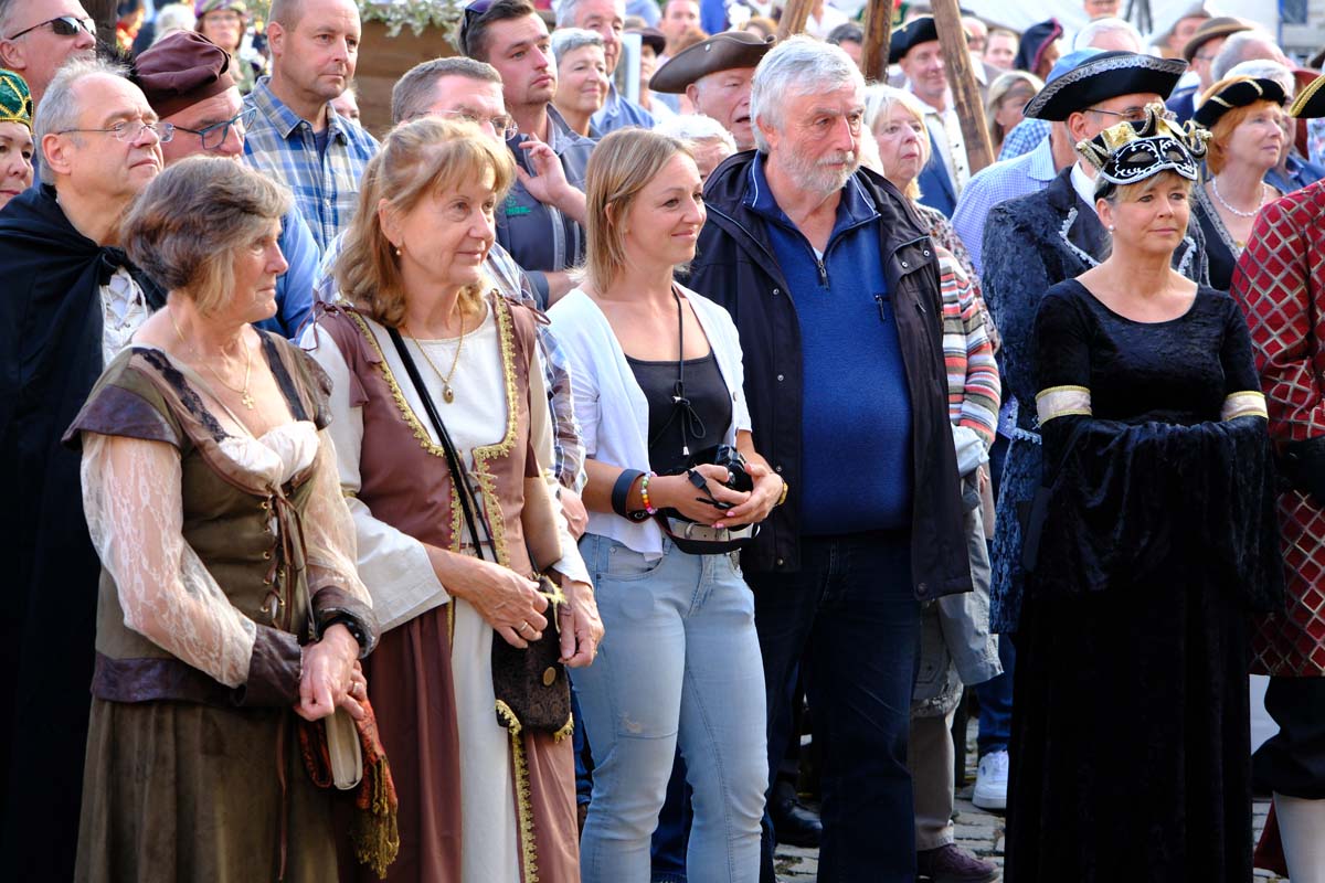 Wie vielfältig sich die Kleidung in 485 Jahren verändert hat, war gestern Abend bei der großen Tafeley zu bewundern. Im Jahr der Festungsgründung und der ersten Konfirmation waren die Gewänder, Hosen und Hemden noch eher mittelalterlich. Im Laufe von fünf Jahrhunderten hat sie sich mehrmals gravierend verändert. Genau so und genau in dieser Vielfalt zeigten sich die Gäste. Mal herrschaftlich und mal bäuerlich, entweder schillernd oder bescheiden. Interessant, dass die schillernden Persönlichkeiten der Gegenwart auffallend oft die bescheidensten Kostüme der Vergangenheit wählten.