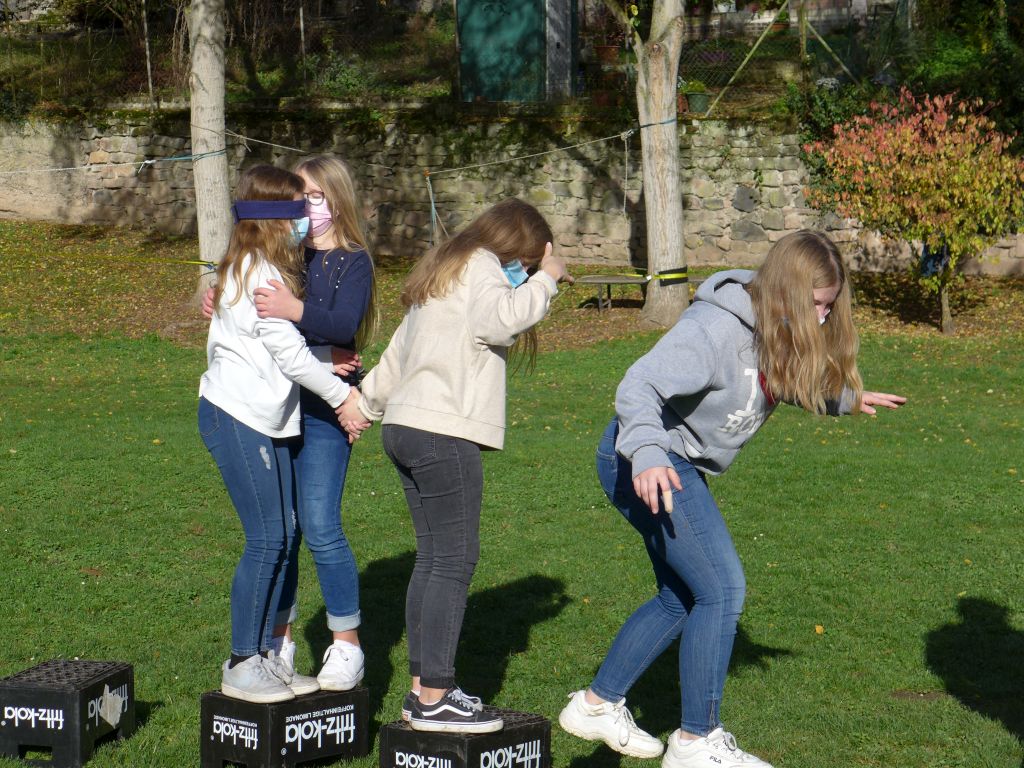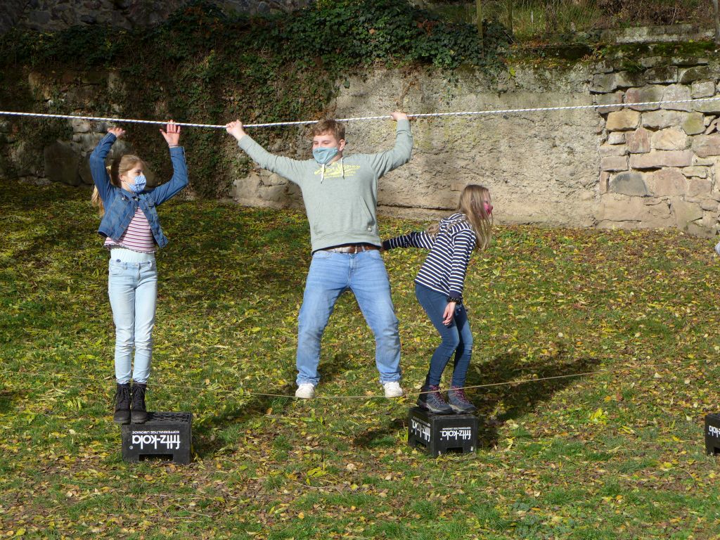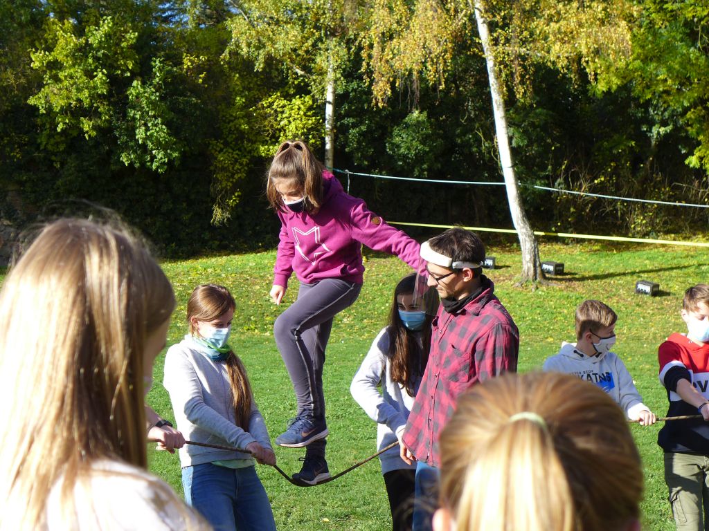 Diese bestanden unter anderem darin, sich in Teams auf Kisten fortzubewegen, ohne den Boden zu berühren, oder über eine Slackline zu balancieren. Mit gegenseitiger Hilfe und Unterstützung schaffte es jeder Schüler einmal über das schlaffe und wackelige Gurtband zu laufen, das zwischen zwei Bäumen gespannt war. Nach diesem Erfolgserlebnis verglich Erlebnispädagoge Michael Baderschneider in einer kurzen Reflexionsrunde zum Schluss die sportlichen Herausforderungen mit den aktuellen Herausforderungen durch die Corona-Pandemie und machte den Schülern Mut, sich auch im Alltag gegenseitig zu helfen und zu unterstützen. Gemeinsam könne man so die schwere Zeit meistern. Die Schüler, die um ein Feedback gebeten wurden, waren von diesen Outdoor-Tagen begeistert: „Es war megacool und hat echt Spaß gemacht. Hoffentlich machen wir so etwas bald wieder!“, so Mia Möller aus der 6G1.