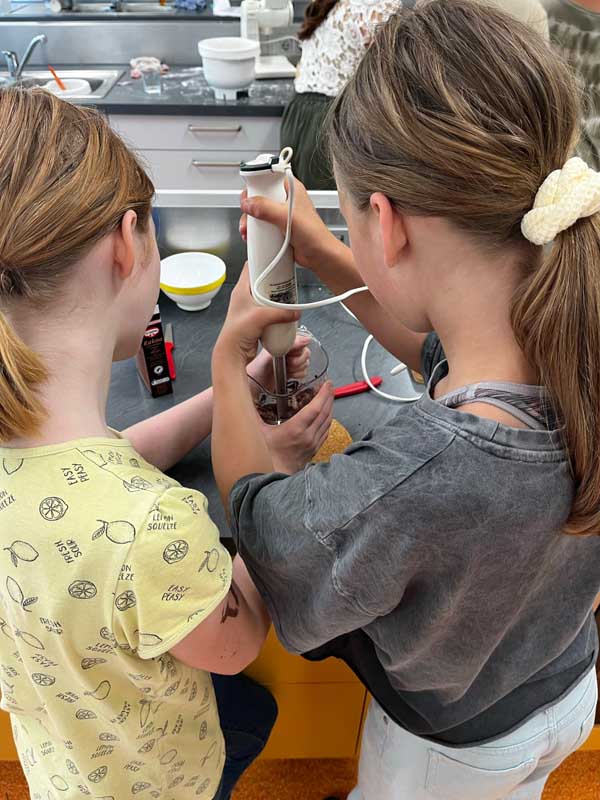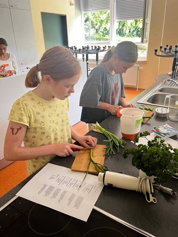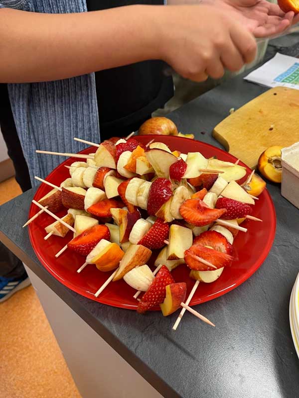 In der Schulküche wurde mit großem Engagement gearbeitet: Nach einer kurzen Einführung zu Nährstoffen und gesunder Lebensmittelauswahl ging es in Kleingruppen an die Zubereitung. Obst wurde geschnitten und zu dekorativen Spießen verarbeitet, Joghurtbrötchen mit Haferflocken gebacken und gesunde Aufstriche hergestellt – darunter ein zuckerfreies Schokomousse und verschiedene Dips.