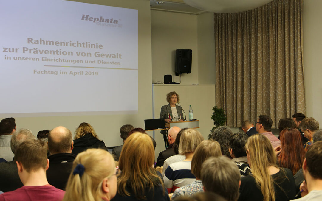 Eine Arbeitsgruppe mit 18 Kolleginnen und Kollegen aus verschiedenen Arbeitsbereichen Hephatas habe sich zwei Jahre lang mit dem Thema beschäftigt. Mit dem Ziel, einen institutionellen Rahmen für Kunden und Mitarbeitende zu erarbeiten, der Schutz und Sicherheit gebe. Zwar hätten die verschiedenen Bereiche jeweils eigene Schutz- und Präventionskonzepte, darüber hinaus habe es jedoch noch eines gemeinsamen Rahmens bedurft. Das Resultat sei die „Rahmenrichtlinie zur Prävention von und zum Umgang mit Gewalt“ mit einem Anhang mit Fallbeispielen und einem Materialhandbuch, die Ende 2018 fertig gestellt worden sei. Aber auch der Fachtag an sich sei ein Ergebnis dieses Prozesses.