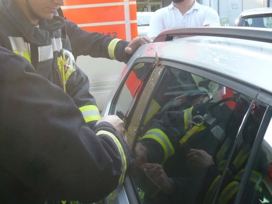 Wie Feuerwehrsprecher Bernd Völske berichtet, hatten die Eltern den Pkw auf dem Parkplatz des Neukauf-Markts verlassen, Kind und beide Schlüssel aber noch im Auto, als der Pkw dann automatisch verriegelte. Alarmierte Feuerwehrleute zerstörten eine hintere Dreiecksscheibe, konnten dann in den Pkw hineingreifen und die Verriegelung öffnen. Zuvor war der Versuch, die Türe so weit herauszuziehen, dass man mit einem Draht an den Türöffner gelangen konnte, gescheitert. Letztlich klebten die Feuerwehrleute das Fenster ab und setzten zum Zerstören der Scheibe einen Federkörner ein. Das Kleinkind wurde im Anschluss vorsorglich vom Rettungsdienst untersucht, war aber unverletzt und wohlauf. Die komplette Hilfsaktion, von der Alarmierung bis zur Meldung „Kind befreit“ dauerte 17 Minuten, so Völske.