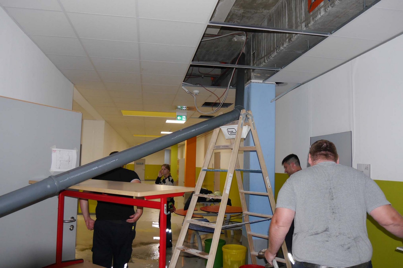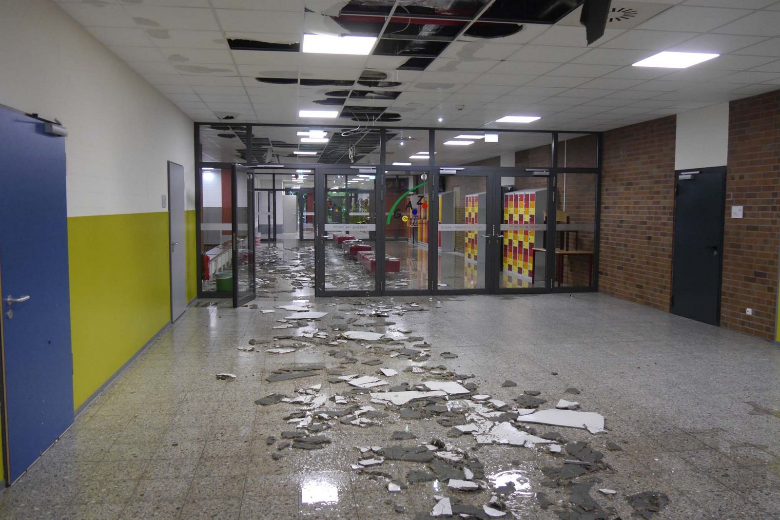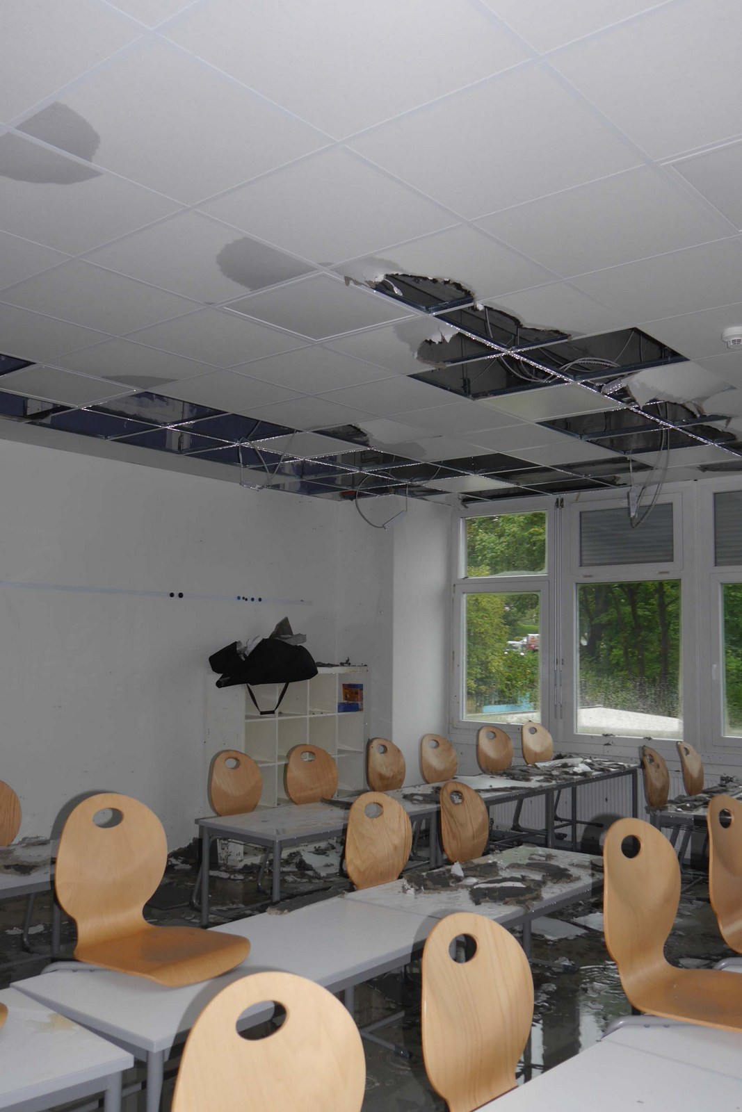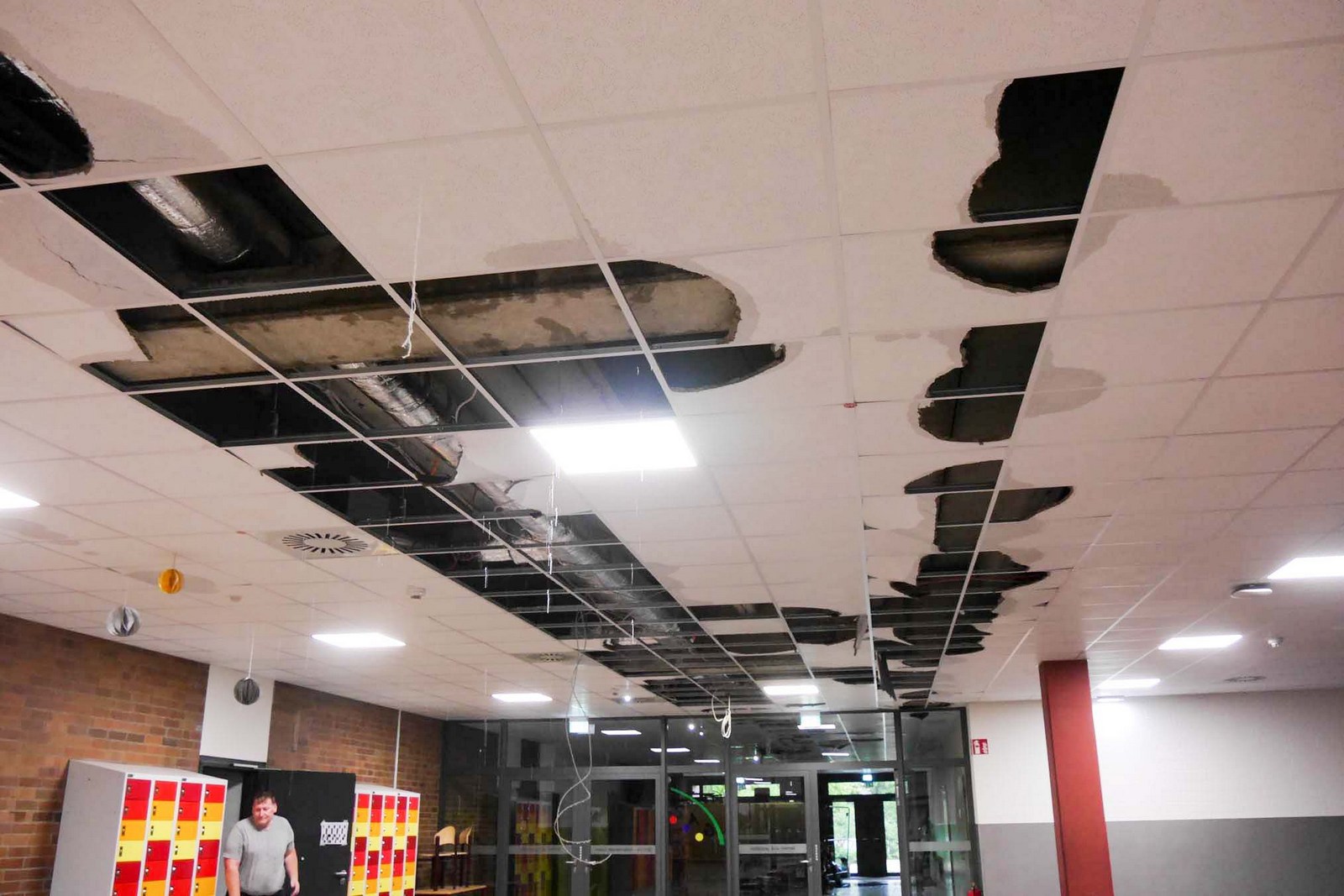 Das Wasser hatte sich durch die Decken und Flure in die Hälfte der Klassen-, Funktions- und Kellerräume ausgebreitet, was zur Folge hatte, dass sich in einigen Bereichen die Deckenplatten vollgesogen hatten und herabgefallen waren.