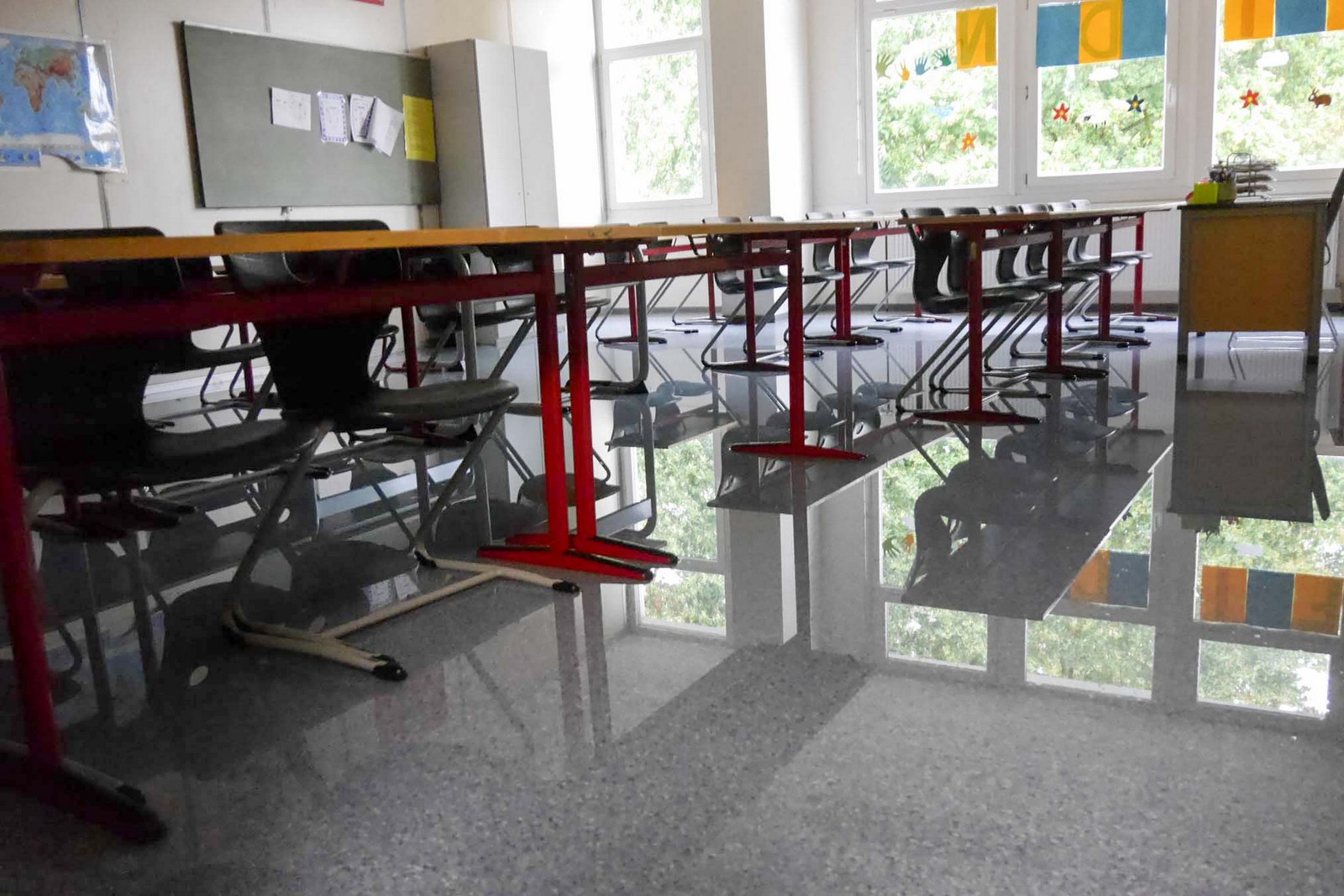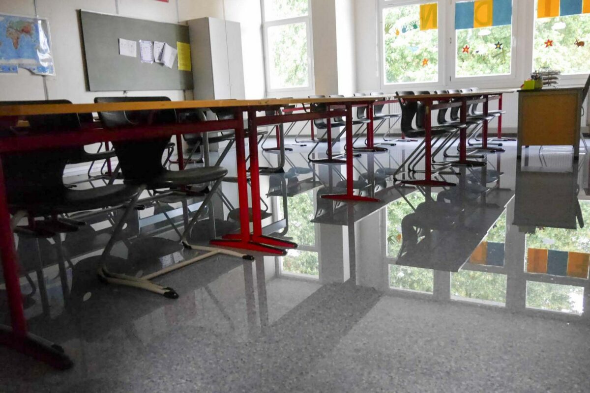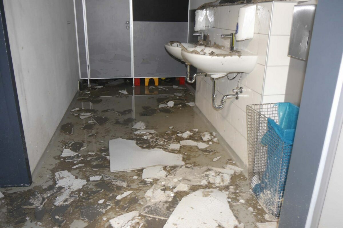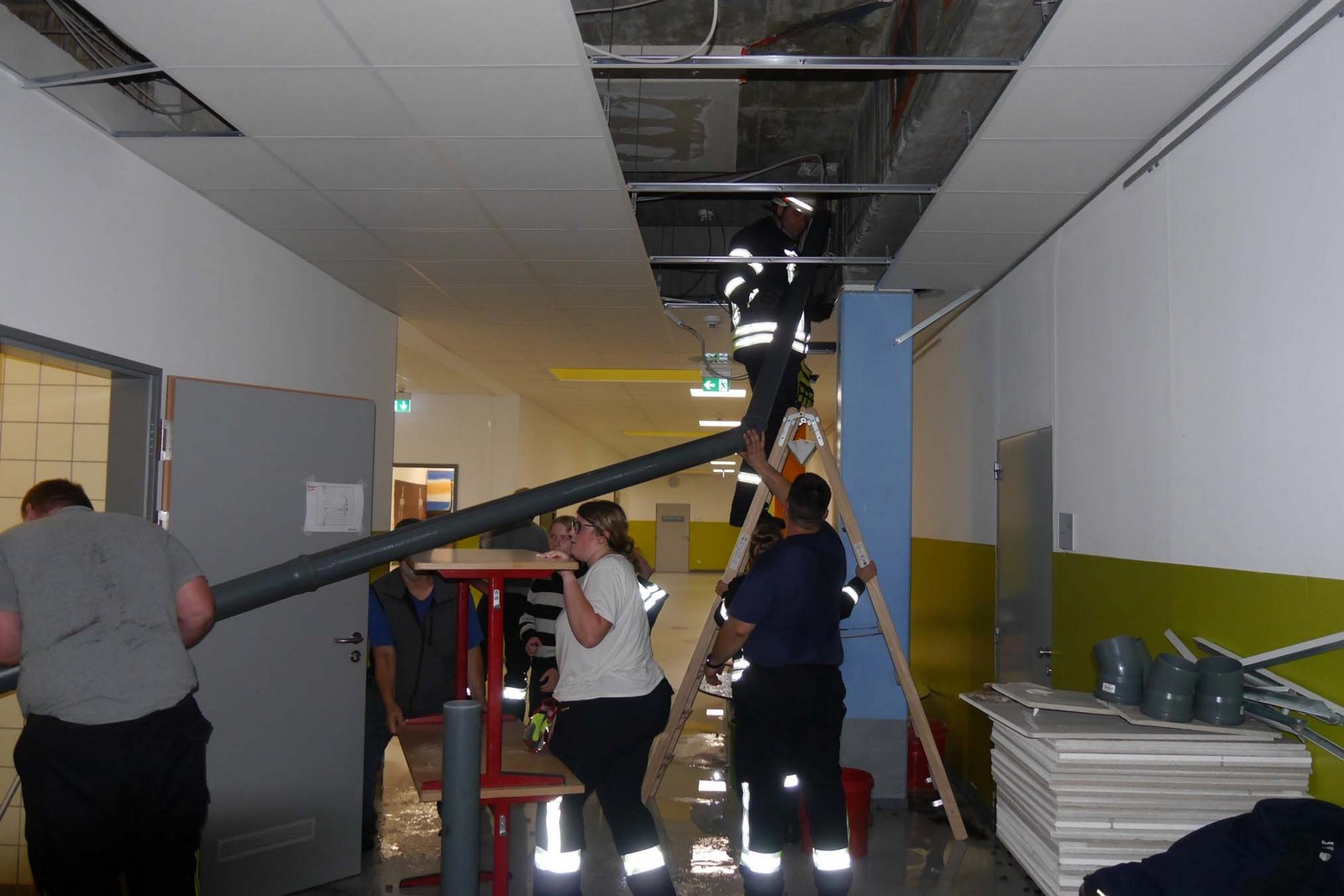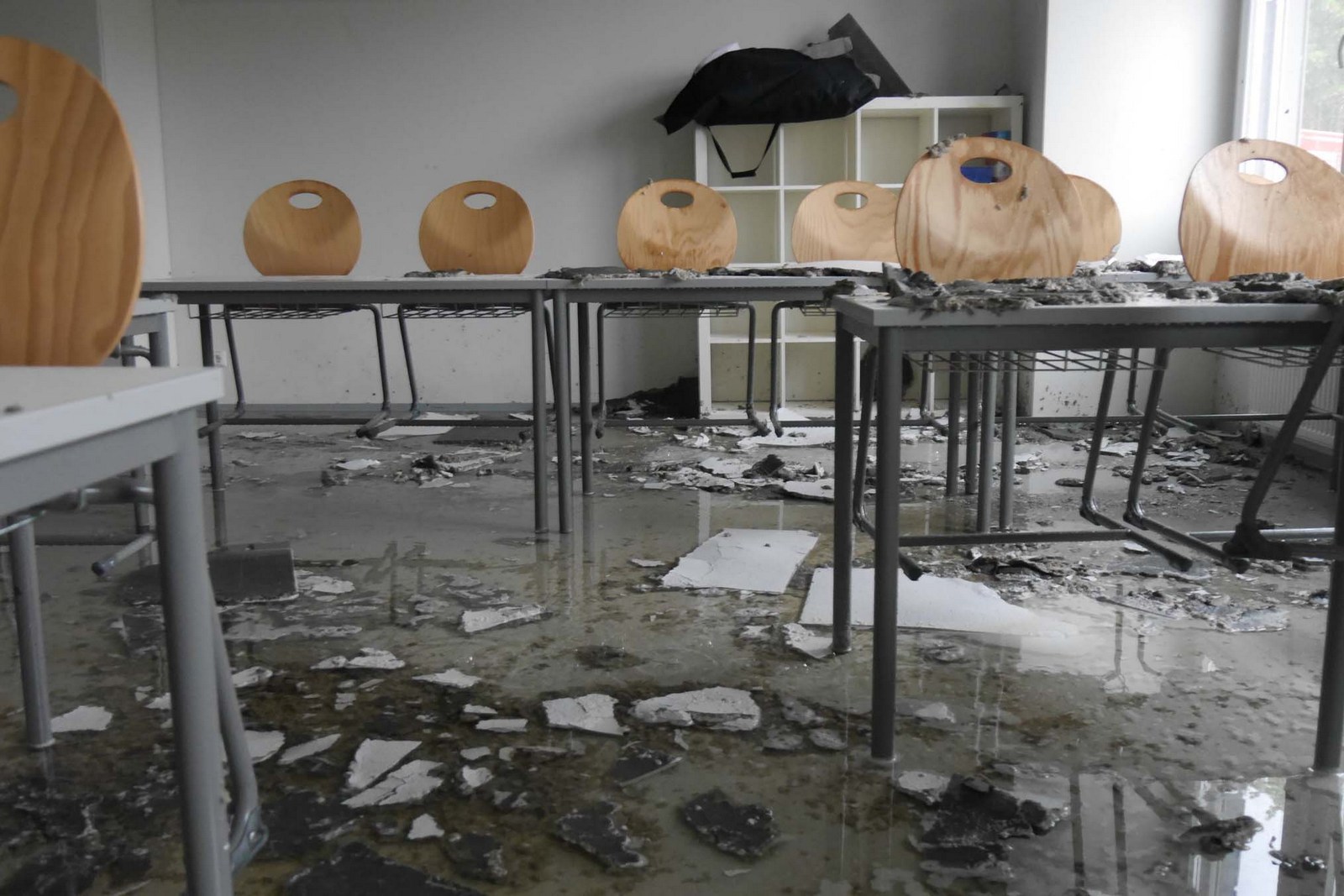 Das Wasser hatte sich durch die Decken und Flure in die Hälfte der Klassen-, Funktions- und Kellerräume ausgebreitet, was zur Folge hatte, dass sich in einigen Bereichen die Deckenplatten vollgesogen hatten und herabgefallen waren.