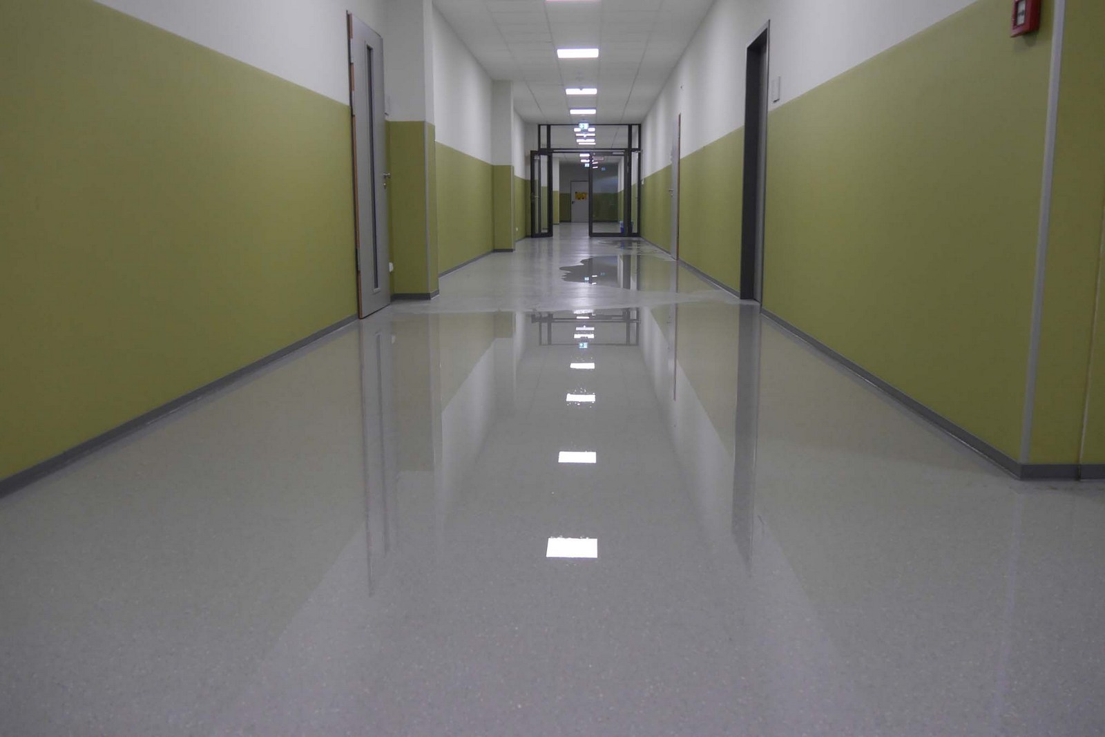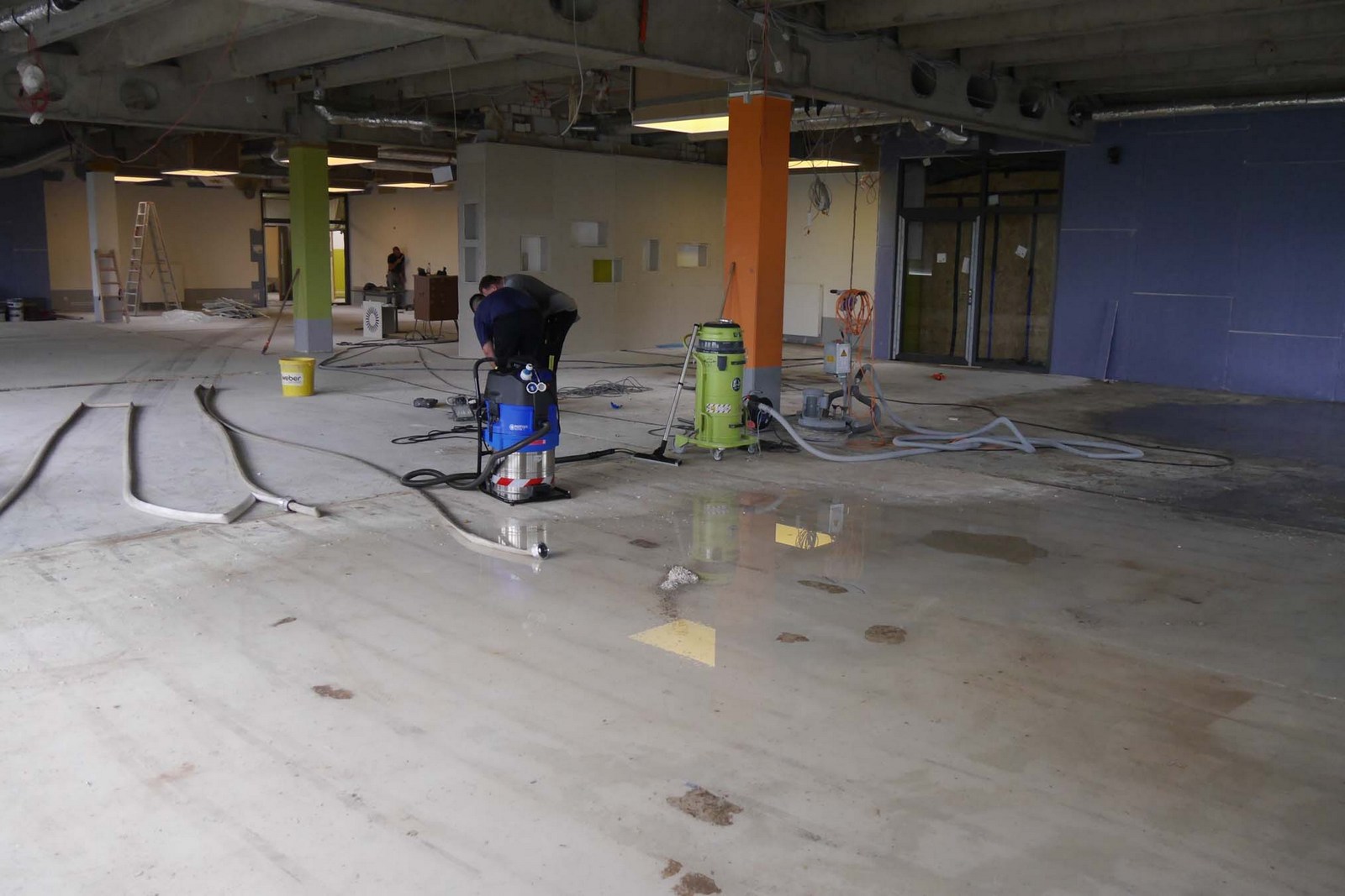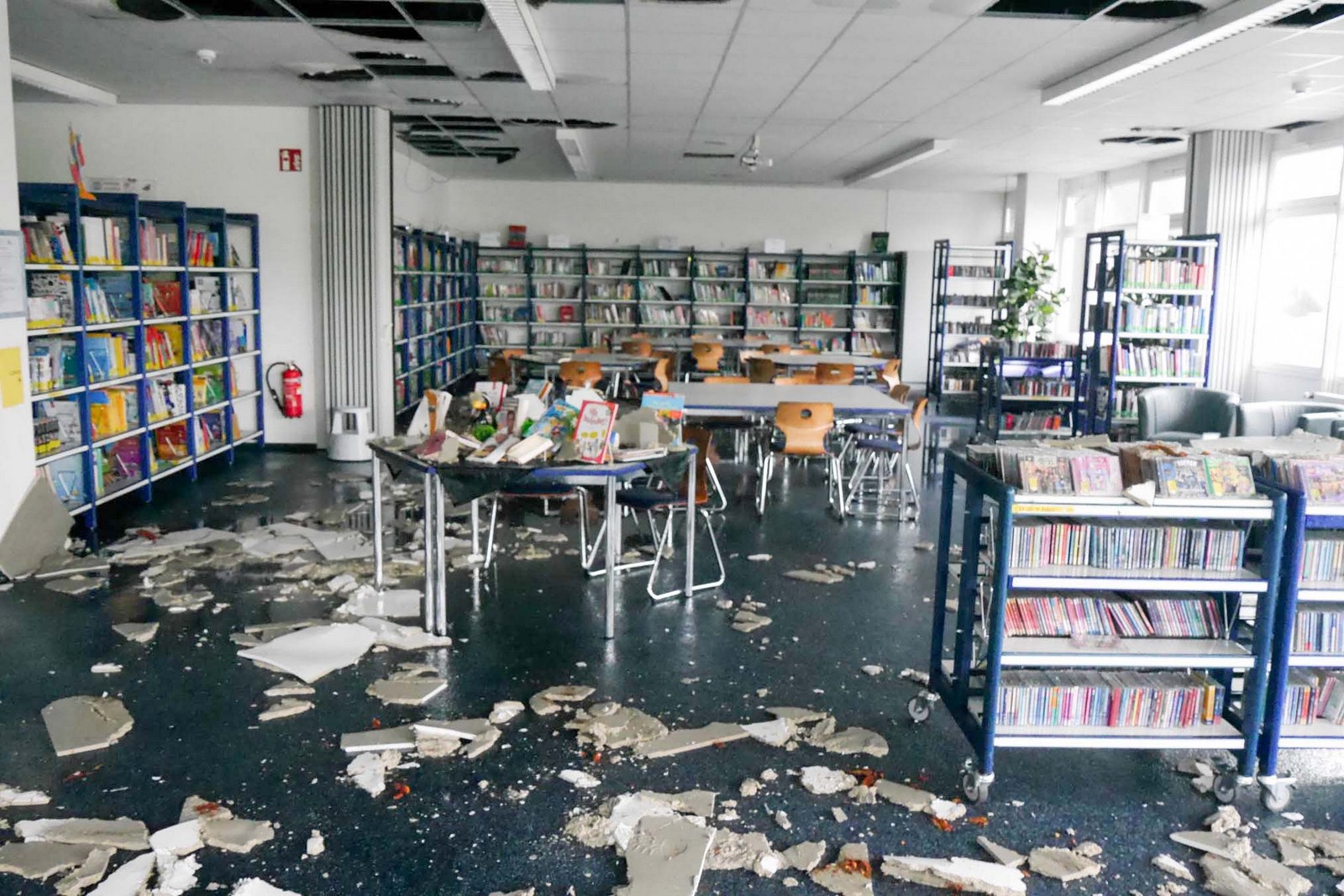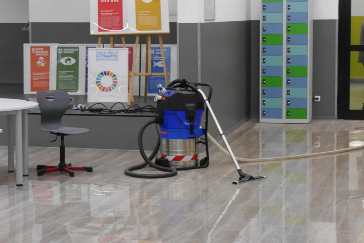 Das Wasser hatte sich durch die Decken und Flure in die Hälfte der Klassen-, Funktions- und Kellerräume ausgebreitet, was zur Folge hatte, dass sich in einigen Bereichen die Deckenplatten vollgesogen hatten und herabgefallen waren.