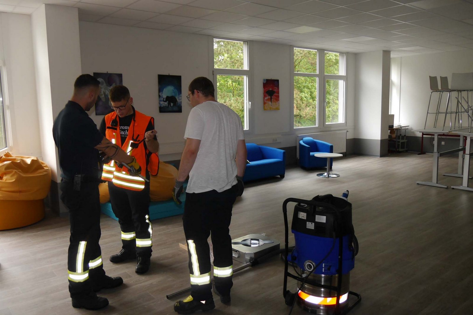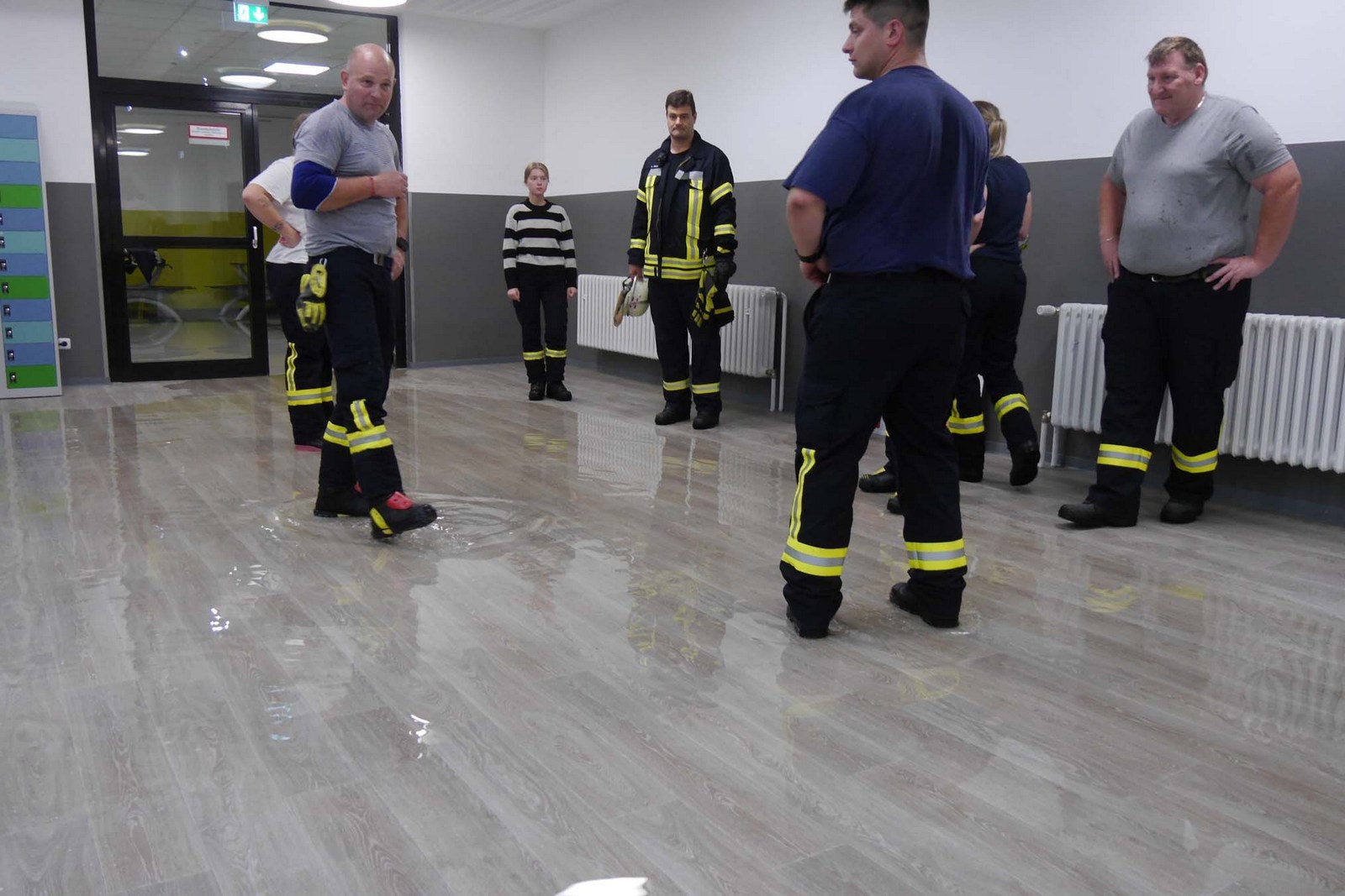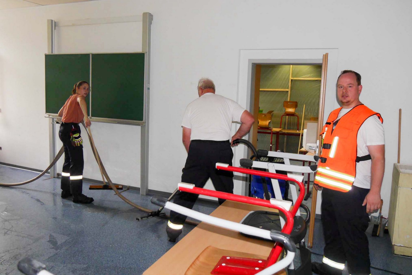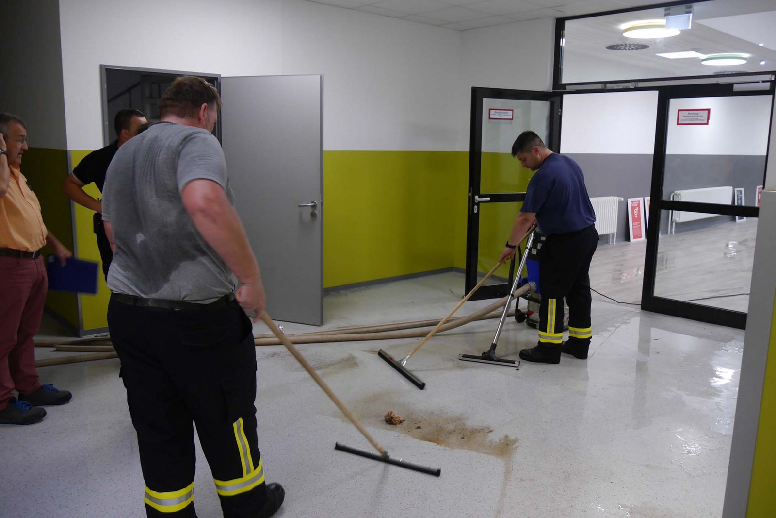 In Absprache mit der Bauleitung und dem Bauamt des Schwalm-Eder-Kreises setzte die Feuerwehr in den stark betroffenen Räumen im Obergeschoss Nasssauger ein, um ein weiteres Nachlaufen nach unten zu verhindern.