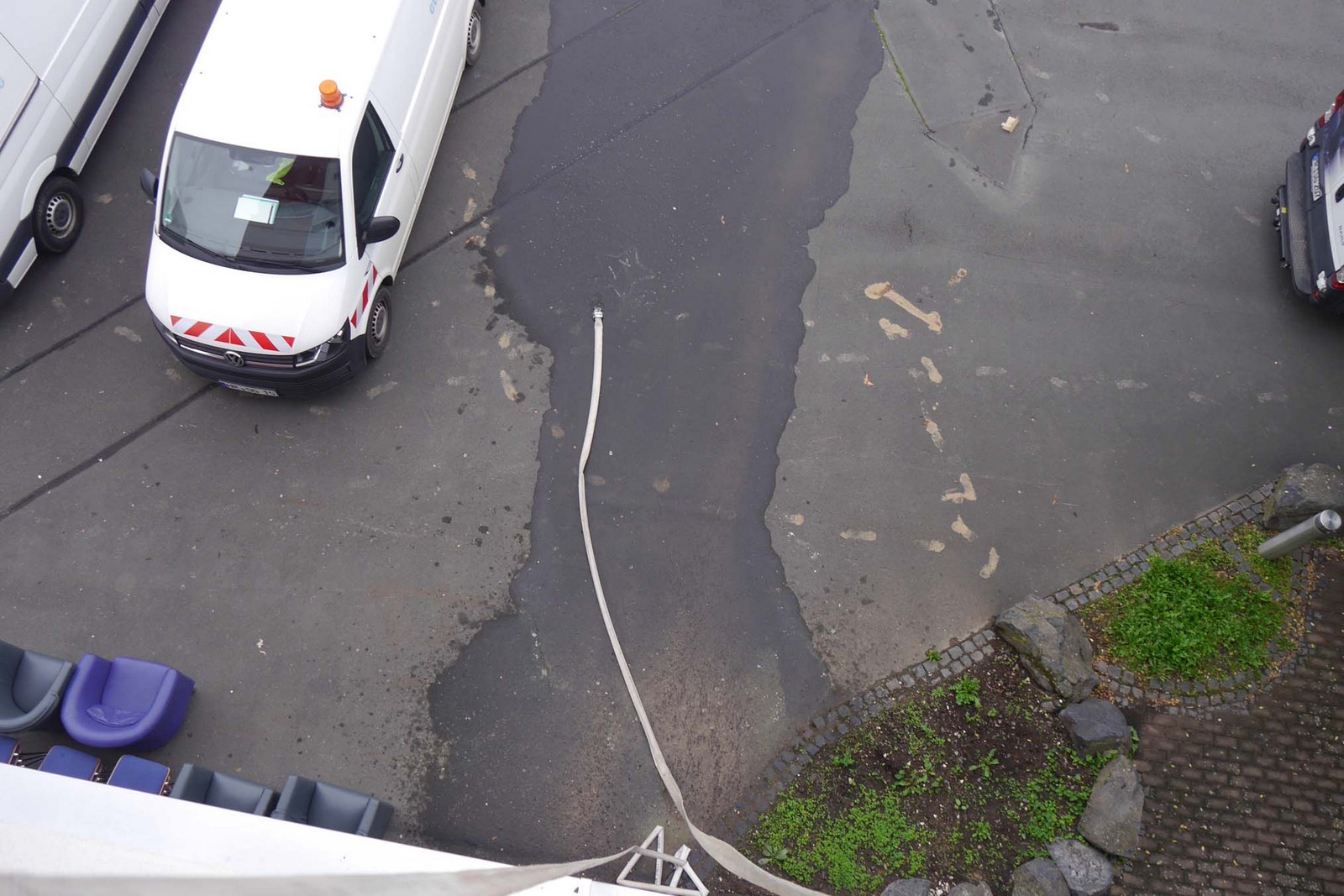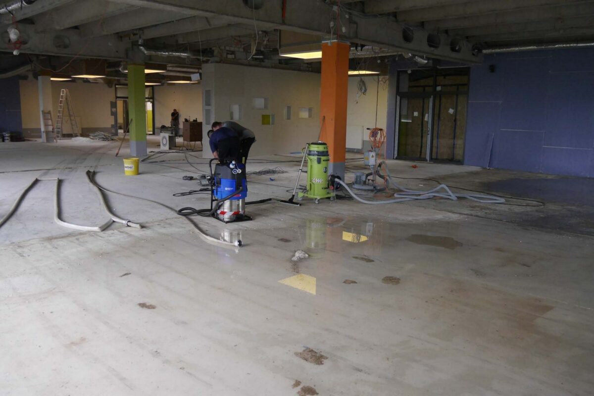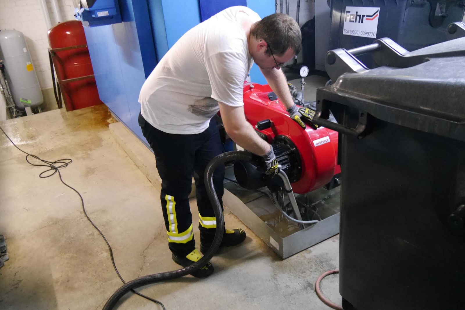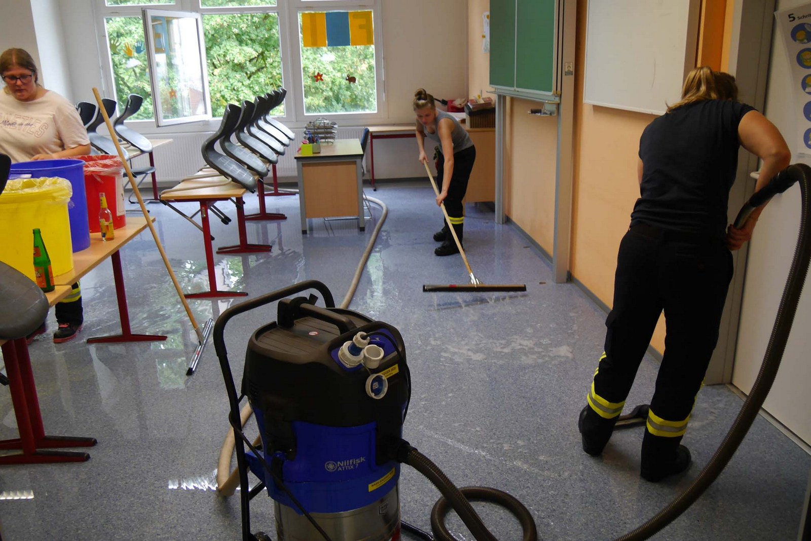 In Absprache mit der Bauleitung und dem Bauamt des Schwalm-Eder-Kreises setzte die Feuerwehr in den stark betroffenen Räumen im Obergeschoss Nasssauger ein, um ein weiteres Nachlaufen nach unten zu verhindern.