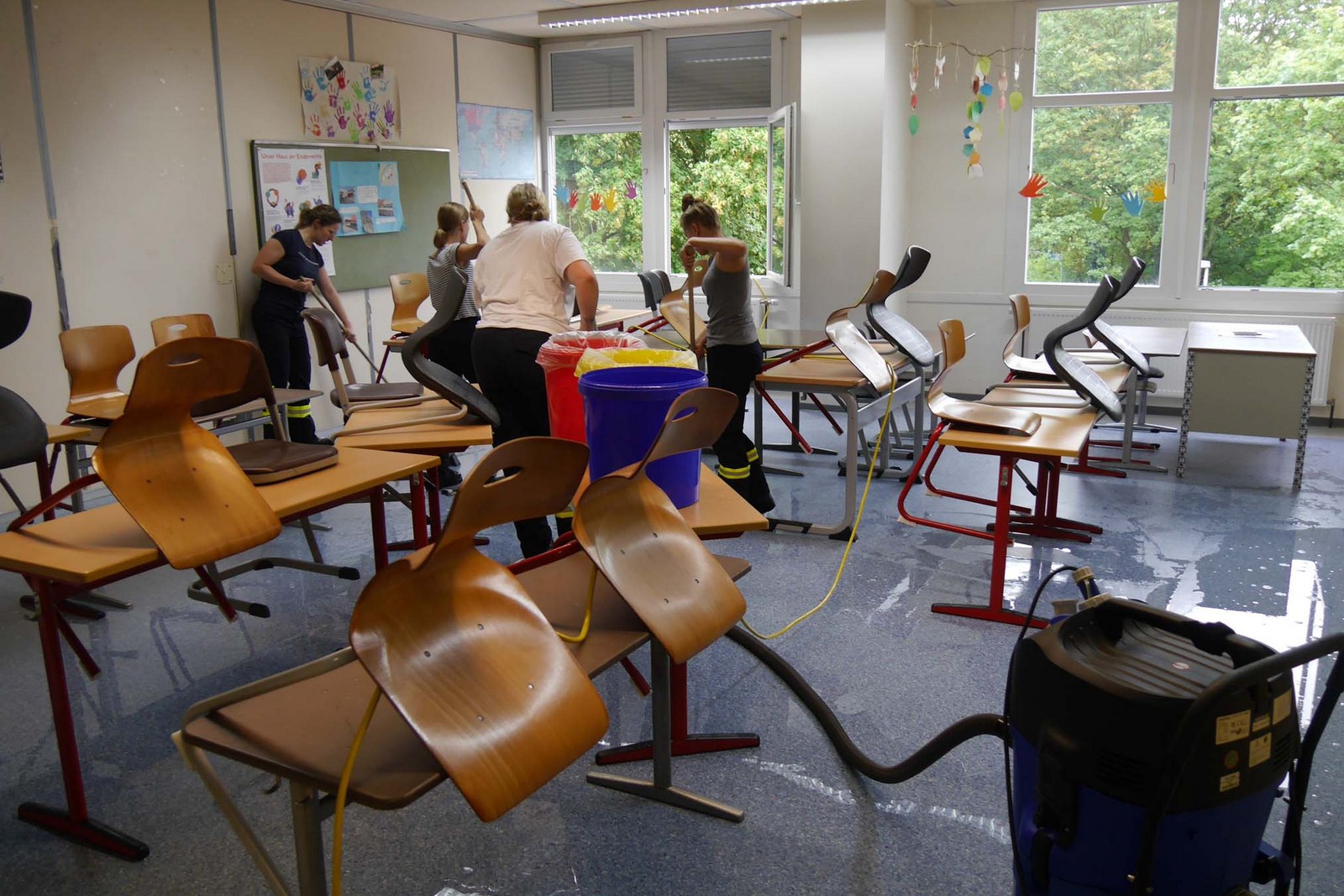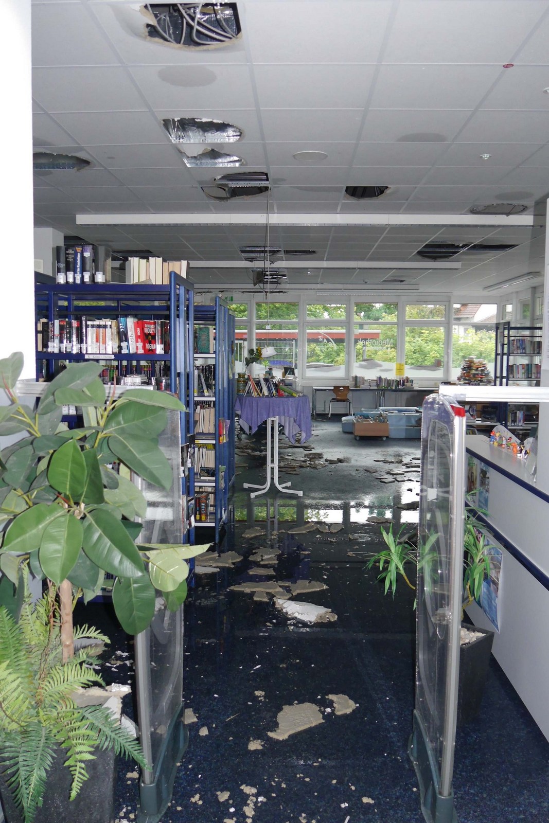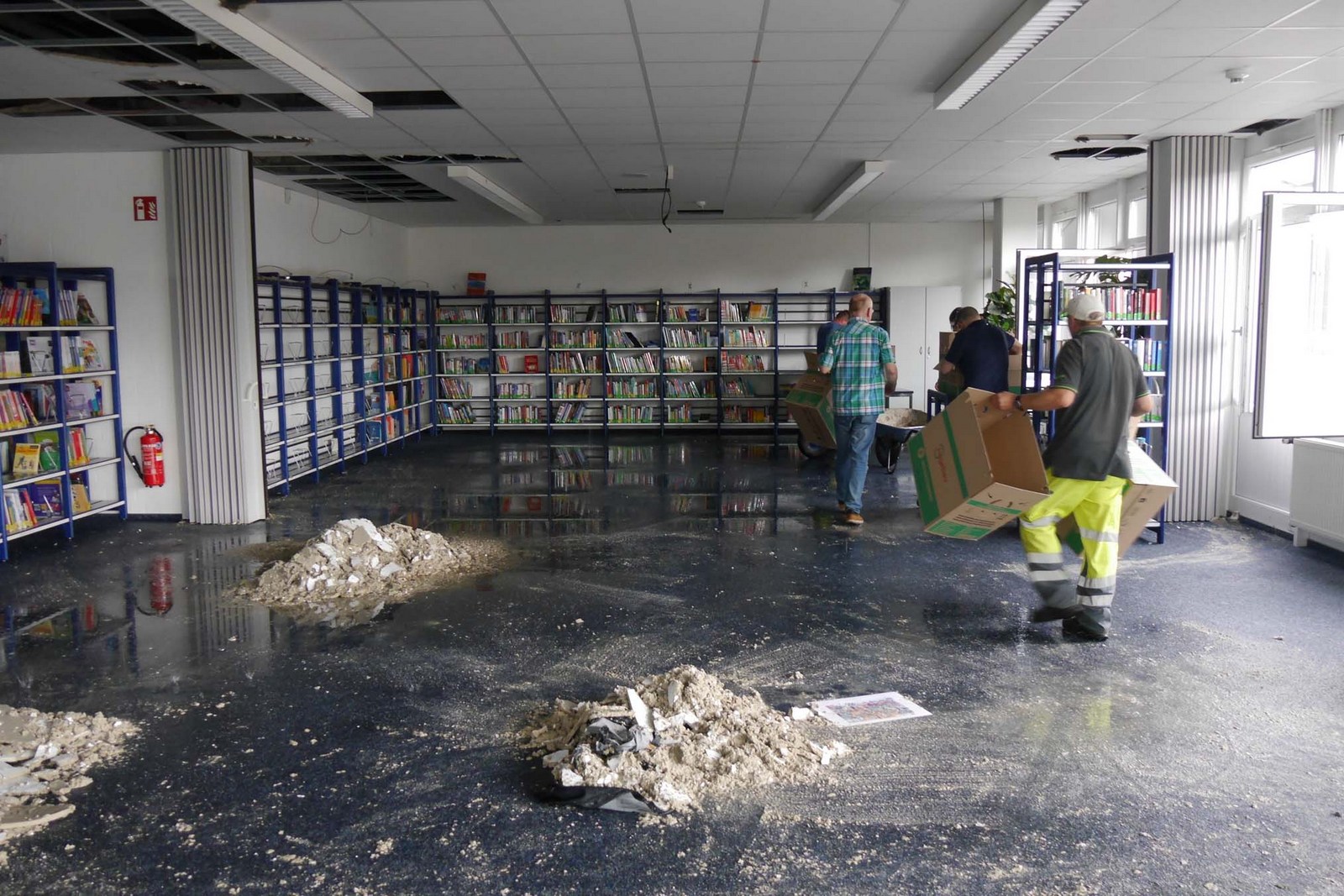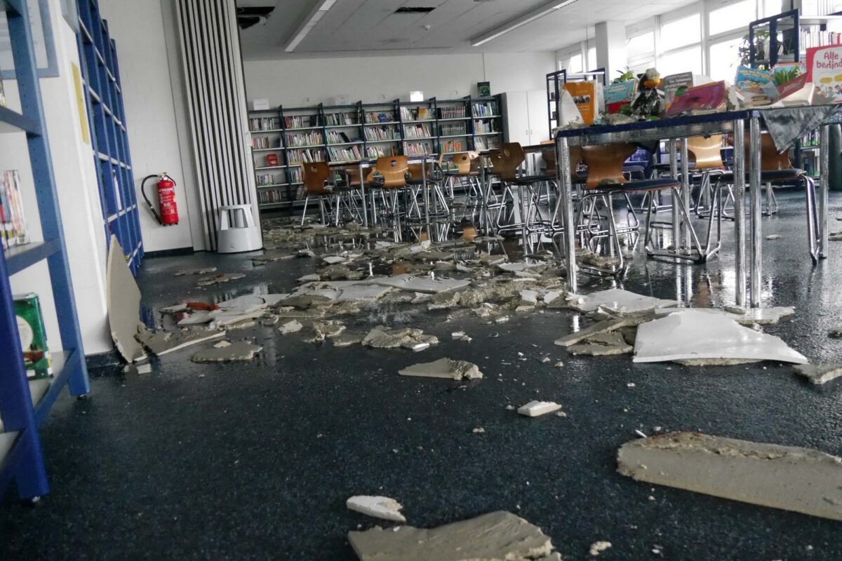 Besonders getroffen hat es die Mediathek der Gesamtschule im Kellergeschoss. In einem „Noteinsatz“ holten städtische Mitarbeiter die Bücher und elektronische Geräte aus dem Raum.