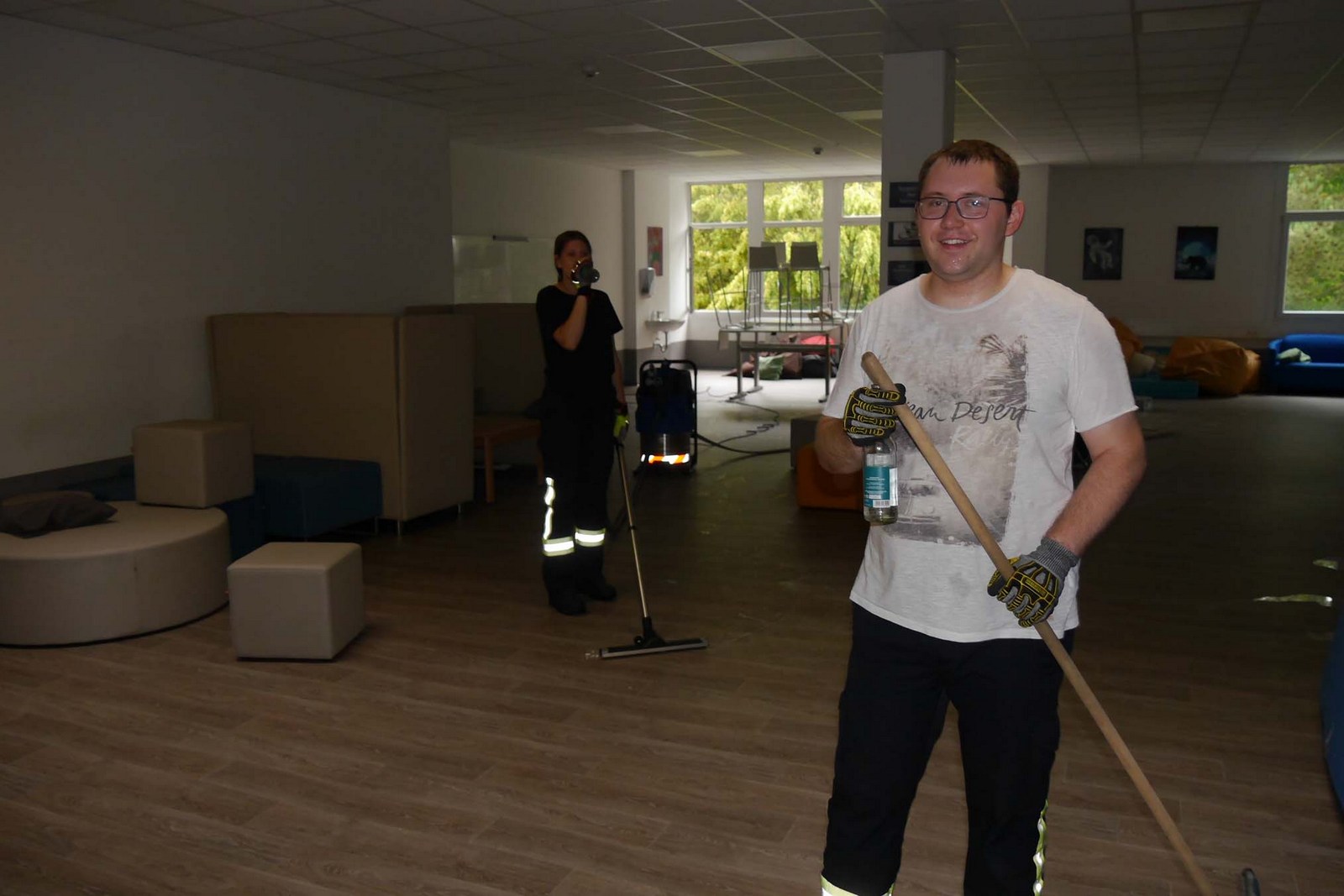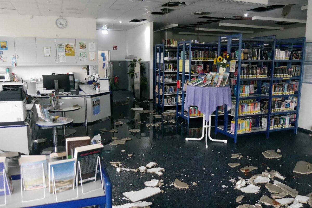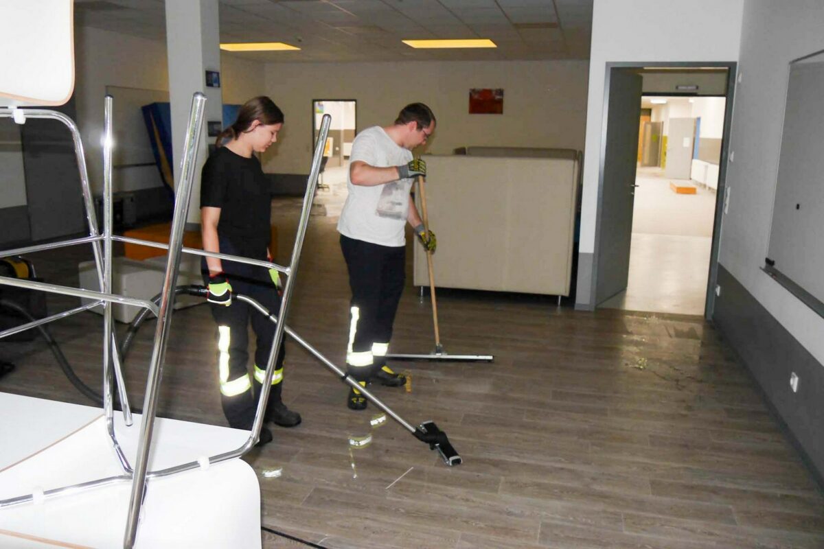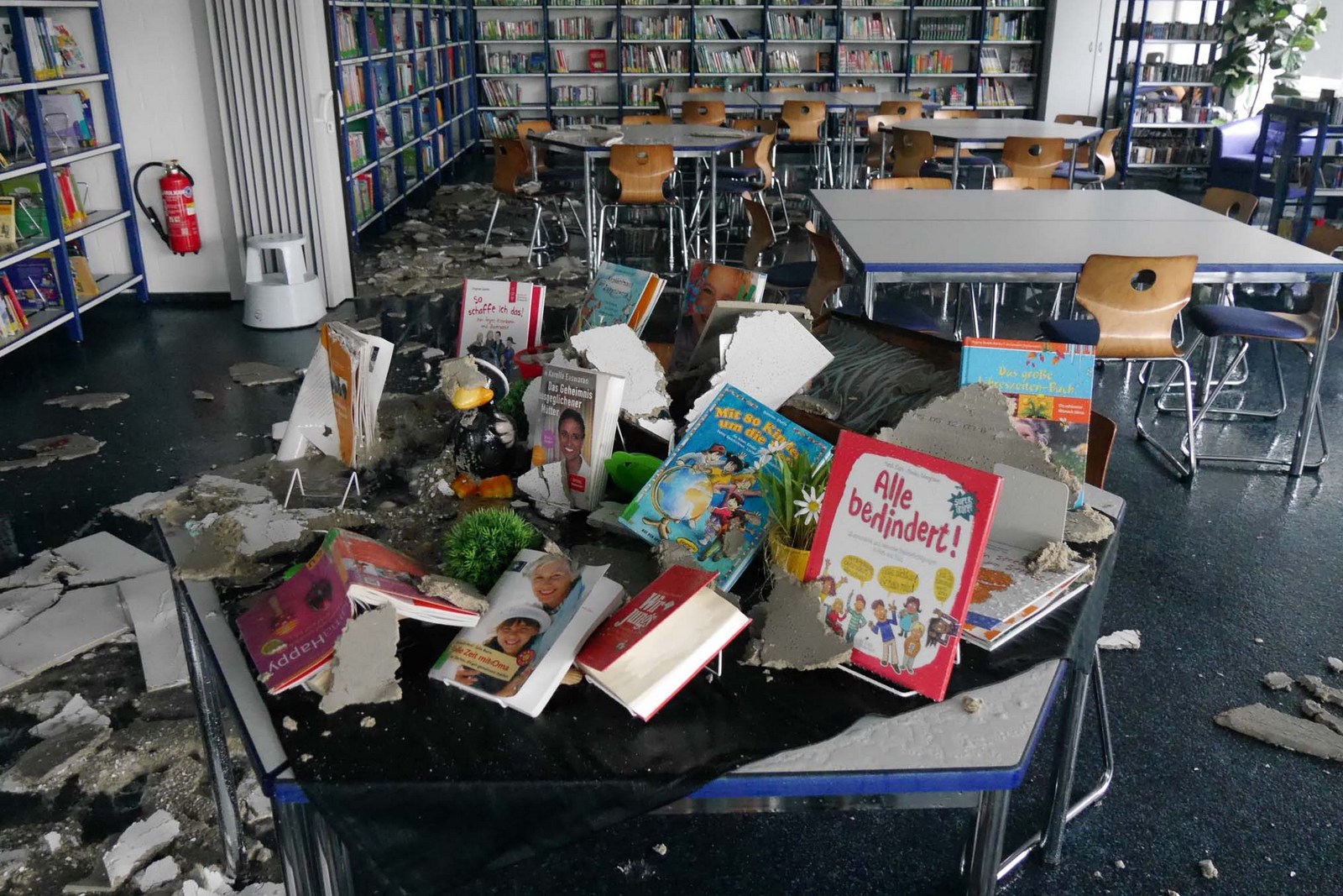 Besonders getroffen hat es die Mediathek der Gesamtschule im Kellergeschoss. In einem „Noteinsatz“ holten städtische Mitarbeiter die Bücher und elektronische Geräte aus dem Raum.
