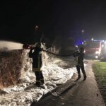 Während der Löscharbeiten regelten Feuerwehrleute den Verkehr am Kreisel. Abschließend wurde das gefrorene Löschwasser auf den Straßen mit Streusalz abgestreut und aufgetaut.