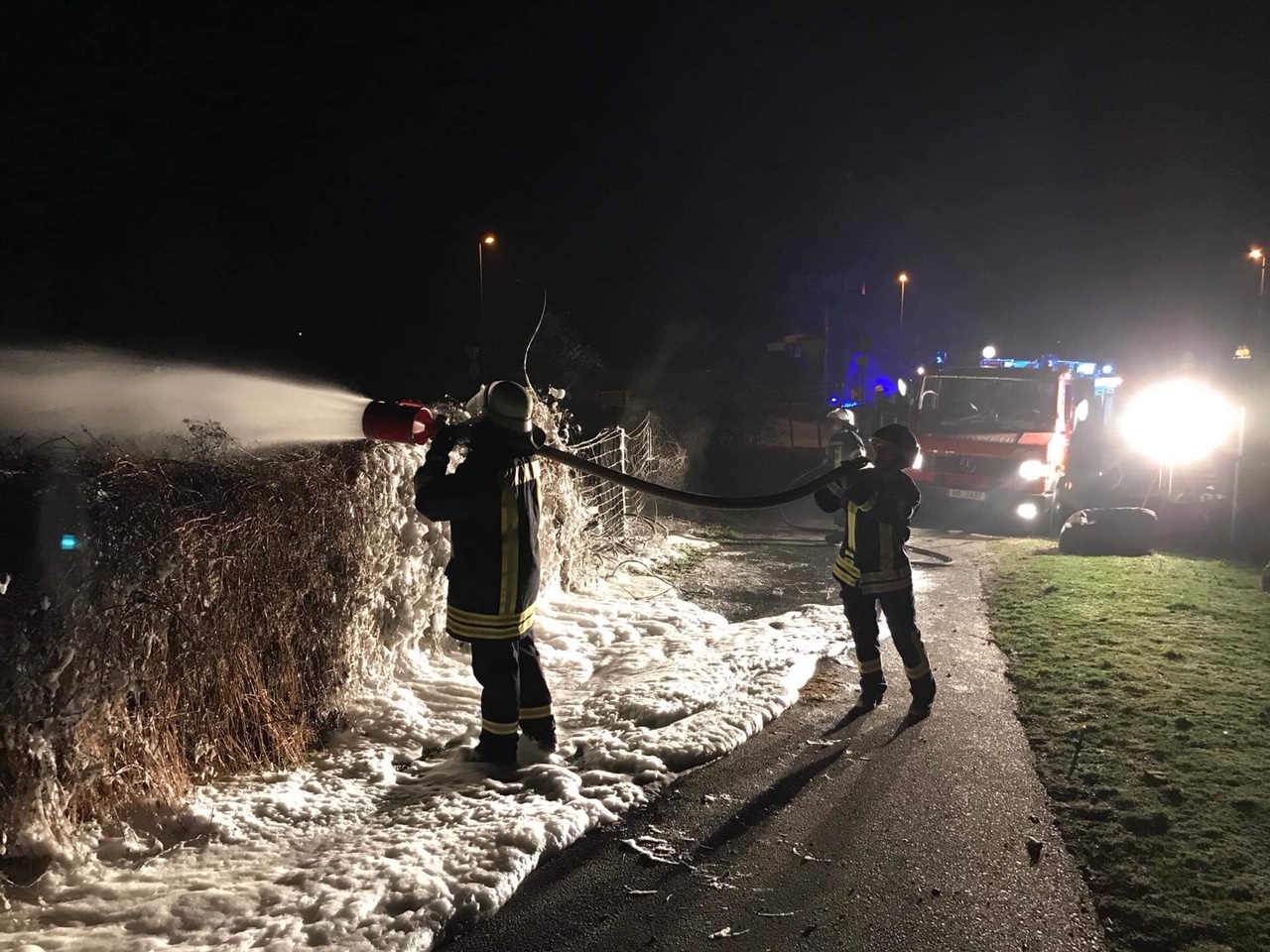 GUXHAGEN. Parallel zu dem Feuer auf einem Aussiedlerhof (wir berichteten) kam es in der Neujahrsnacht um kurz vor 01:00 Uhr in Guxhagen zu einem Brand am Wincheringer Platz in der Dörnhagener Straße . Auslöser dort war vermutlich ein Feuerwerkskörper, der eine Hecke von ca. 50 Quadratmetern entzündete.
