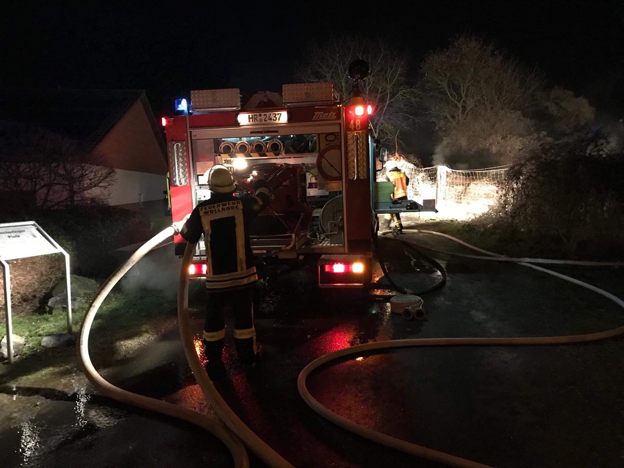 Da die Kameraden der Guxhagener Wehr beim Einsatz „Am Brunkelsberg“ gebunden waren, übernahm die Feuerwehr Wollrode das Löschen des Heckenbrandes.  Über die Schnellangriffseinrichtung war der Brand mit Wasser und Netzmittel schnell unter Kontrolle und abgelöscht.