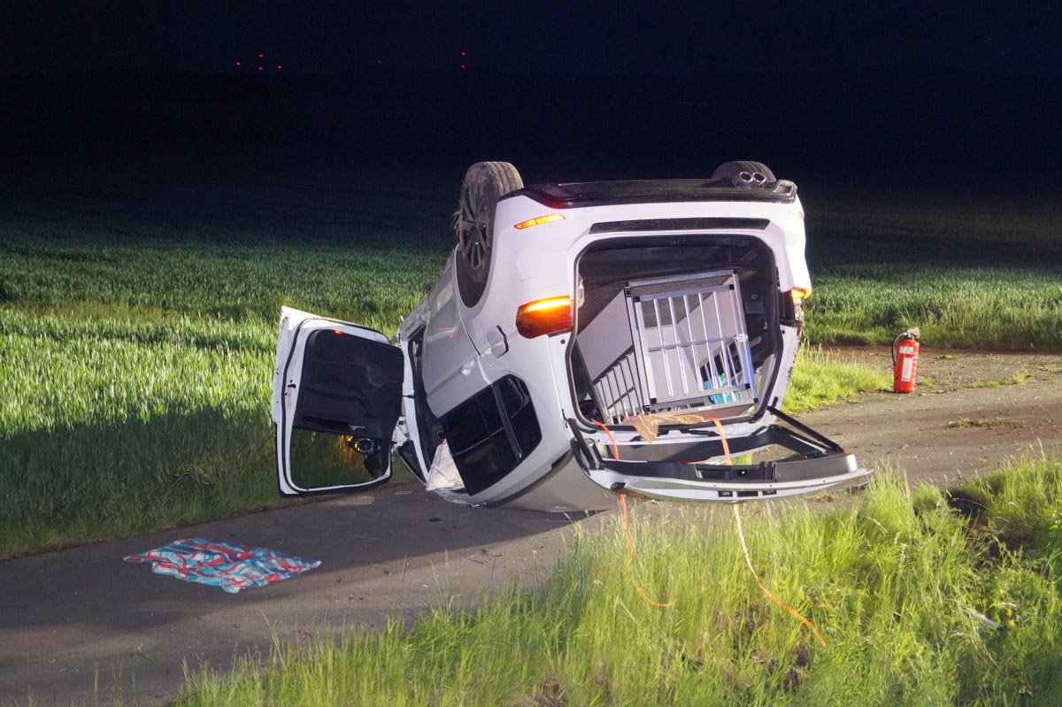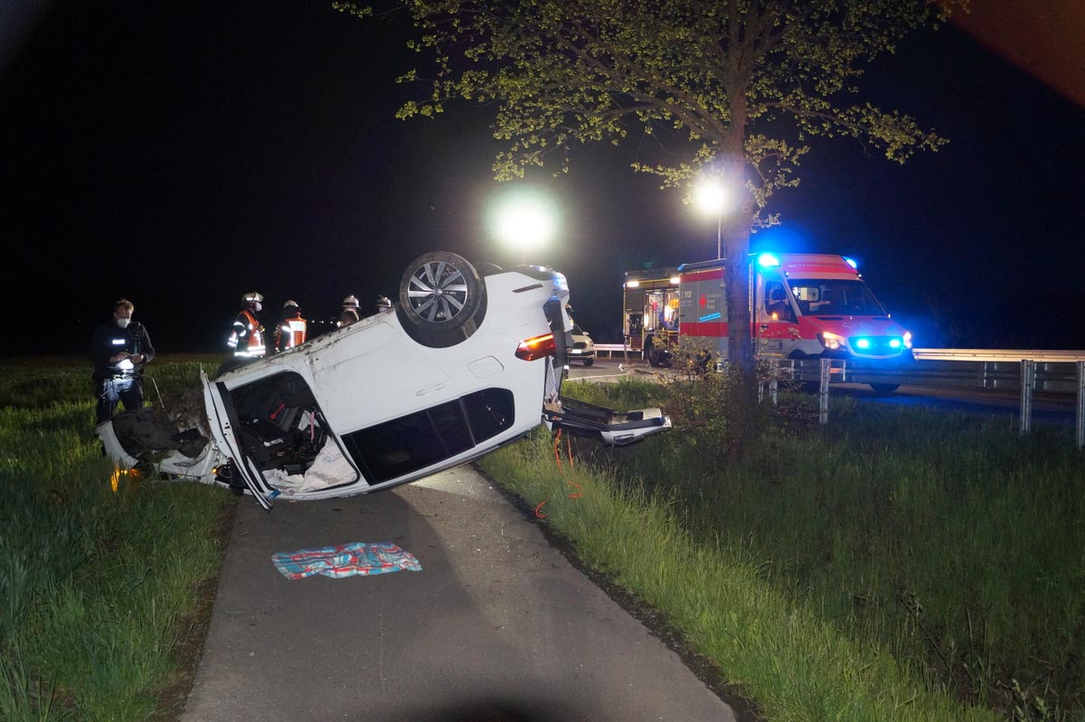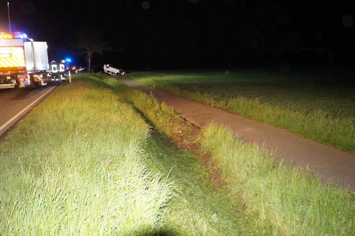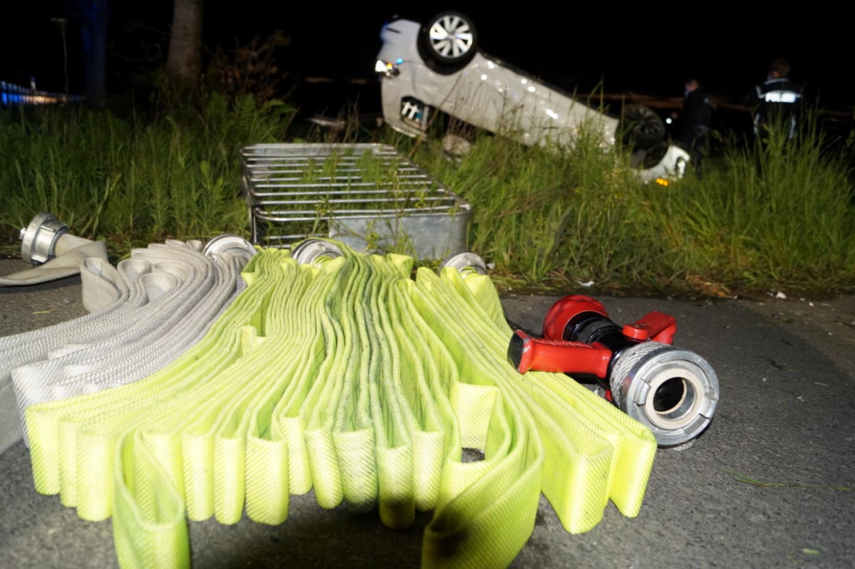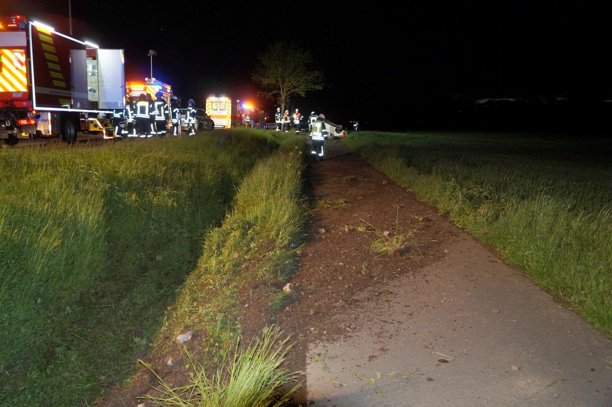 Augenscheinlich geriet der 59-Jährige nach rechts von der Landesstraße ab. Er überschlug sich dabei vermutlich in einem Abhang und kam wieder auf den Rädern zum Stehen. Anschließend schleuderte der Pkw weiter über den Radweg, prallte gegen die Böschung, riss sich das Vorderrad ab und überschlug sich erneut. Das Unfallwrack kam auf dem Radweg 1 auf dem Dach liegend zum Stillstand.