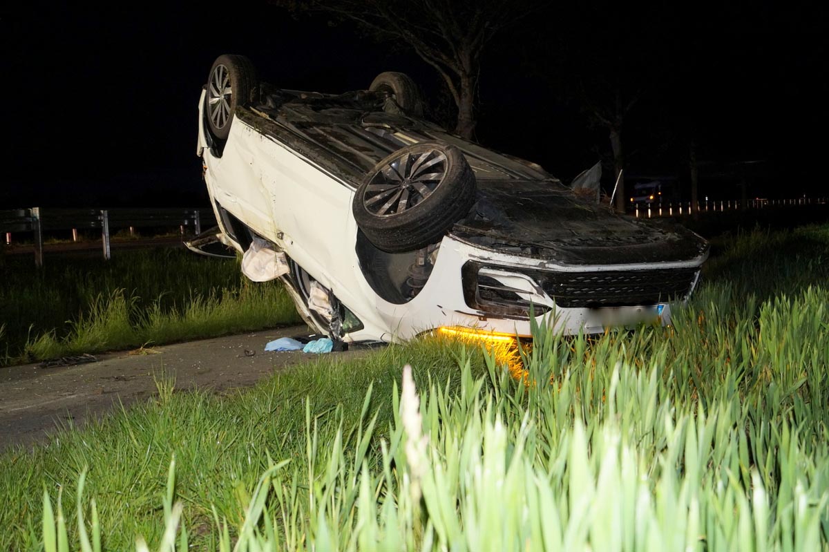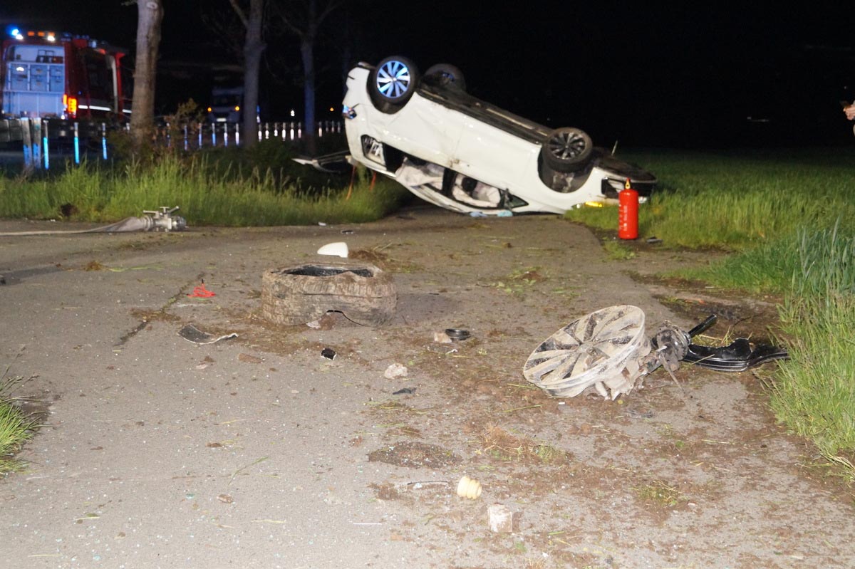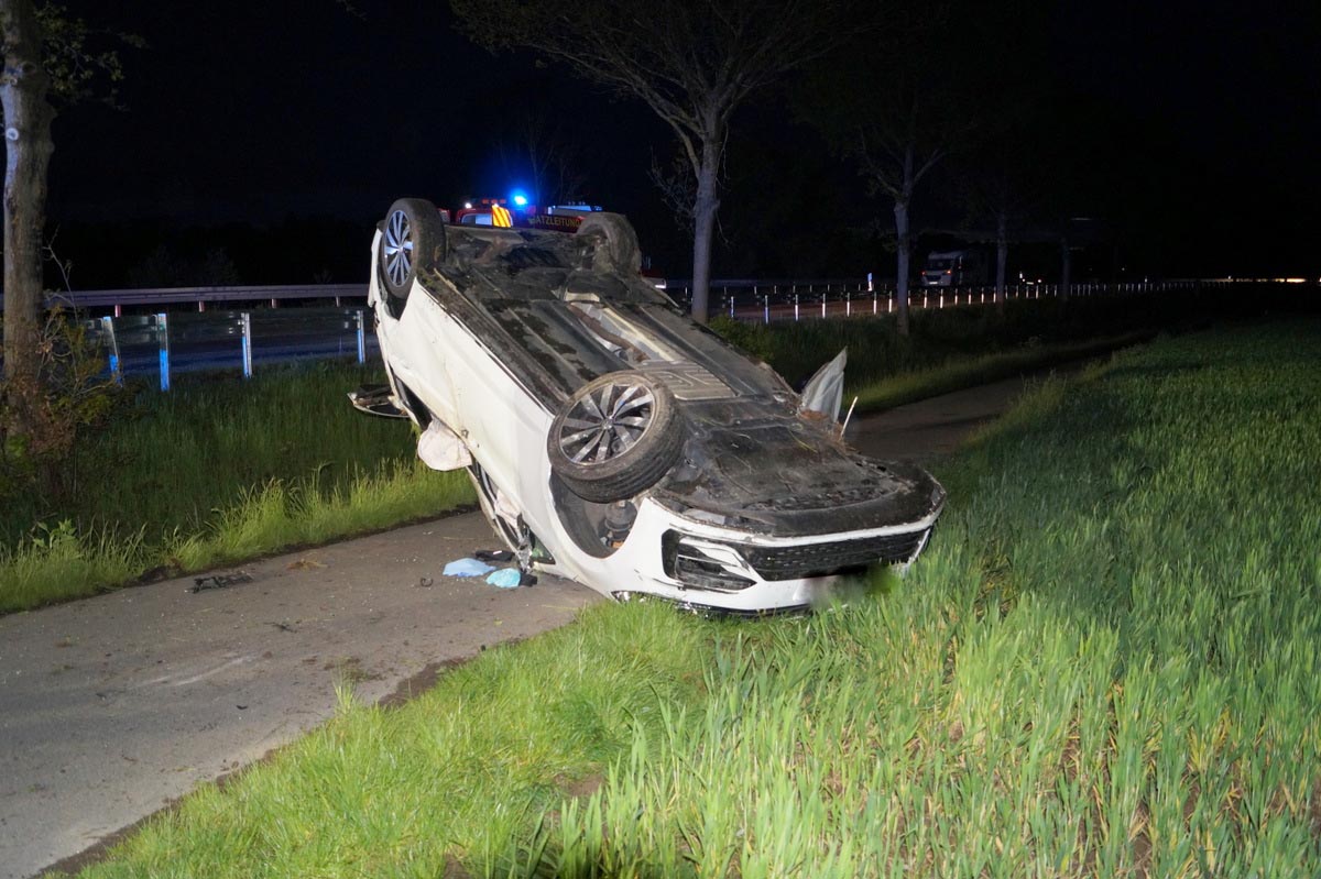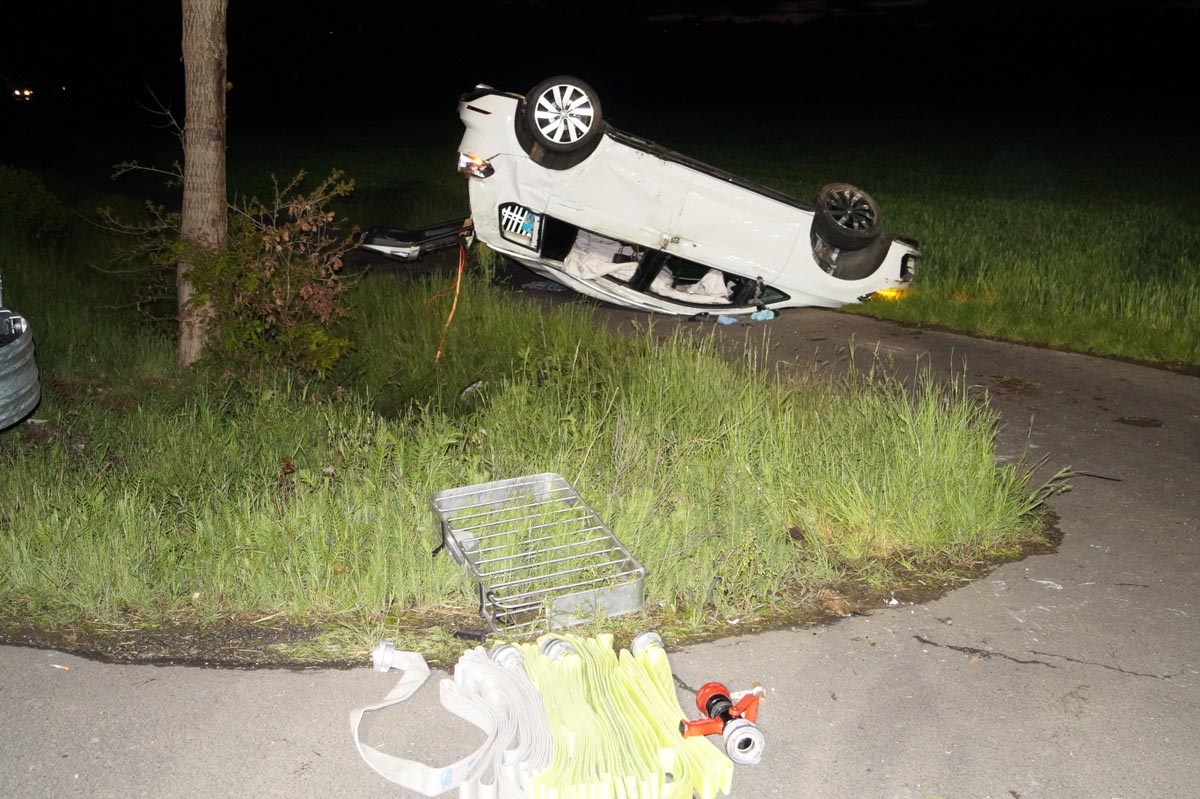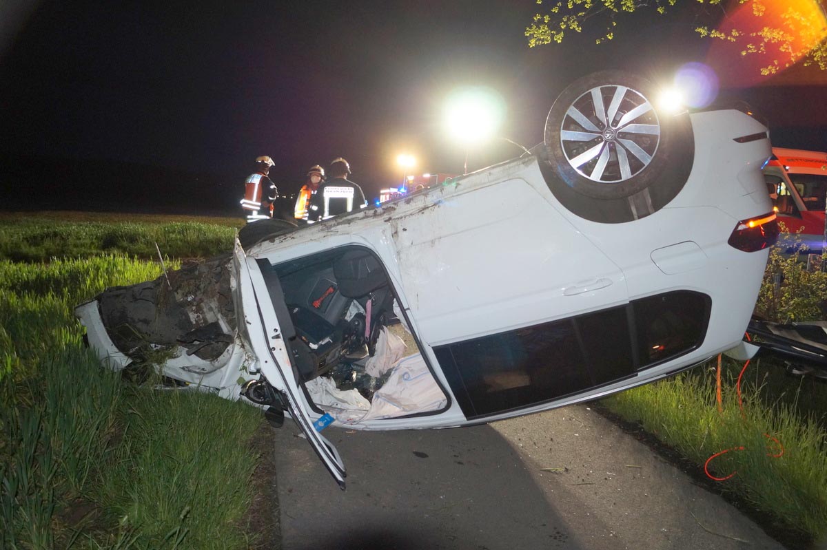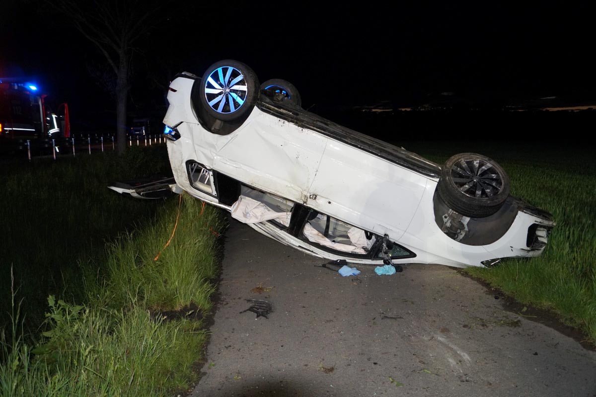 Augenscheinlich geriet der 59-Jährige nach rechts von der Landesstraße ab. Er überschlug sich dabei vermutlich in einem Abhang und kam wieder auf den Rädern zum Stehen. Anschließend schleuderte der Pkw weiter über den Radweg, prallte gegen die Böschung, riss sich das Vorderrad ab und überschlug sich erneut. Das Unfallwrack kam auf dem Radweg 1 auf dem Dach liegend zum Stillstand.