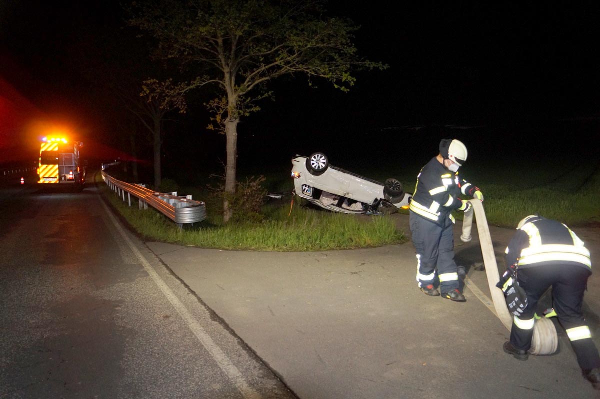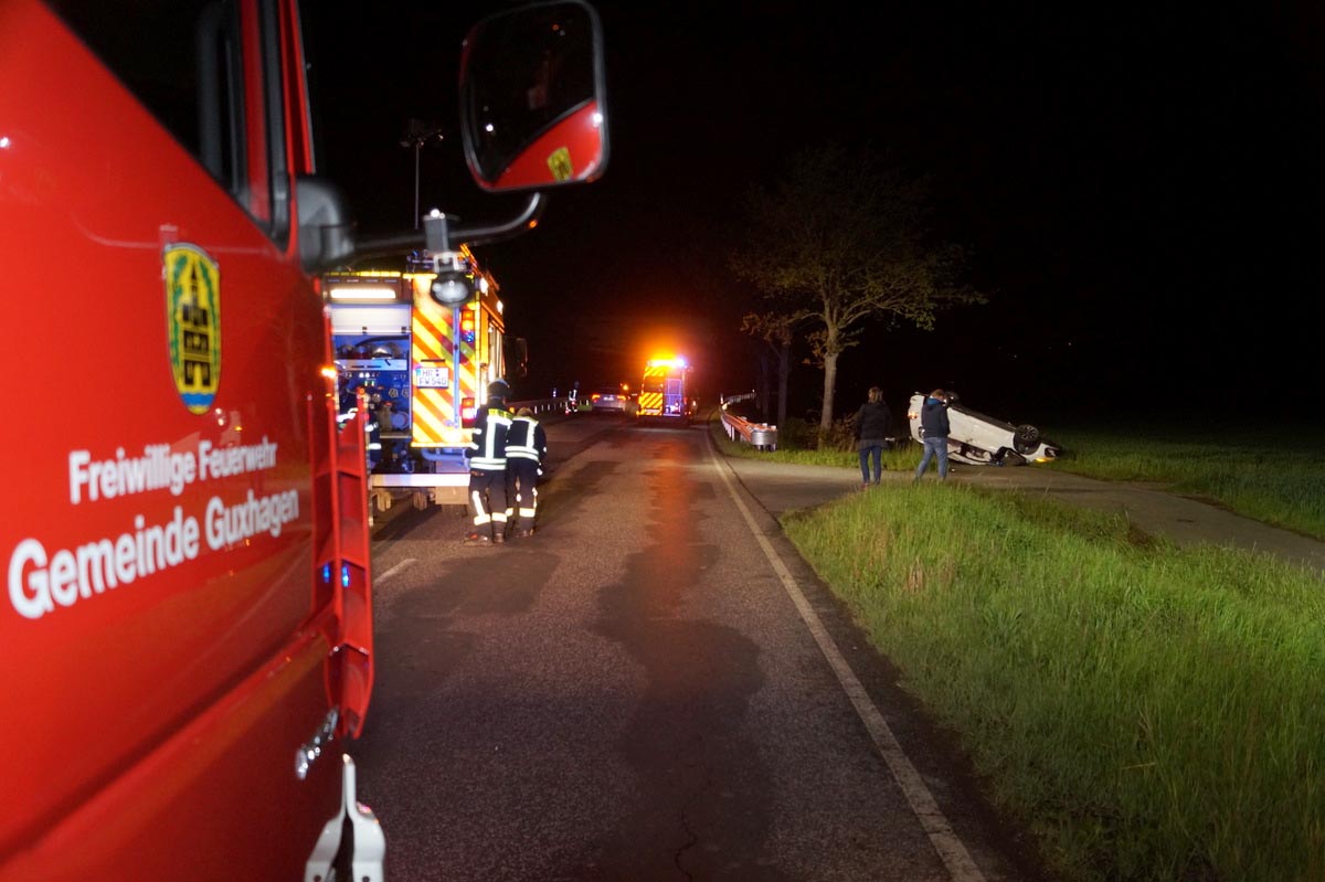 Der Guxhagener war zunächst in seinem auf dem Dach liegenden Pkw eingeschlossen, weswegen auch die Feuerwehr alarmiert wurde. Beim Eintreffen der Feuerwehr befand er sich aber nicht mehr im Fahrzeug.
