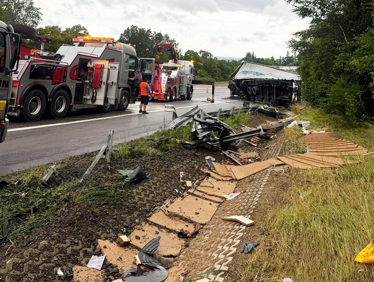 Gegen 16:40 Uhr verlor ein 46-jähriger Fahrer eines tschechischen Sattelzugs zwischen Melsungen und Guxhagen bei Starkregen die Kontrolle über sein Fahrzeug. Nach rechts von der Fahrbahn abgekommen, kippte der Auflieger beim Aufprall auf die Leitplanke auf die Seite. Ein kleiner Brand im Motorraum wurde rasch gelöscht, der Fahrer blieb unverletzt und befreite sich selbst. Der Sachschaden am Sattelzug beläuft sich auf etwa 100.000 EUR; hinzu kommen Schäden an Autobahneinrichtungen. Die A 7 blieb mehrere Stunden voll gesperrt, später einspurig passierbar. Ab Dienstagmorgen 5:36 Uhr rollt der Verkehr wieder zweispurig, der rechte Fahrstreifen bleibt jedoch bis zum Abschluss der Leitplanken-Reparatur gesperrt.