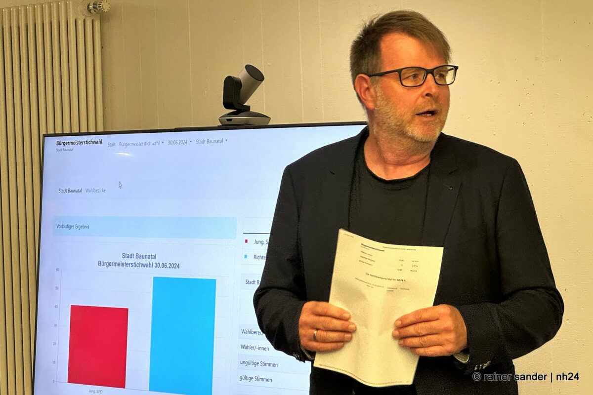 Heute schlossen die Wahllokale um 18 Uhr und nh24 hat an dieser Stelle die aktuellen Ergebnisse im Live-Ticker veröffentlicht. Kurz nach 19 Uhr verkündete Wahlleiter Hartmut Wicke das vorläufige amtliche Endergebnis: Neuer Bürgermeister der Stadt Baunatal ist danach Henry Richter. Er erreichte bei einer Wahlbeteiligung von 42,74 % insgesamt 58,46 % der Stimmen. Auf Daniel Jung entfielen 41,54 % der Stimmen. Interessant ist ein Blick auf die Verteilung der Wahlbeteiligung. In den Wahlbezirken am Baunsberg, dort, wo die „etablierten Parteien“ auch zuletzt bei der Europawahl die wenigsten Wähler hatten, fand die Bürgermeisterwahl praktisch gar nicht statt. Die Wahlbeteiligung lag hier zwischen 13 % und 14 %.