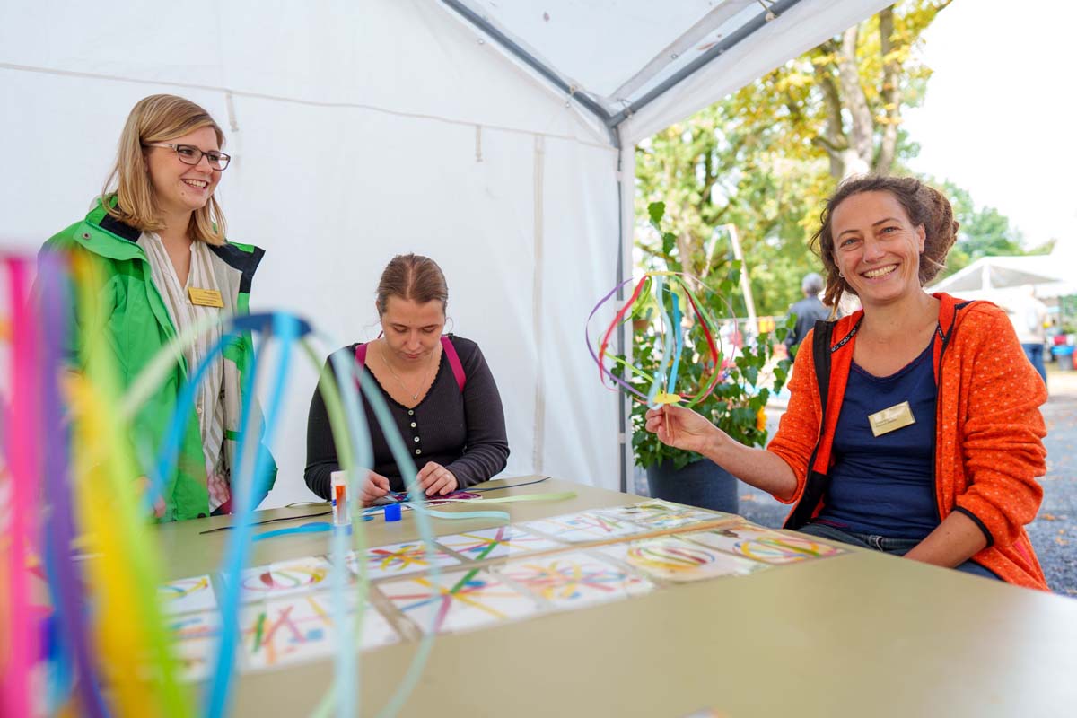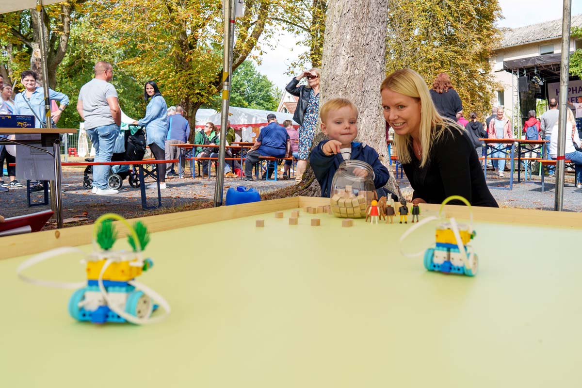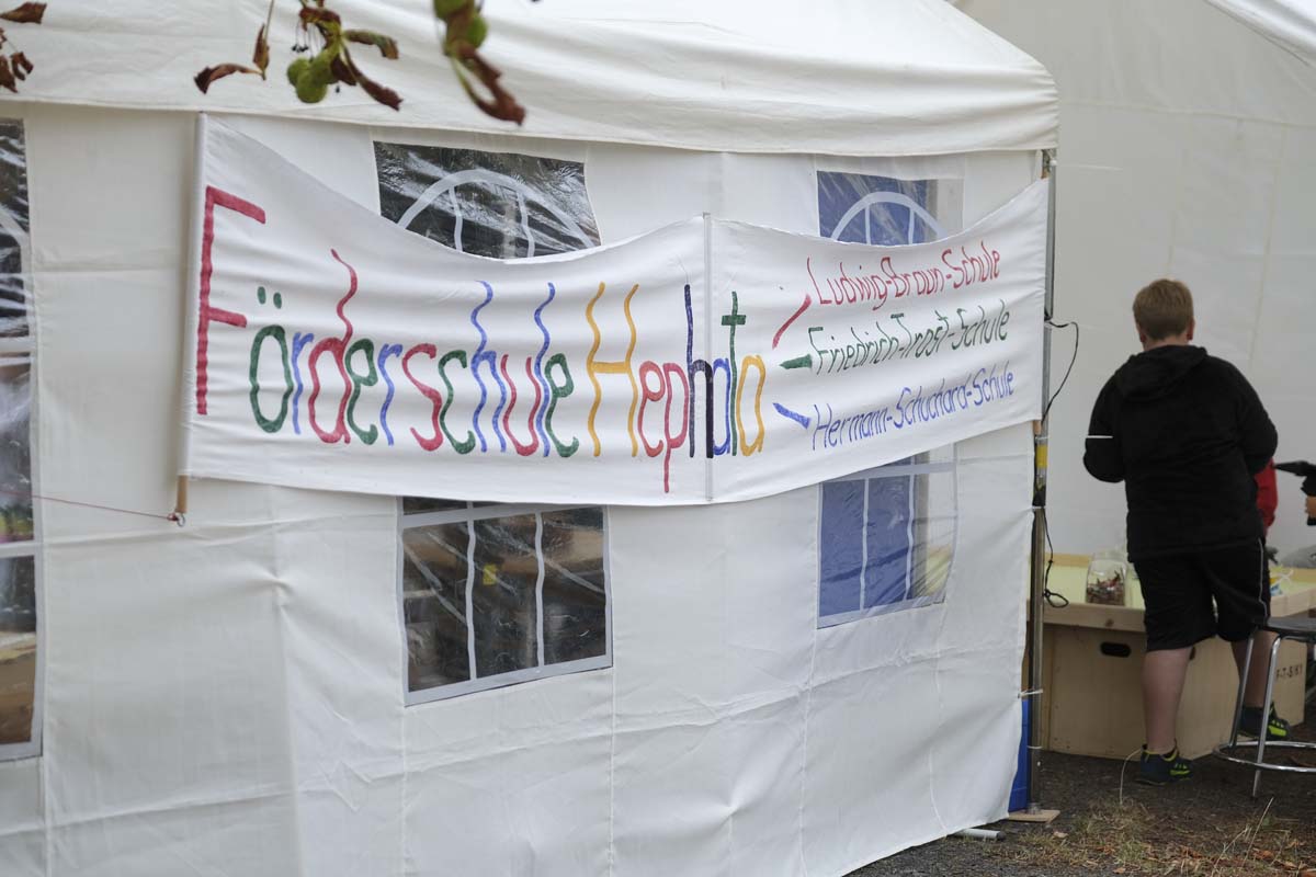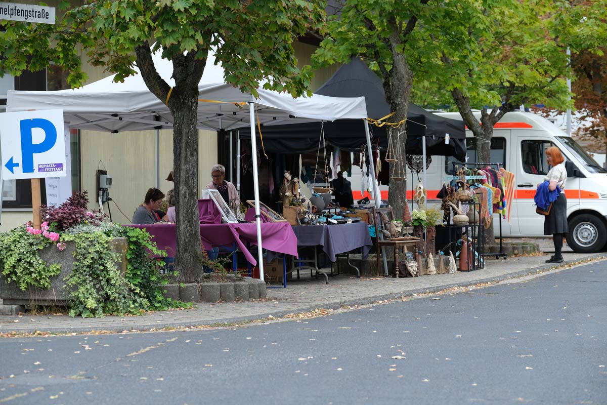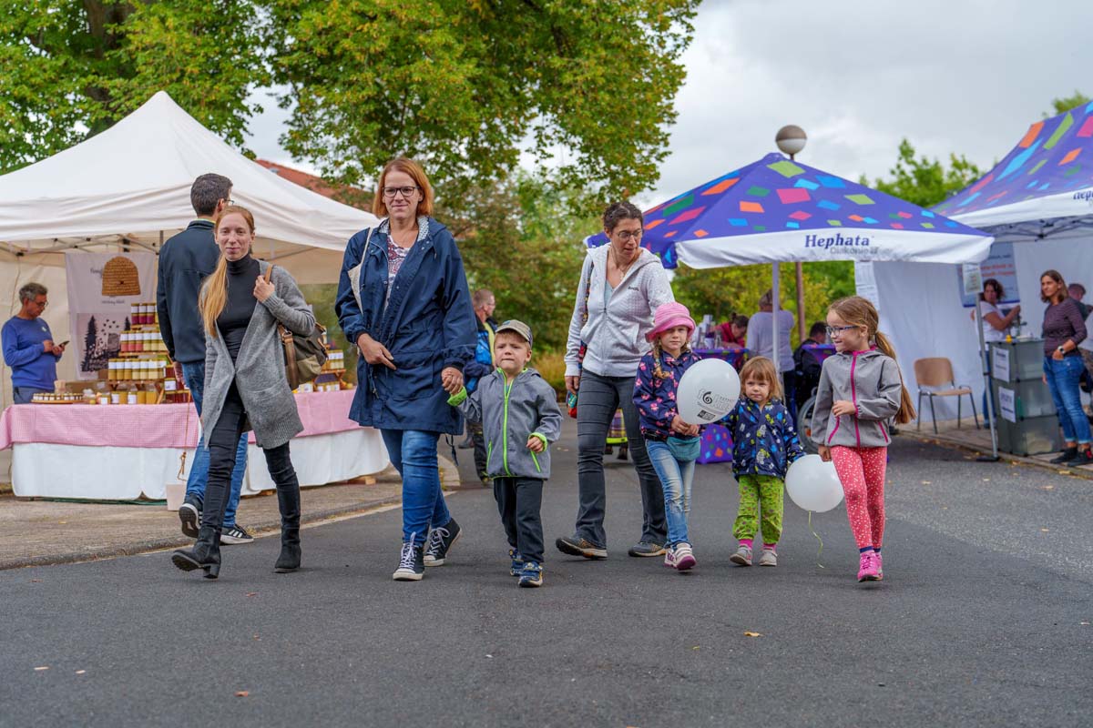 Noch mehr alte Bekannte, aber auch neue Gesichter, gab es auf der Festmeile mit ihren vielen Ständen und Mitmachangeboten. Von selbst genähter Kinderkleidung und selbst gemachtem Schmuck, über Keramik, Besen und Bürsten, Lampen, Dekoartikel und Tierbedarf, bis zu Honig und Süßigkeiten gab es viele Dinge zum Verschenken und Sich-Selbst-Beschenken. Hinzu kamen zahlreiche Essensstände mit Bratwurst & Co., Burgern, Kartoffelpuffern und -pfanne, Thai-Imbiss, Waffeln, Kaffee und Kuchen. Eine Hüpfburg, Kinderschminken, eine Kistenrutsche, Kistenklettern, Luftballontiere und Bastelangebote sorgten auch bei den kleinen Besucher für fröhliche Stimmung. Und natürlich durfte auch das Gewinnspiel der Hephata-Werkstätten für Menschen mit Behinderungen (WfbM) nicht fehlen, bei dem es zehn Preise aus der WfbM zu gewinnen gab: Hauptpreis war ein Hephata-Auto-Anhänger.