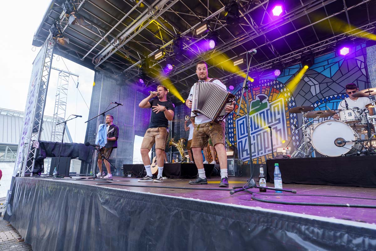 Neue Freunde der Festtage-Gemeinde wurden dann am Sonntagnachmittag die „D’Hundskrippln“ und „Schlagerpiloten“. Erste sind sechs Musiker um Frontmann Markus Peisker, die in Sneakers und Lederhosen mit Schlagzeug, Bass, Gitarre, Akkordeon, Tenorhorn und Posaunen sowie oberbayerischem Dialekt aufspielten. Rund 250 Gäste klatschen und hüpften zum alpenländischen Rock auf dem großen Festplatz. Neben schnellen Stücken wie „Quetschn“, „Kleiner Bauer“ und „Zeit“, ging es unter anderem bei „Mein bester Freund“ auch besinnlich zu.