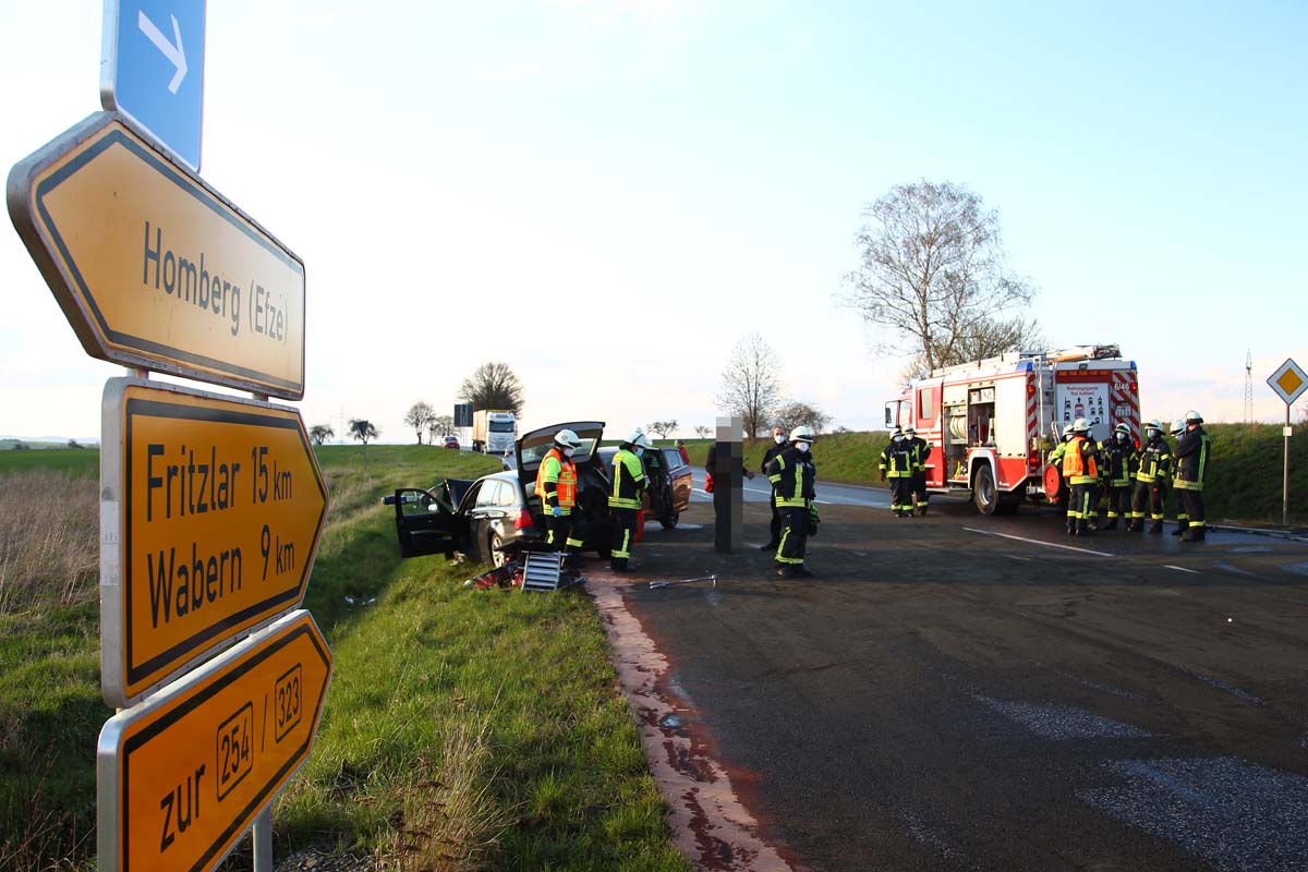 Die Feuerwehr Homberg wurde zu einem Verkehrsunfall mit „eingeklemmter Person“ alarmiert, was sich an der Unfallstelle nicht bestätigte. Bei Eintreffen der Helfer hatten alle Personen die Unfallfahrzeuge bereits verlassen.