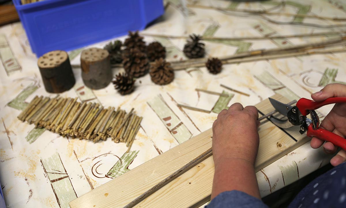 Bevor im Juli die Zwiebelsaison auf dem Zechenhof beginnt, hat sich eine Gruppe von Klienten den Bienenprojekten gewidmet. Beim Bau der kleinen Insektenhotels sind sie inzwischen ein eingespieltes Team: Manuela Helfrich schneidet Gras und Äste zu, Markus Breul bereitet weiteres Füllmaterial vor und Rolf Schmitt befüllt anschließend die Fächer. Für den „Rohbau“ der Insektenhotels wird Holz aus der Holzwerkstatt Fritzlar gekauft. „Das Projekt ist langfristig angelegt“, sagt Axel Horn und deutet auf ein im Bau befindliches Insektenhotel. „Der Inhalt kann ausgetauscht werden, wenn er verbraucht oder durch Verwitterung nicht mehr vollständig ist.“