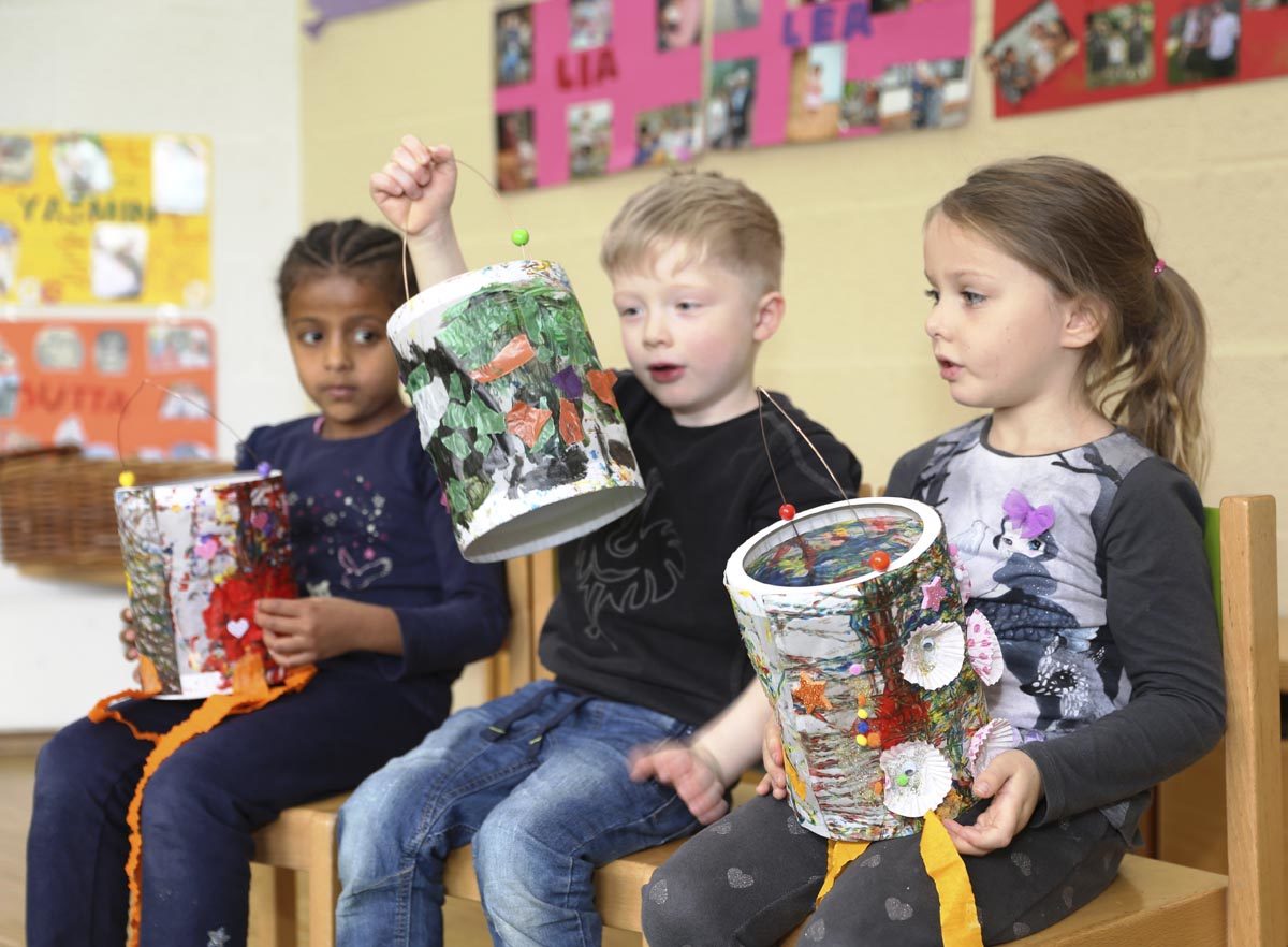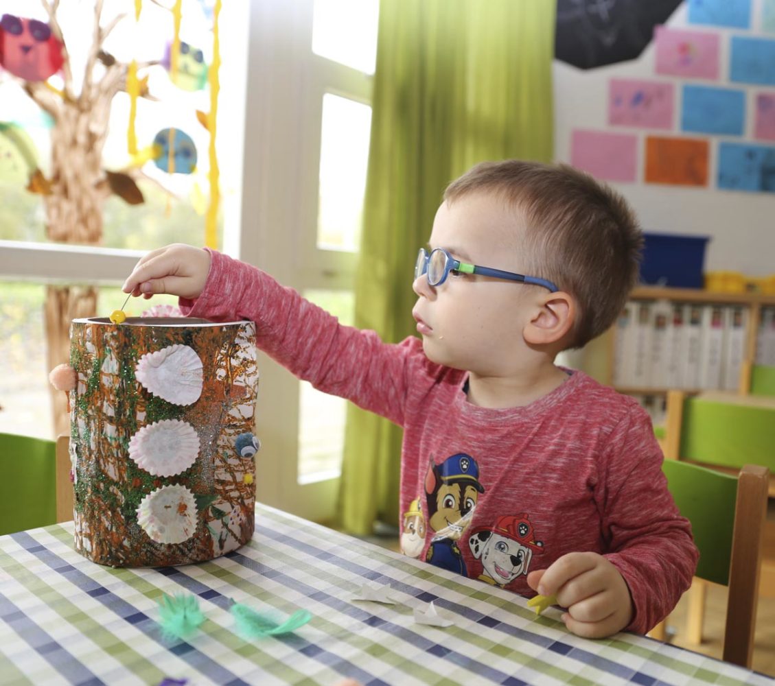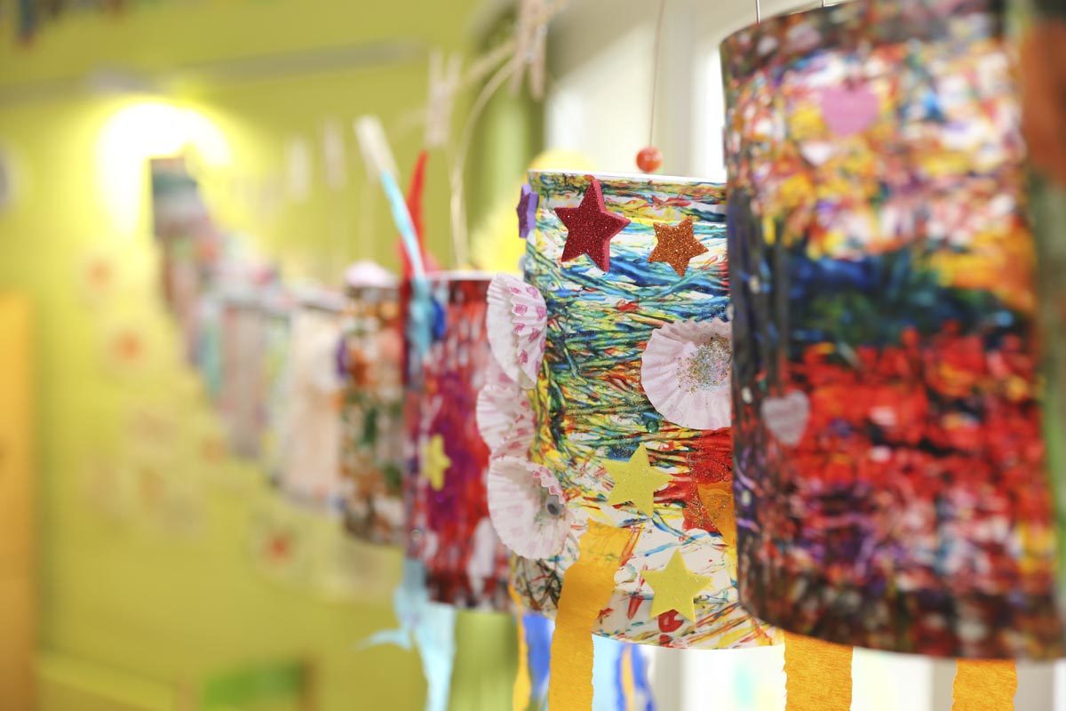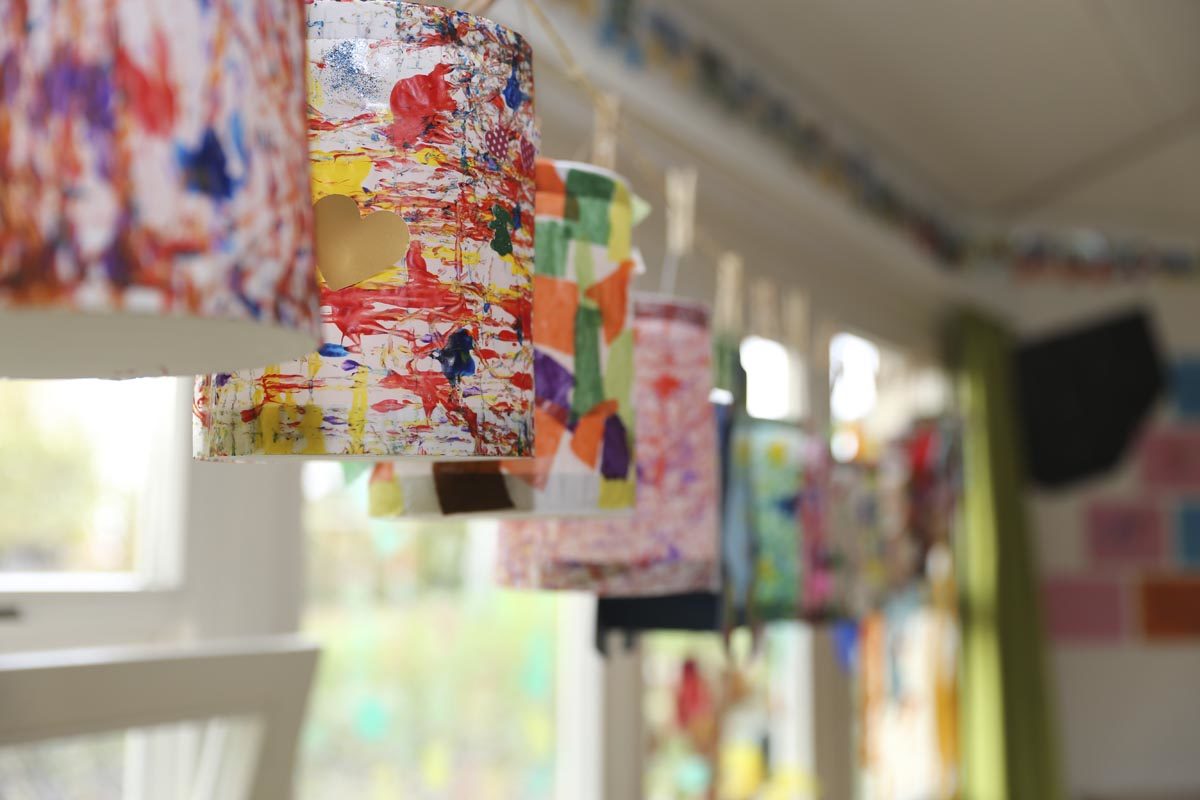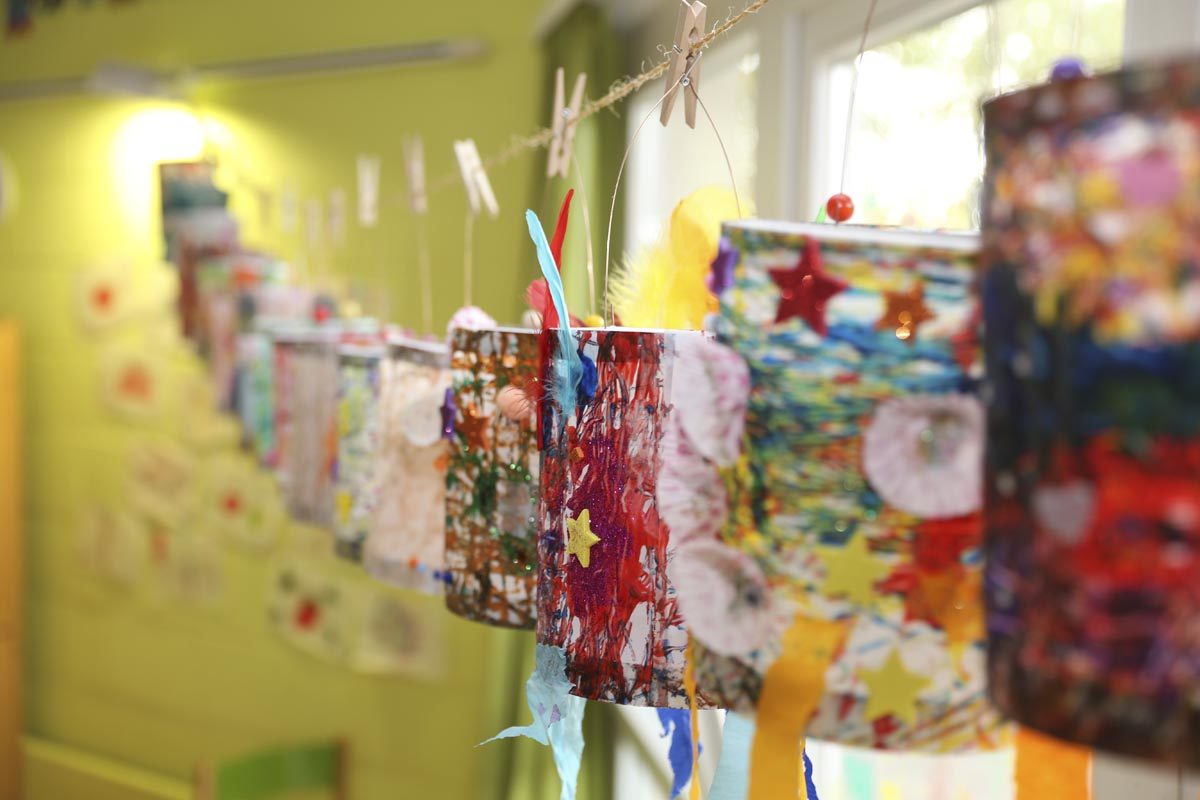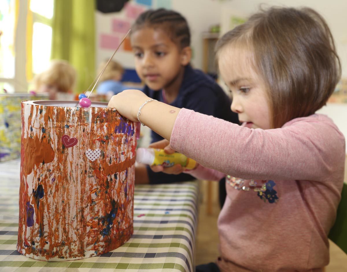 Doch noch sind nicht alle Laternen fertig. Auf den Basteltischen in der Kita liegen Bommeln, Sticker, Federn, Krepp-Papier, Glitzerpuder und Perlen zum Verzieren bereit. Die Laternenzuschnitte selbst haben die meisten Mädchen und Jungen mit der Murmeltechnik gestaltet. „Wir haben das Papier in eine Kiste gelegt, Farben drauf gemacht und Murmeln in die Kiste gelegt. Dann muss man nur noch hin und her schwingen“, erklärt Tessa (5). „Ich habe Farbe einfach so drauf gemacht und Papier drauf geklebt, dann leuchtet das Licht da durch“, sagt Ben (5).
