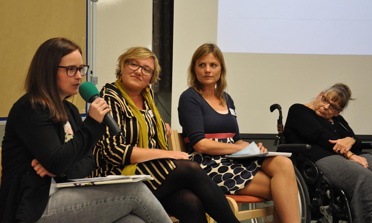 Experten-Gespräch in großer Runde zum Abschluss der Fachtagung (von links): Julia Grunewald-Discher (Schwalm-Eder-Kreis), Linda Kagerbauer (Stadt Frankfurt), Lena Rau (Stadt Marburg) und Naxina Wienstroer (Landesbehindertenbeirat). ©Foto: Hephata / nh