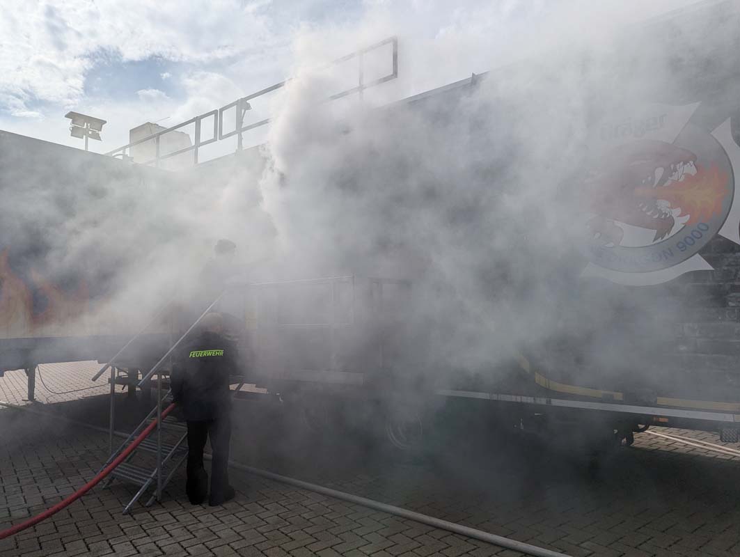 ALSFELD. Rauch und dichter Nebel machen die Sicht nahezu unmöglich. Im oberen Bereich des Raums herrschen Temperaturen von 650 Grad Celsius, in einem Meter Höhe sind es noch 260 Grad.