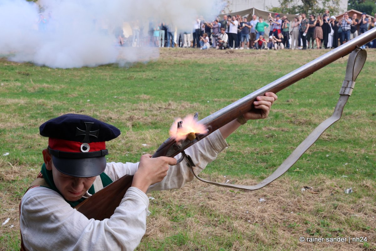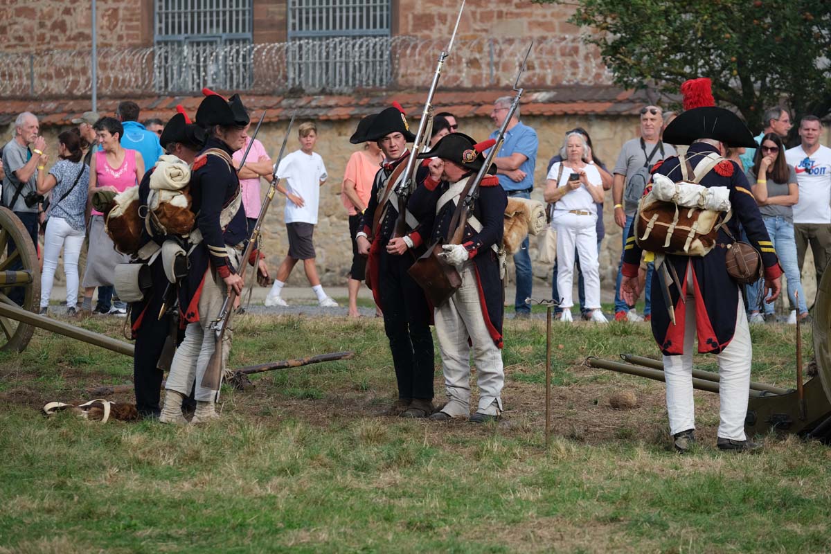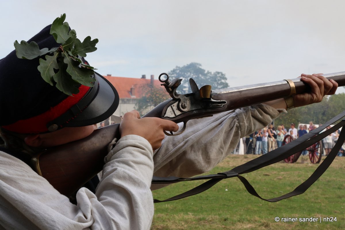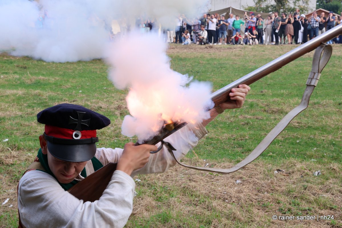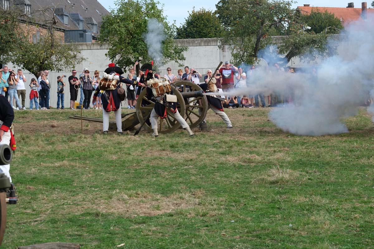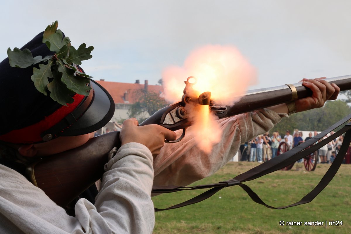 Echte Kugeln wurden in der eigentlichen Waffenverbotszone rund um die JVA selbstverständlich nicht abgeschossen. Trotzdem wurden auch die Vorderlader der Soldaten mit Zündhütchen und Schwarzpulver geladen. Die Mündungsfeuer waren beeindruckend, die Geräuschkulisse respekteinflößend und die Darstellung sehenswert. Verletzt wurde niemand, auch die gefallenen Soldaten durften beim Schlussappell zum Ausklang auf dem Paradeplatz wieder mitspielen.