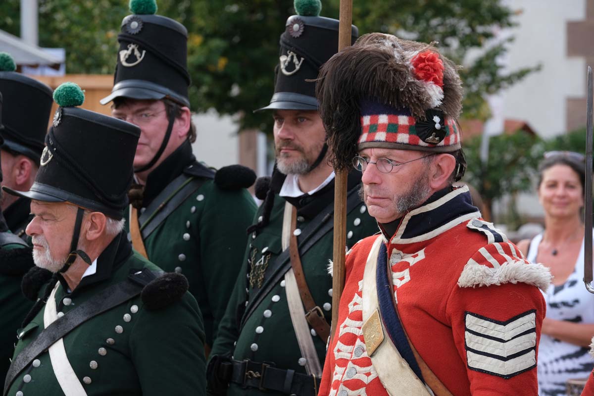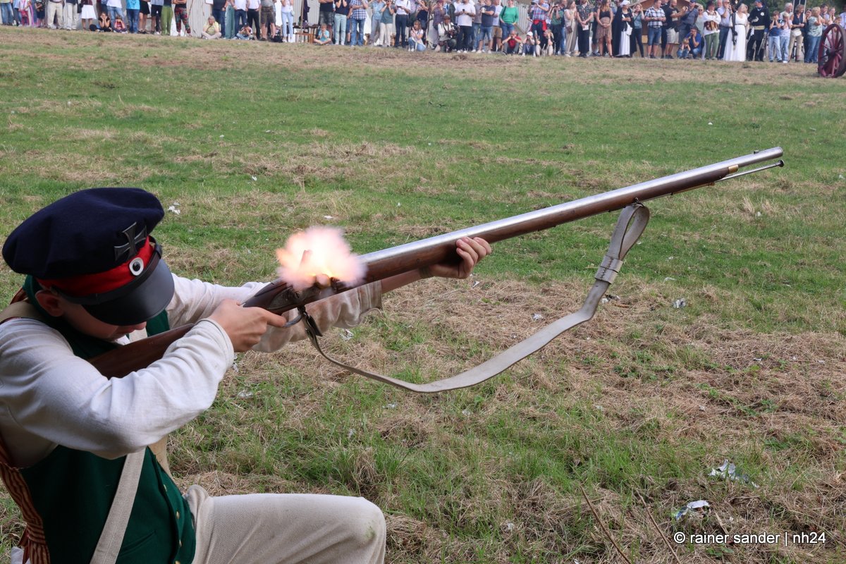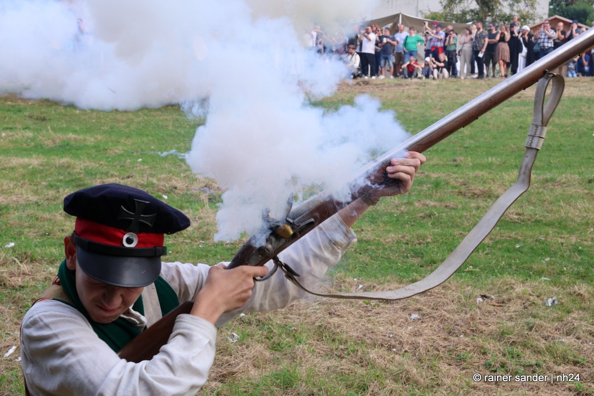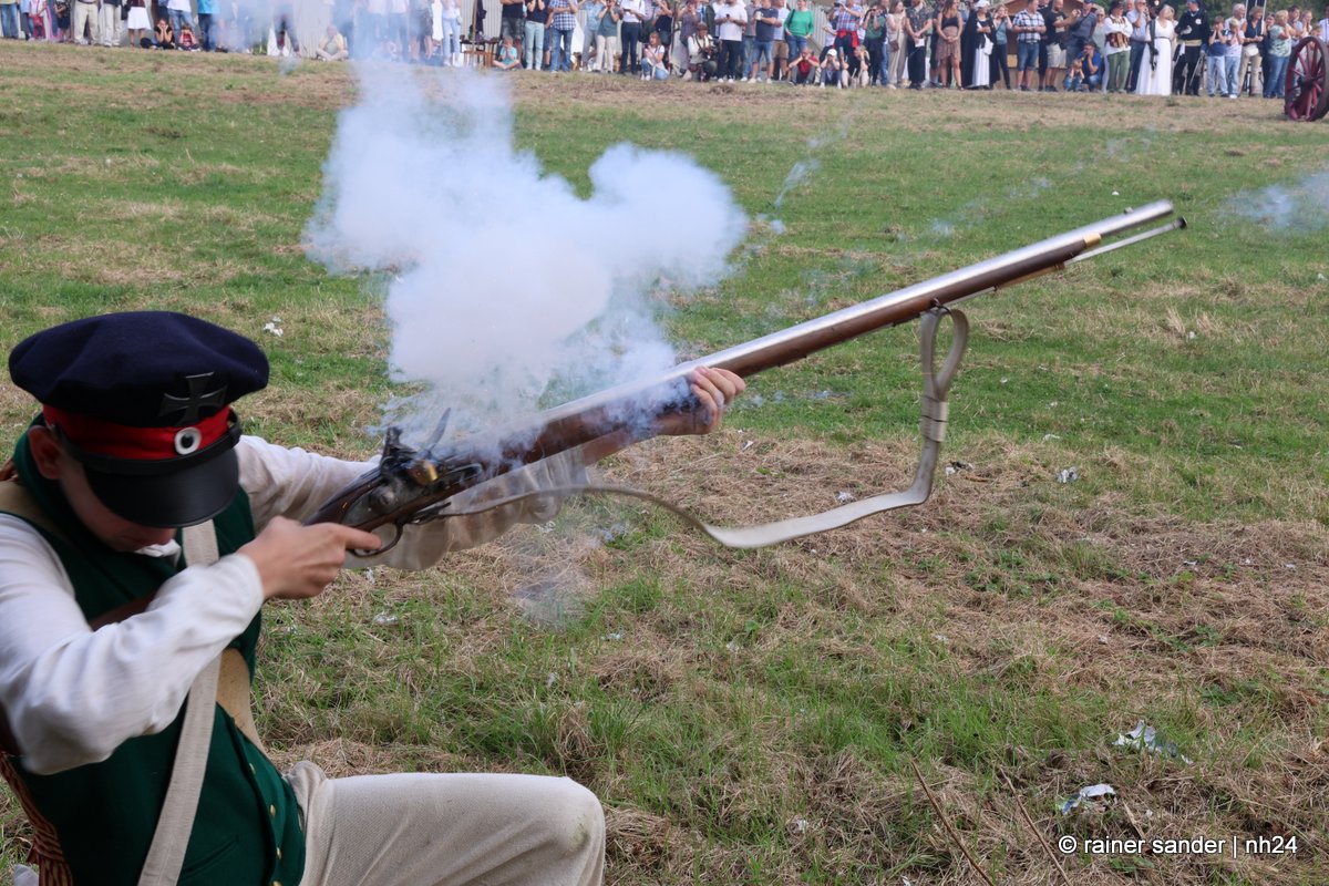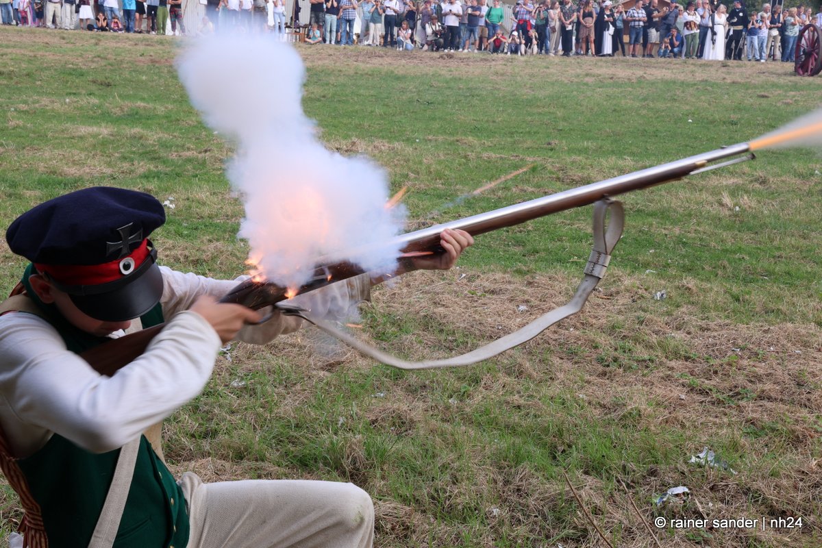 Echte Kugeln wurden in der eigentlichen Waffenverbotszone rund um die JVA selbstverständlich nicht abgeschossen. Trotzdem wurden auch die Vorderlader der Soldaten mit Zündhütchen und Schwarzpulver geladen. Die Mündungsfeuer waren beeindruckend, die Geräuschkulisse respekteinflößend und die Darstellung sehenswert. Verletzt wurde niemand, auch die gefallenen Soldaten durften beim Schlussappell zum Ausklang auf dem Paradeplatz wieder mitspielen.