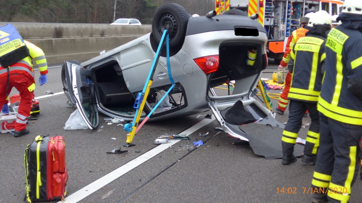 Während der Fahrer das Fahrzeug selbstständig und leicht verletzt verlassen konnte wurde die Beifahrerin schwer verletzt, jedoch nicht eingeklemmt.  Eine zufällig vorbeikommende Rettungswagenbesatzung aus dem Landkreis Hersfeld-Rotenburg übernahm bis zum Eintreffen der Rettungskräfte aus Kassel die Erstversorgung der Frau.