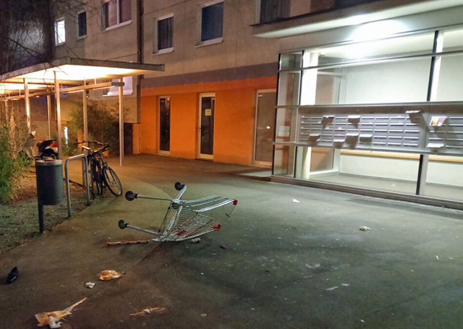 Wie eine Polizeisprecherin berichtet, wurde der Einkaufswagen augenscheinlich von einem „offenen“ Balkon im 14. Stock geworfen, der vom Treppenhaus des Hochhauses frei zugänglich ist und nicht zu einer Wohnung gehört. Zeugen hatten gesehen, wie der Wagen vor dem Eingang des Hauses aufschlug und Funken gesprüht hatte. Nur wenig später sollen vier männliche Jugendliche eilig aus dem Haus gestürmt sein, die dann in Richtung Universität flüchteten. Die vierköpfige Gruppe trug dunkle Kleidung, teilweise vom Hersteller Adidas. Zwei von ihnen sollen hellhäutig gewesen sein, die beiden anderen Jugendlichen hatten einen dunkleren Teint, so die Zeugen. Den zerstörten Einkaufswagen des Supermarktes Norma stellten die Polizei sicher. Ob die Täter den Wagen von draußen mitbrachten oder dieser bereits im Haus gestanden hatte, ist nun Gegenstand der weiteren Ermittlungen.