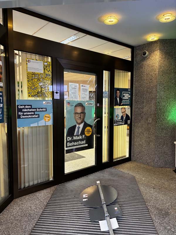 Die CDU-Kreisvorsitzenden Michael Aufenanger und Maximilian Bathon verurteilten die Tat als „beispiellose Grenzüberschreitung“. Die Partei hat Anzeige erstattet und setzt eine Belohnung von 500 EUR für Hinweise aus, die zur Ermittlung der Täter führen. Zeugen werden gebeten, sich bei der Polizei zu melden.