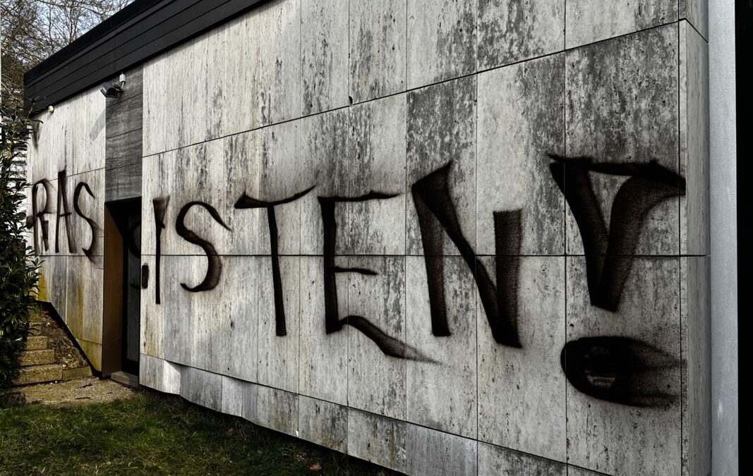 KASSEL. Unbekannte haben in der Nacht zum Montag, 10. Februar, das Dr.-Walter-Lübcke-Haus in Kassel beschädigt. Mit einer Eisenstange wurde die Glaseingangstür zerstört, eine Überwachungskamera und Außenwände mit schwarzer Farbe besprüht. Zudem wurde das Wort „Rassisten“ an die Fassade gesprüht.