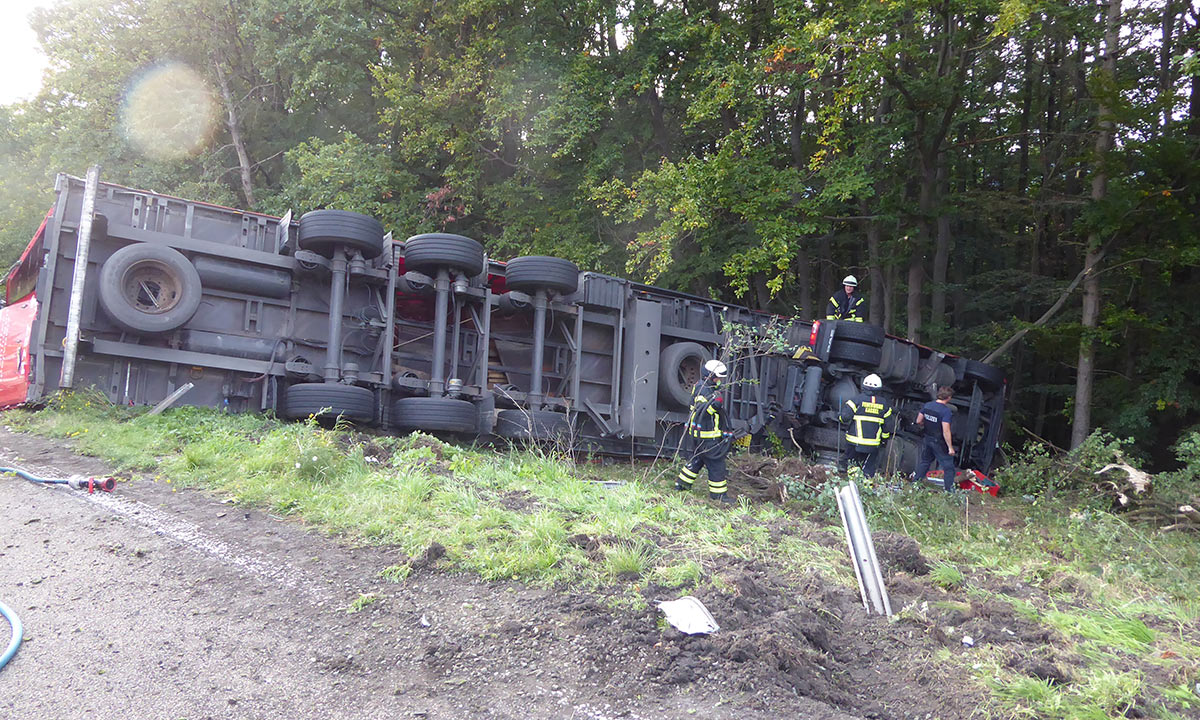 KASSEL/GUXHAGEN. Auf der A 7 zwischen dem Dreieck Kassel Süd und Guxhagen kollidierten am Samstag gegen 16:45 Uhr ein Lkw und ein Pkw. Der Sattelzug durchbrach die Leitplanke, kippte auf die linke Seite und kam abseits der Autobahn zum Stillstand. Aus den Tanks des Lkw flossen mehrere Hundert Liter Diesel ins Erdreich. Kasseler Feuerwehrleute, unter der Leitung von Michael Koch, pumpten weiter ca. 400 Liter Kraftstoff aus den Tanks der Sattelzugmaschine. Ein Entstehungsbrand im Pkw konnte von Ersthelfern noch vor dem Eintreffen der Feuerwehr gelöscht werden. Bei dem Unfall wurden zwei Personen verletzt.